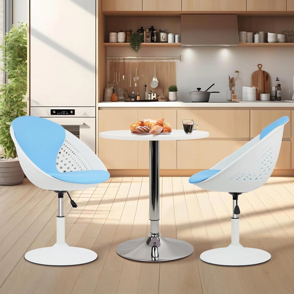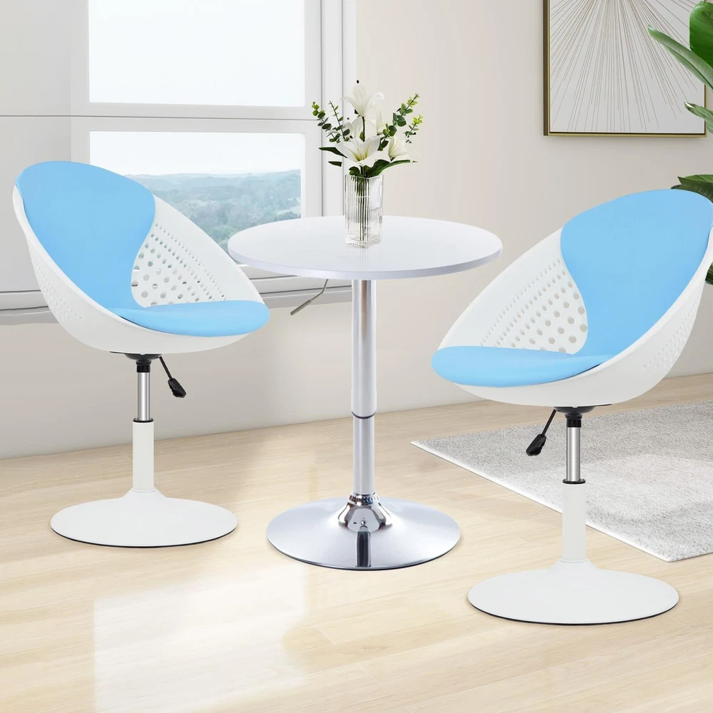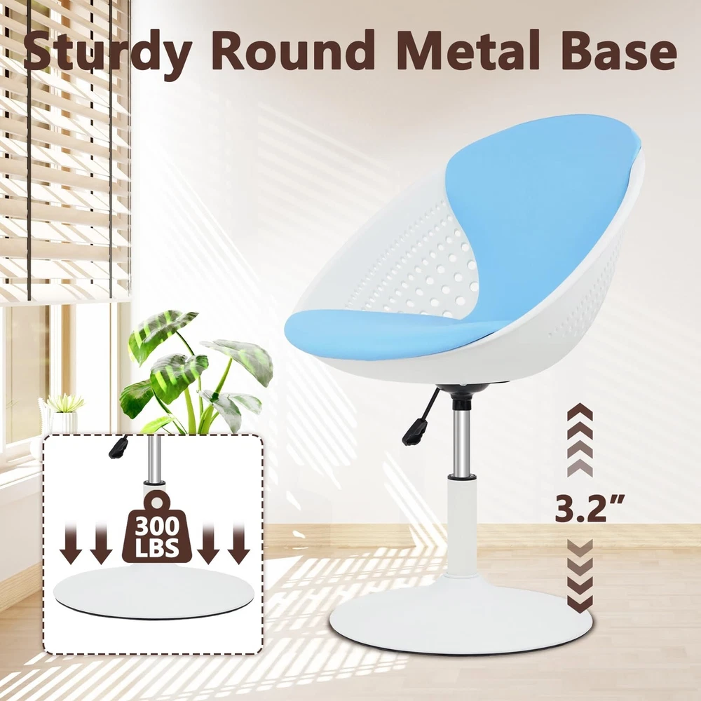 Product Description: CLATINA Adjustable Height 360° Swivel Waiting Chairs with Round Metal Base, Leather Comfy Cushion Egg-Shaped Lounge Side Chair for Guest Reception Living Balcony Dressing Dining, White, Set of 2 Specification: Brand: KLASIKA Color: Blue White Back: Continuous Back Material: Polypropylene , Metal Room Type: Office, Bedroom Indoor/Outdoor Usage:Indoor Product Dimensions: 17.32"D x 18.11"W x 34.25"H About this item : 【360° Swivel&Height Adjust】: Still looking for a height adjustable waiting chair? This CLATINA waiting room chairs provide flexible height adjustment and smooth 360° rotation to meet different user needs, whether in the office or at home. Sturdy&Durable】: Our swivel guest chairs feature a heavy duty round metal base and durable PP plastic frame. These reception chairs offer enhanced stability and support, making them ideal office chair no wheels for high-traffic areas. Built to last in busy environments. 【Comfortable&Breathable】: Our white and blue vanity chairs features a PVC leather cushion filled with high-density sponge. These leather waiting chairs have side ventilation holes for air circulation, ensuring comfort during extended use. Perfect for waiting rooms or workspaces where long-term seating is required. 【Versatile&Stylish】: Our lobby chairs blend modern design and comfort. These comfortable accent chairs feature a sleek wrap-around backrest and an egg-shaped seat that adds sophistication to any space. Perfect as a side chair in your living room or as a stylish office chair, they effortlessly match a variety of furniture styles. 【Easy&Comprehensive】: Our adjustable desk chair no wheels assembles easily, ideal for busy executives, reception rooms, offices, bedroom, clinics, business, dining, conference, balcony, libraries and remote workers. Perfect as lobby chairs, papasan chair or waiting room seating. A versatile solution for any environment.