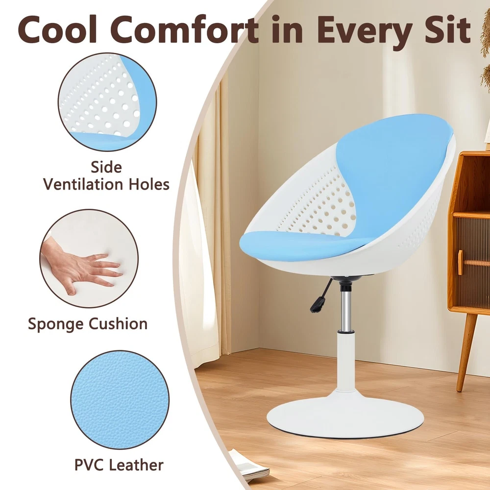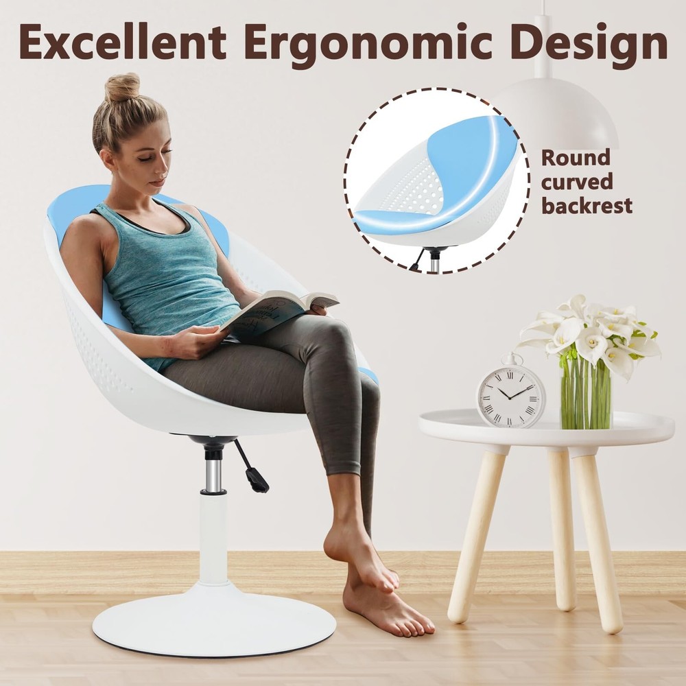 Product Description: CLATINA Adjustable Height 360° Swivel Waiting Chairs with Round Metal Base, Leather Comfy Cushion Egg-Shaped Lounge Side Chair for Guest Reception Living Balcony Dressing Dining, White, Set of 2 Specification: Brand: KLASIKA Color: Blue White Back: Continuous Back Material: Polypropylene , Metal Room Type: Office, Bedroom Indoor/Outdoor Usage:Indoor Product Dimensions: 17.32"D x 18.11"W x 34.25"H About this item : 【360° Swivel&Height Adjust】: Still looking for a height adjustable waiting chair? This CLATINA waiting room chairs provide flexible height adjustment and smooth 360° rotation to meet different user needs, whether in the office or at home. Sturdy&Durable】: Our swivel guest chairs feature a heavy duty round metal base and durable PP plastic frame. These reception chairs offer enhanced stability and support, making them ideal office chair no wheels for high-traffic areas. Built to last in busy environments. 【Comfortable&Breathable】: Our white and blue vanity chairs features a PVC leather cushion filled with high-density sponge. These leather waiting chairs have side ventilation holes for air circulation, ensuring comfort during extended use. Perfect for waiting rooms or workspaces where long-term seating is required. 【Versatile&Stylish】: Our lobby chairs blend modern design and comfort. These comfortable accent chairs feature a sleek wrap-around backrest and an egg-shaped seat that adds sophistication to any space. Perfect as a side chair in your living room or as a stylish office chair, they effortlessly match a variety of furniture styles. 【Easy&Comprehensive】: Our adjustable desk chair no wheels assembles easily, ideal for busy executives, reception rooms, offices, bedroom, clinics, business, dining, conference, balcony, libraries and remote workers. Perfect as lobby chairs, papasan chair or waiting room seating. A versatile solution for any environment.