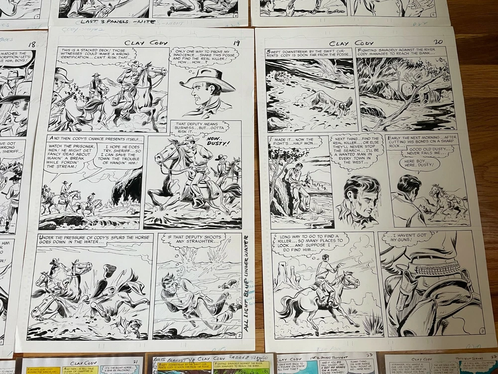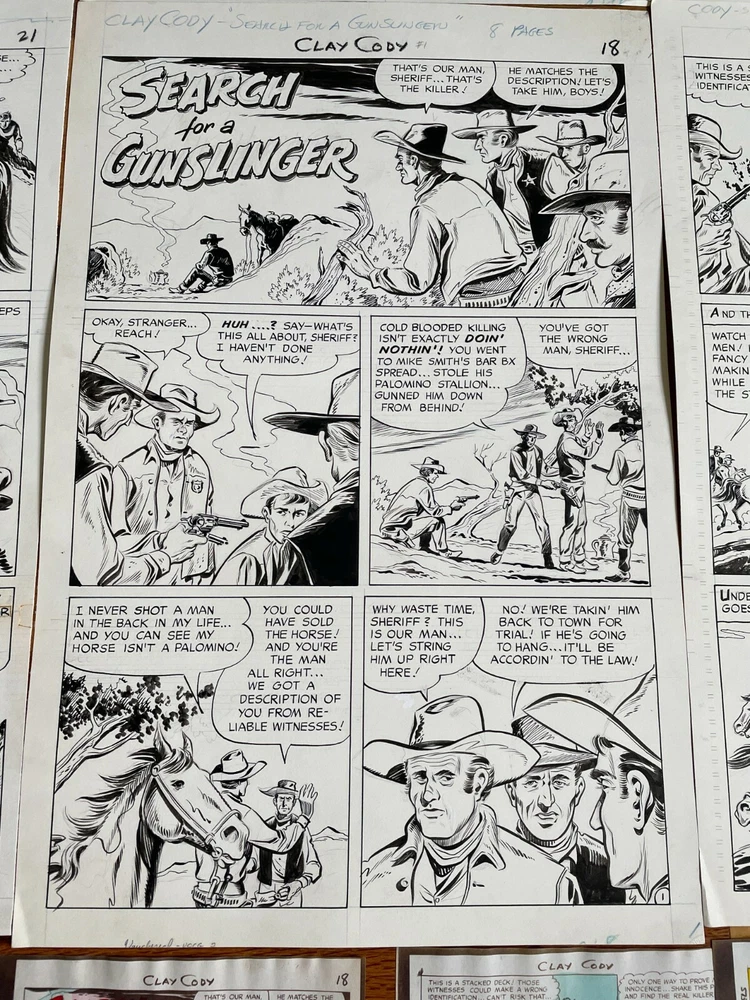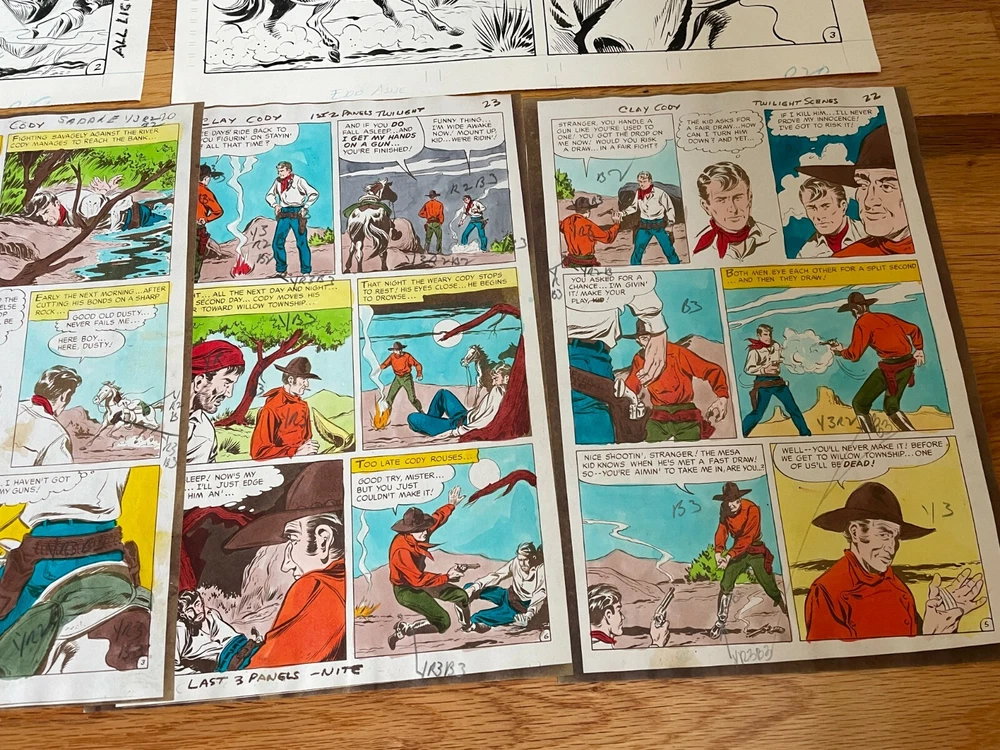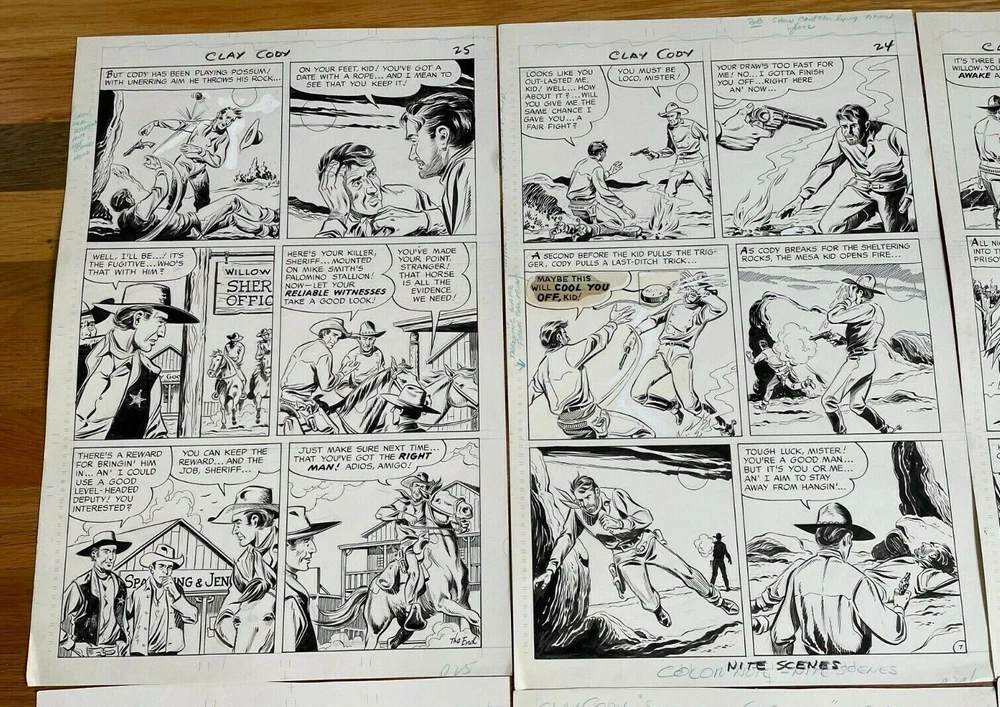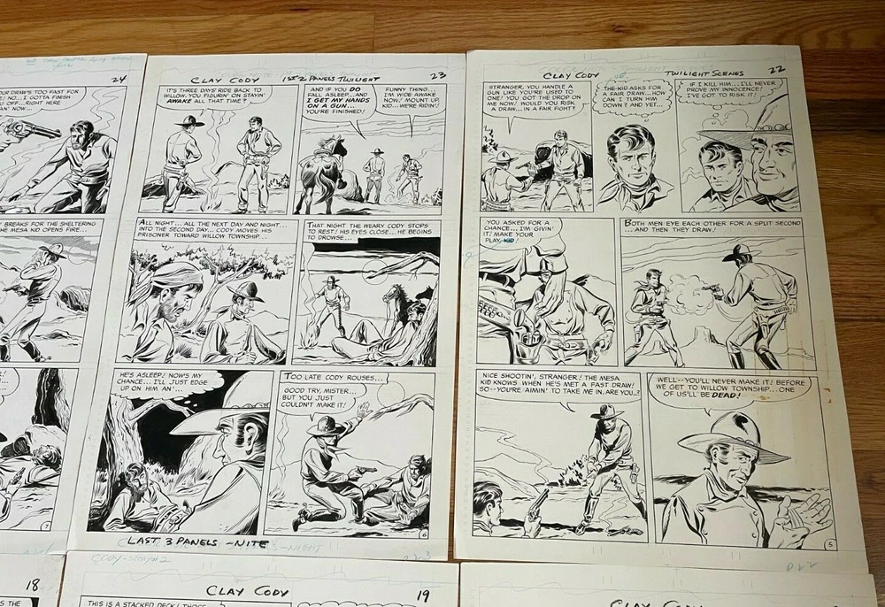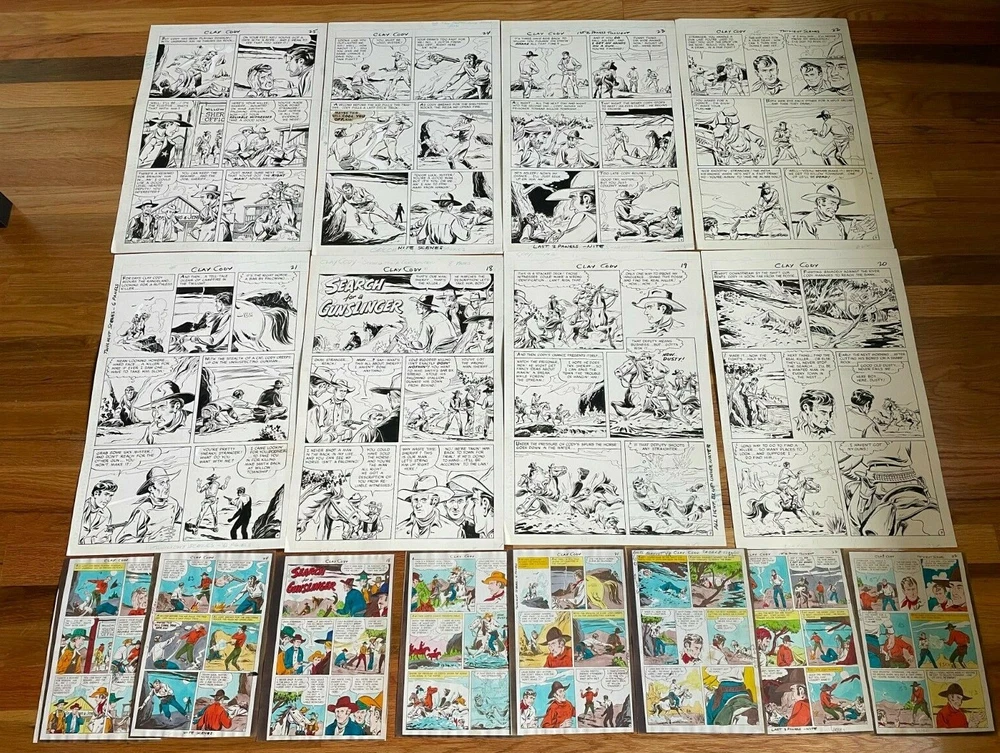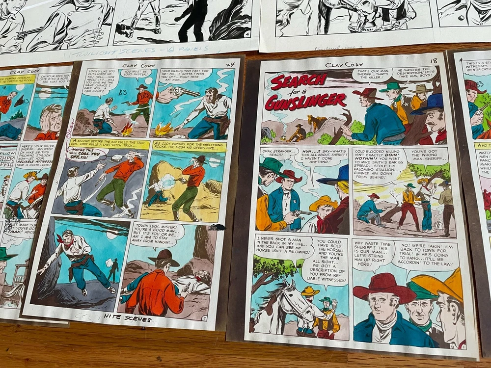 THEN IT RAINED COMICS PRESENTS : CLAY CODY GUNSLINGER #1 original art RARE COMPLETE 8 PG STORY plus 8 page COLOR GUIDE SET WESTERN 1957 PINES This is a AWESOME, RARE FIND...….from CLAY CODY GUNSLINGER #1 from 1957 and PINES COMICS, this is the COMPLETE 8 PAGE SET of ORIGINAL COMIC BOOK ART and COMPLETE 8 PAGE SET OF ORIGINAL COLOR GUIDES to the story titled SEARCH FOR A GUNSLINGER......LEGENDARY WESTERN THRILLS...lots of ACTION!!...........GET THE WHOLE STORY AT ONCE.....Each ART PAGE measures a LARGE 13" BY 20", Each COLOR GUIDE measures 7" BY 10"…..A MUST SET FOR ANY WESTERN FAN!!!!.....I have shown a picture of the comic this art is from, you do NOT get the comic!.....Use BUY IT NOW and get this great lot for a FAIR PRICE or MAKE ME A FAIR OFFER---THANKS!!! USA SHIPPING ONLY ON THIS ONE!! BUY IT NOW - COMICS and ART are PRICED TO SELL - BUY IT NOW!! GET GREAT SERVICE - WELL PACKED ITEMS 23,000 + POSITIVE FEEDBACK!!! THEN IT RAINED COMICS SAYS -----BID WITH CONFIDENCE! We have been buying/selling comics for 25 years! Helped with market reports as a WIZARD V.I.P. Known by comic dealers and collectors worldwide to be FAIR and HONEST! We pride ourselves on being good Ebayers, with 99.9% POSITIVE feedback, grading your comics accurately so you will be happy, answering emails, packing your items well, shipping quickly! So have a good Ebay experience, get quality merchandise at a fair price! Give us a try!