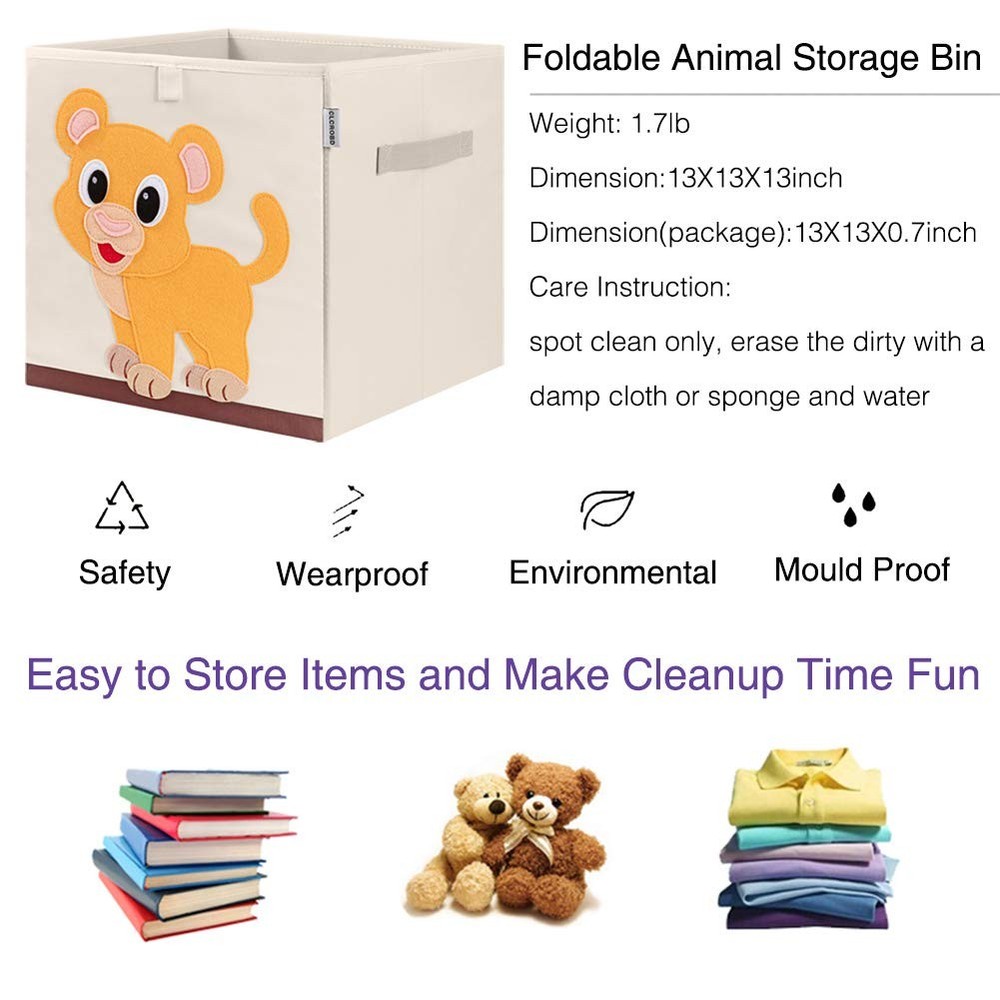 13 inch kids storage bins with animal theme felt applique are designed to make storing fun and easier. The large canvas 13 inches nursery storage cubes basket is a wonderful solution for keeping your children’s room neat and tidy by providing a place to store cloths, toys, puzzles, books, crafts, laundry, or other items. The sides are reinforced with sturdy cardboard to hold all different kinds of items. Cute animal storage cube measures 13 x 13 x 13" fit in most cube shelf organizers and cubbies, perfect cube shelves decoration for any kids room, playroom, nursery and make cleanup time fun. Why choose this canvas kids organizer cubes? 1.Unique Animal Theme Design. 2.Use high-quality 100% polyester for the entire outer and safe for all ages. 3.The sides and bottom are reinforced with thick cardboard that will not easy to bend or tear apart, and provide the performance stable and high durability. 4.Sturdy handles on both-side are designed to move toy box more easily. 5.A wonderful solution for keeping your children’s room neat and tidy 6.This cloth cube storage bins with collapsible bottom structure can be assembling and fold flat easily, it saves space when not in use. 7.Fit in most cube shelf organizers and cubbies, perfect cube shelves decoration for any kids room, playroom, nursery and make cleanup time fun. 8.The baby toy organizer container is easy to wipe clean the dirty with a damp cloth and water. Features Unique Animal Theme Design Sturdy handles on both-side Fit in most cube shelves Fold flat easily when not in use Organize cloths, toys, puzzles, books, crafts, laundry and more Cute and high durability multi-function kids toy storage box for girls, boys, toddlers, children Package Include 1* Kids Animal Toy Storage Cube Animal Theme Design: Measures 13 x 13 x 13", kids storage cubes with animal theme felt applique fit in most cube shelf organizers and cubbies, perfect cube shelves decoration for any kids room, playroom, nursery and make cleanup time fun. Sturdy & Strong Quality: Cute animal storage bin use high-quality 100% polyester for the entire outer and safe for all ages. The sides and bottom are reinforced with thick cardboard that will not easy to bend or tear apart, and provide the performance stable and high durability. Sturdy handles on both-side are designed to move toy box more easily. Organizer & Storage Cubes: This large fabric 13 inches cube storage bin is a wonderful solution for keeping your children’s room neat and tidy by providing a place to store cloths, toys, puzzles, books, crafts, laundry, or other items. Foldable Storage Bins: This toy storage cubes with collapsible bottom structure can be assembling and fold flat easily, it saves space when not in use. It’s also suitable for car travels or road trips and help you to store kids toys, books, cloths, shoes, pet products. Easy Clean & Friendly Support: The toy bins for kids organizer container is easy to wipe clean the dirty with a damp cloth and water. offers worry-free and 24-hour friendly customer service. Order Now Without Risk!