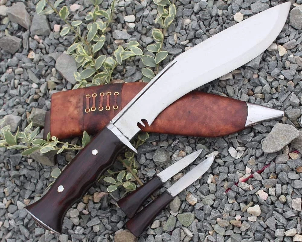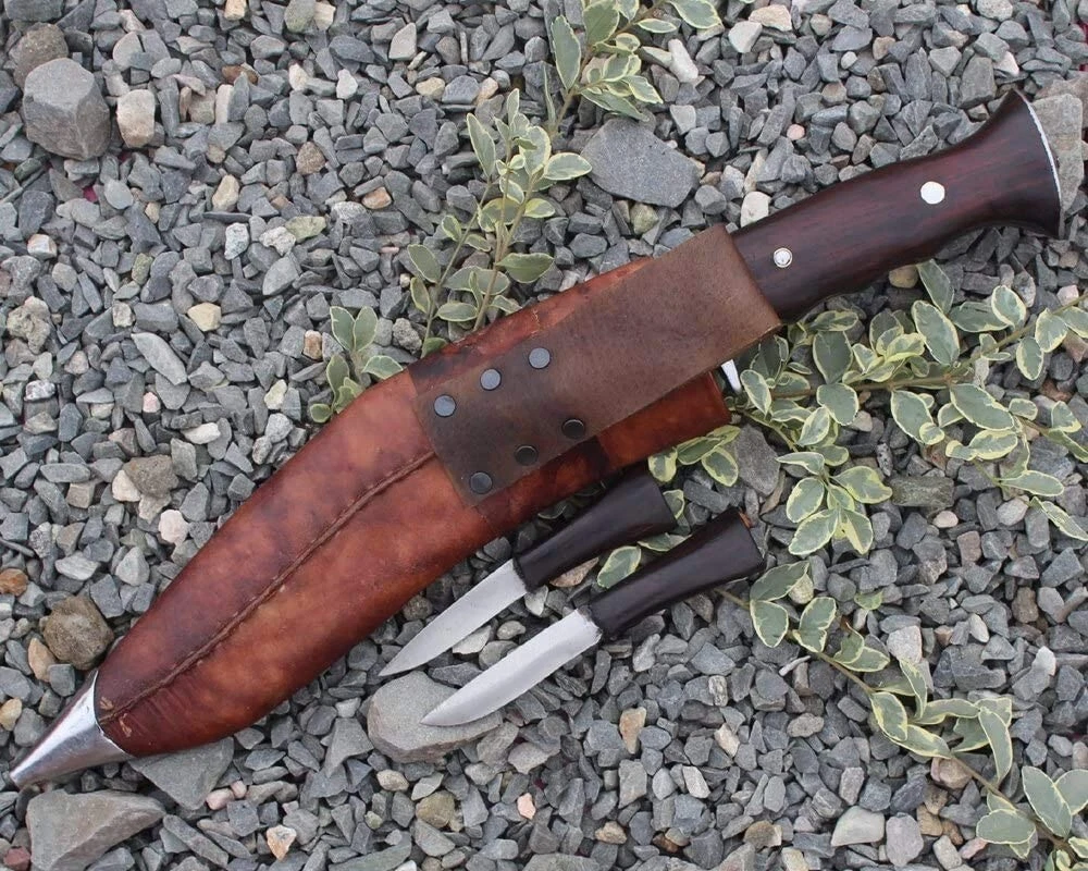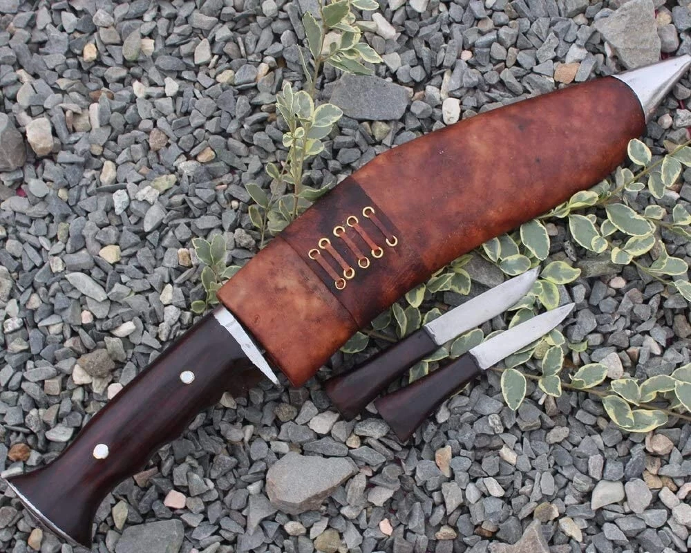 WELCOME TO EX-GURKHA KHUKURI HOUSE Ex-Gurkha Khukuri House is the finest and largest Khukuri /kukri maker/Manufacturer/Retailer in Nepal. Please contact us for wholesale kukri pricing. Dealing in The Genuine Gurkha Kukri directly from the Home Land Of The Gurkhas! CLEARANCE SALE 50% OFF 10.25" Service Full Tang Gripper Handle Khukuri :- It is better to die than to be a coward. Gurkha proverb!! About 10.25" Service Full Tang Gripper Handle Khukuri :- : - 10.25" Blade Service Full Tang Gripper handle Kukri: one of the Nepal Army known as Gorkhas (British Nepales Army has used for World War I ) Standard Issues. -- This is the actual World War I issue Kukri Knife & which is specially developed to carry out different jungle tasks & also fight for Survival. This kukri is heavier than the standard Jungle or PRI issue. It is designed for rough use therefore it is an unpolished finish. The kukri has got lanyard hole on the handle for safety. The scabbard is made of water buffalo leather. The sheath has a belt loop with the frog. The handle and blade are made of the same piece of spring steel. The Blade is tempered by pouring cold water while it is heated as this knife-making process continues. The Balance temper on the edge and blade makes it very strong to cut bones. The handle is made of dark Rosewood. The handle is strongly joined with the blade by two rivets. This knife can be used in Kitchen as well as outdoors for camping or as a survival Knife. Each area of the Kukri is made to execute several functions with ease. ¬¬______The overall length of the Kukri is 15.5 inches with a 10.25" semi-polished blade and a 5.25" full tang handle. A simple and improved sheath with a belt loop is made of processed dark brown leather. It Weighs about 1.75 lb or (775 grams) with sheath. The craftsmanship on this knife is amazing so if you are looking for the finest quality working kitchen or bone chopping knife you will not be disappointed. Where this Kukri is Made? The origin of the Kukri is in Nepal. Dharan is a small Gurkha town that is located in eastern Nepal. Dharan is a very famous and important place for Gurkha recruiting. We have our own factory in Dharan, there are over 200 blacksmiths (metal smith,kamis). And all the Kukri they made by hand. Specification of 10.25" Service Full Tang Gripper Handle Khukuri : This is a handcrafted kukri therefore please note that each one might have slight variations in measurement * Blade Size and Type: 10.25 inches (26 cm), Hand Forged Unpolished Blade. * Handle: 5.5 inch (14cm) full tang rosewood Gripper Handle. * Material Used: Highly Graded Carbon Steel 5160, water Buffalo Leather for Scabbard(outside) and rosewood for the Handle, Pinewood for the Scabbard (inside), Brass, and "Laha" ( Nepali Traditional Glue) . * Weight: 700gms (25 Oz Approx) only khukuri blade weight. * Overall length: 16 inches from tip to pommel (Approx). * Steel Hardness : spine=22-25 RC, belly=45-46 RC, edge=58-60 R * Karda & Chakmak: These are small knives that come with Kukri. Karda is a small knife used for skinning animal hairs. And Chakmak is used of sharpening the Kukri blade in its blunt. When you bid or buy this In order you will also get these two unique knives. Please Note: We listed The Kukri Stock clearance 50% OFF Sale price so we will not accept returns or exchanges for this product, The kukri is brand new very good condition, Scabbard, and two small Utility Knives are included in the Sale price. Problems........??? please, before leaving negative feedback, contact us and allows us to try to correct the problem. If you have any queries please don't hesitate to contact us . Strictly for Over 18?s Only We may request a copy of your ID to verify your age before we ship the item EGKH since 1999 in Nepal Genuine Gurkha Kukri Knives From the Homeland Of Gurkha In Nepal. Buy with Confident, the Quality & Authenticity are 100% Guaranteed THANK YOU VERY MUCH FOR VISITING