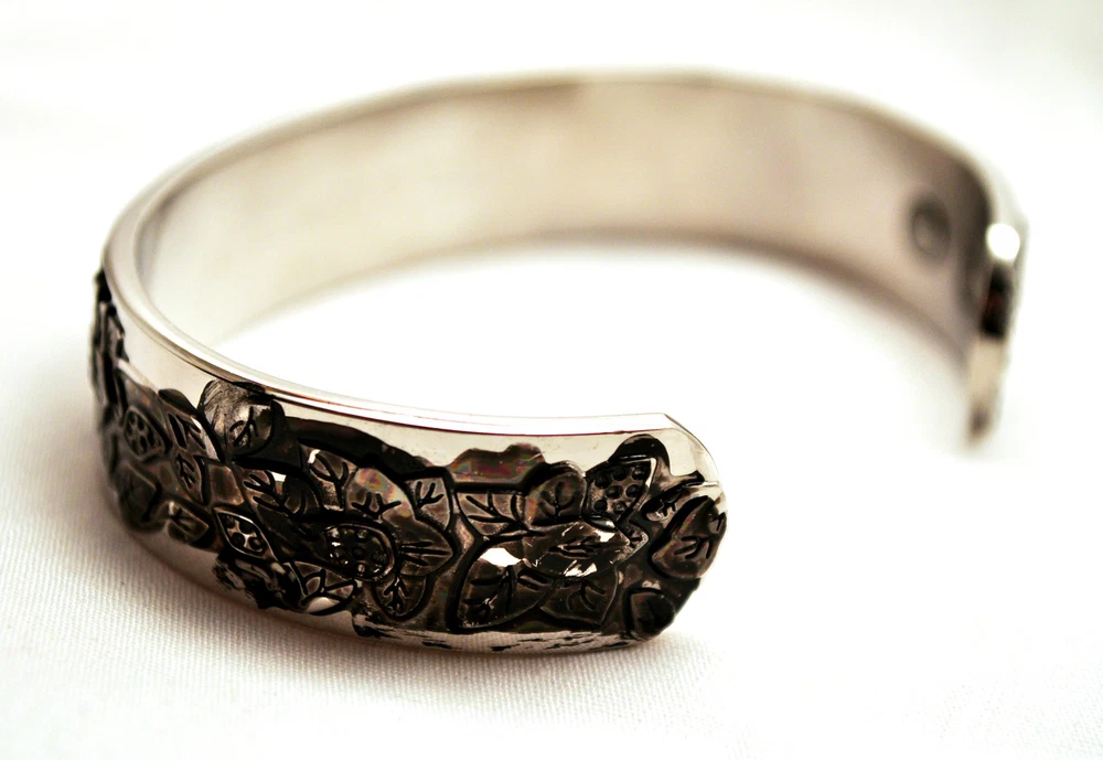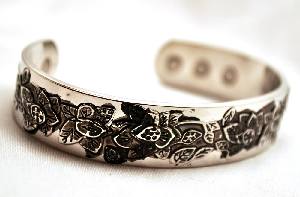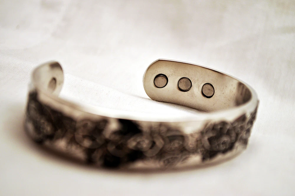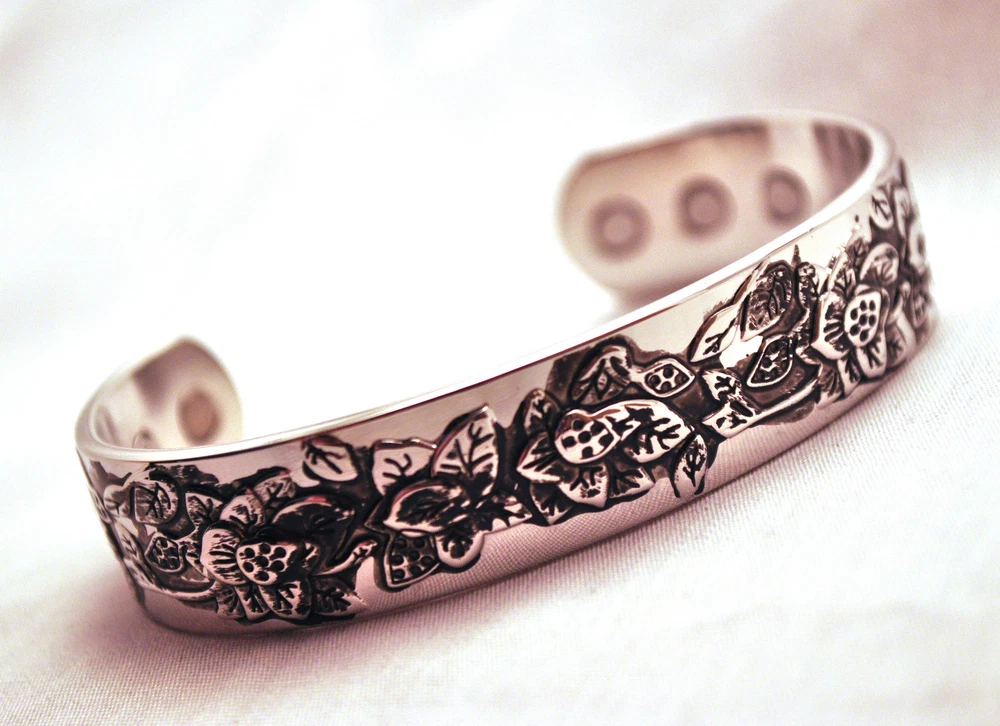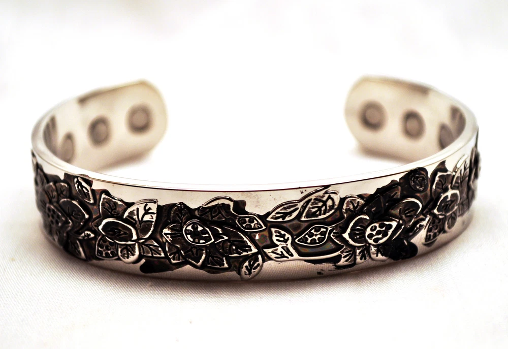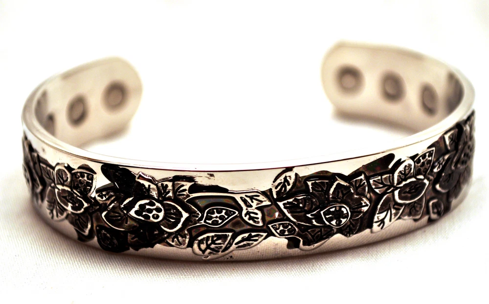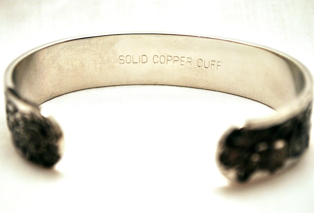 WE SELL THE BEST MAGNETIC THERAPY FASHION CUFFS ON E-BAY AT ROCK BOTTOM PRICES! This finely crafted 6.75 inch by 1/2 inch Magnetic Therapy Healing 100% Copper Bracelet is adjustable and fits most wrists. It sports 6 Neodymium North Facing Magnets, each with a Surface Gauss of 2500. There are reported to be physical benefits to magnetic copper bracelets. Some studies have shown that when copper is brought in close contact with the skin, it helps decreases aches and pains. It also is purported to increase the amount of iron in the blood which in turn will generate energy. For all of these benefits, this bracelet is surprisingly affordable and stylish. Please be aware that on occasion, copper can react to a person’s perspiration and body chemistry and turn the copper and/or the skin green, blue or black. WE OFFER FREE SHIPPING ON EVERY ORDER MAILED WITHIN THE U.S. AND A 30 DAY MONEY BACK GUARANTEE! EACH CUFF ARRIVES IN ITS OWN STYLISH GIFT BOX! WHAT IS MAGNETIC THERAPY? Magnetic Therapy, also known as biomagnetics, is an inexpensive, non-intrusive, pain free, nontoxic treatment that is used worldwide. It is similar to acupuncture but instead of needles, it uses magnets. The North pole of permanent magnets are place against the skin at specific points to improve energy and blood flow. The objective of Magnetic Therapy is to promote pain relief and enhance the body’s healing processes, without introducing foreign objects or chemicals into the body that may have undesirable side effects. Magnetic Jewelry is now becoming an increasingly popular way to get the medicinal effects of Magnetic Therapy, while looking fashionable at the same time. HOW DOES MAGNETIC THERAPY WORK? The latest research indicates that magnetism has a very significant biological effect. Magnets work on a cellular level by generating heat that increases the motion of charged electrons in the bloodstream and this enhances circulation by dilating the cell walls. The increased electron flow improves cellular metabolism and aids in detoxification by increasing the flow of oxygen through the body. New cells are built and they rejuvenate the tissues of the body. This often relieves pain and tension in the body and in turn improves health and leads to an increase in vitality. TYPES OF PAIN THAT MAGNETIC THERAPY MAY HELP ALLEVIATE : Poor blood circulation or a lack of oxygen at the cellular level is often linked with pain. The use of magnets can help increase blood flow, reduce inflammation, and help in the treatment of chronic pain. It has been found to be effective in combating the effects of migraines, headaches, lower back, knee, and neck pain, rheumatism, arthritis carpel tunnel syndrome, cramping, gout, angina, depression, menstrual cramps, muscle pain, insomnia, sprains, strains, bruises, swelling, and the inflammation of joints, nerves, and tendons. IS IT SAFE? Research has shows that there are no harmful side effects caused by the use of magnets. However, they should not be used by people with pacemakers, electrical implants, defibrillators, insulin pumps, artificial joints, pregnant women or people allergic to metal. Also, please keep the magnets 4-6 inches away from hotel keys with magnetic strips, wind up watches, hard discs, credit cards, cell phones, computer monitors, VCRs and televisions. CARE OF MAGNETIC PRODUCTS: Magnetic products, though waterproof, should be removed before showering, bathing, or swimming. Harsh soaps or chlorinated water may damage your product or leave a soap scum that renders the magnets less effective and reduces the strength of the gauss (magnetic field). Do not clean magnetic jewelry with jewelry cleaner. Simply wipe with a soft damp cloth and mild soap. With jewelry that has a magnetic clasp, do not pull the clasp apart or you will damage it. It is best to just slide the clasp apart. DISCLAIMER: These bracelets are not being sold as medical devices! In accordance with FDA regulations, we do not make any therapeutic claims regarding their health benefits! Please Remember to Rate Us on E-Bay! Thank you for your purchase! Don't forget to tell all of your friends about us!
