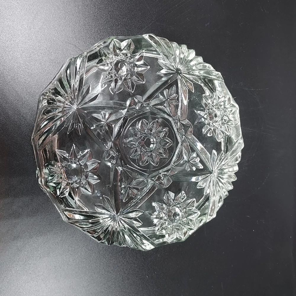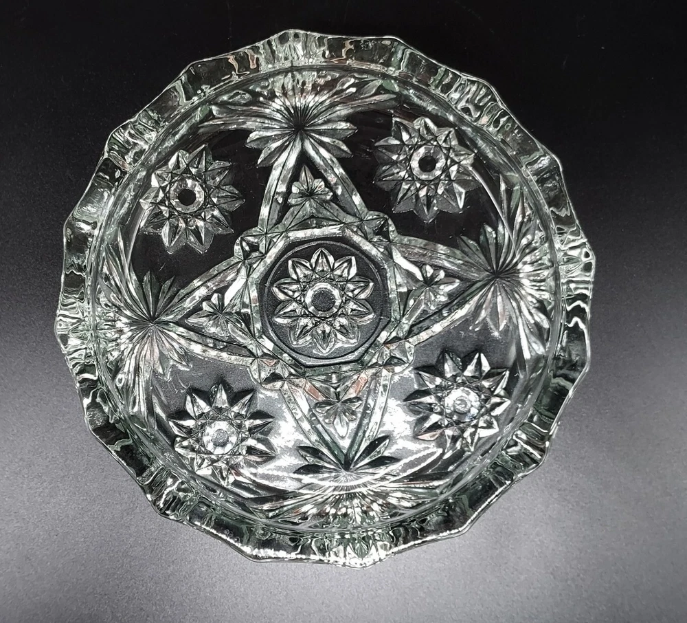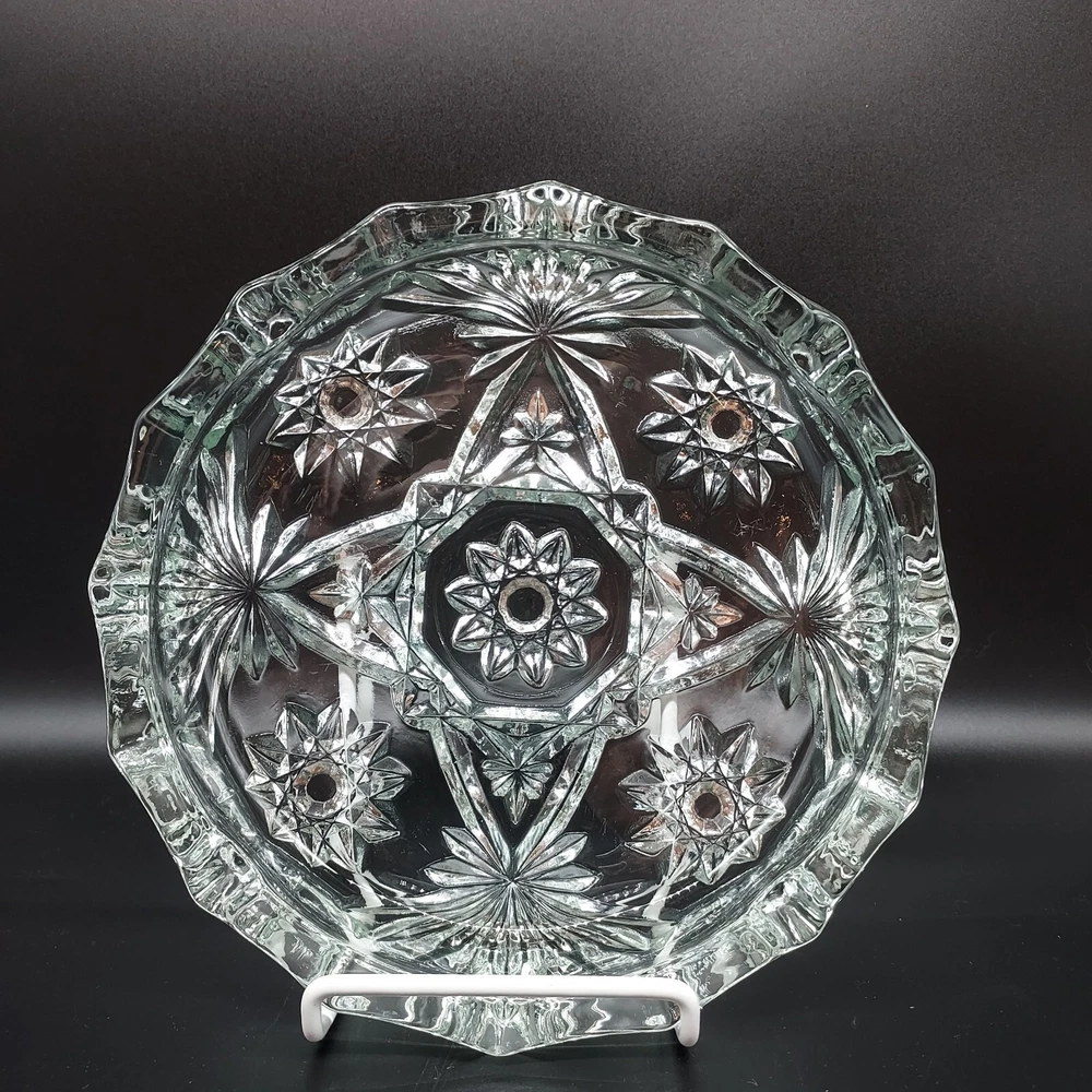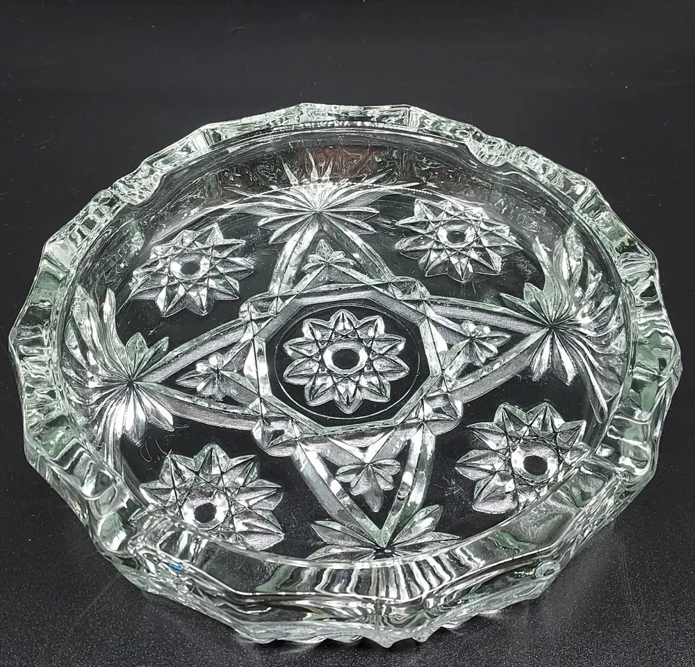 This vintage Anchor Hocking EAPC Prescut ashtray is a beautiful addition to any collection. With a diameter of 8 inches, this round ashtray features a stunning Star of David design and is made of clear glass with a glossy finish. The mid-century modern style and decorative features make it perfect for display or for use with cigarettes and cigars. The ashtray is an original piece from the 1960s and was manufactured in the United States using pressed glass production technique. It is part of the Early American Prescut/EAPC product line and is in mint condition. The ashtray is suitable for collectors and enthusiasts of vintage glassware and pottery.