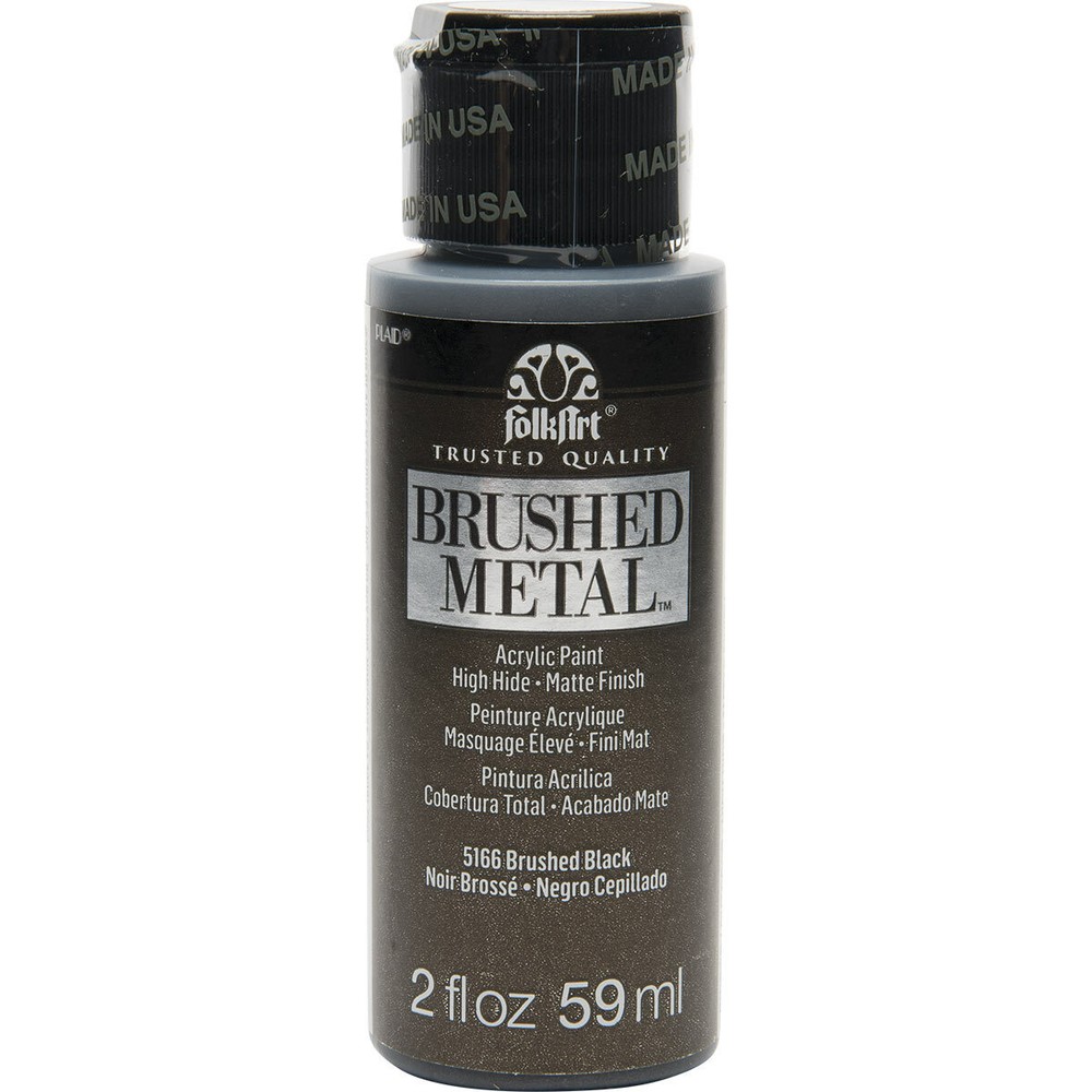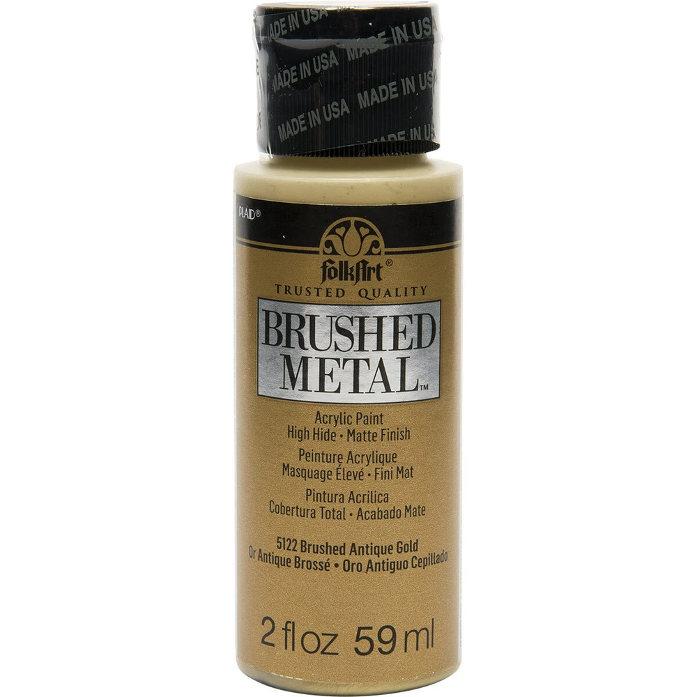 FolkArt Brushed Metal MATTE finish Give your next DIY craft project a brushed finish effect with FolkArt Brushed Metal Metallic Acrylic Paint! Thanks to an easy-to-use brush-on formula, Brushed Metal paints offer superior coverage and high hide. FolkArt Brushed Metal Metallic paints dry to a sophisticated matte finish and can be used on indoor and outdoor projects. Part of the artist-trusted FolkArt creative system of paints and finishes FolkArt Brushed Metal Metallic Acrylic Paint is made in the USA. 10 Colour Options: Brushed Silver 2oz 59ml Matte finish Brushed Gold 2oz 59ml Matte finish Brushed Antique Gold 2oz 59ml Matte finish Brushed Black 2oz 59ml Matte finish Brushed Bronze 2oz 59ml Matte finish Brushed Rose Gold 2oz 59ml Matte finish Brushed Dark Grey 2oz 59ml Matte finish Brushed Pearl Gold 2oz 59ml Matte finish Brushed Copper 2oz 59ml Matte finish Brushed Pale Silver 2oz 59ml Matte finish Q and A Does FolkArt Brushed Metal Acrylic Paint hold up well on outdoor surfaces? Absolutely. FolkArt Brushed Metal Acrylic Paint is formulated so that it can be used on interior surfaces as well as a permanent outdoor paint By the nature of the acrylic polymers used to make FolkArt Brushed Metal, it is weather resistant. FolkArt Brushed Metal Acrylic Paint dries to a brushed metal finish that reflects a soft polished effect. When properly cured to the surface, (approximately 48 hours), it is self-sealing and does not require a sealing topcoat. Give your next DIY project a brushed finish effect with the FolkArt Brushed Metal 6 piece Brushed Metal Paint Set . This set of 6 realistic metal colors has an easy-to-use, brush-on formula. FolkArt Brushed Metal Metallic paints offer superior coverage and dry to a sophisticated matte finish and can be used on indoor and outdoor projects. Part of the artist-trusted FolkArt creative system of paints and finishes, FolkArt Brushed Metal Metallic Acrylic Paint is made in the USA. Add this set of metal-like paints to your collection for a professional finish to your decor. Includes six (6) 2 fl oz bottles in Silver, Gold, Rose Gold, Black, Bronze, and Antique Gold Creates a matte, brushed metal finish Superior coverage Indoor/outdoor Water-based and non-toxic, made in the USA We would like to thankyou for taking time to view our listing