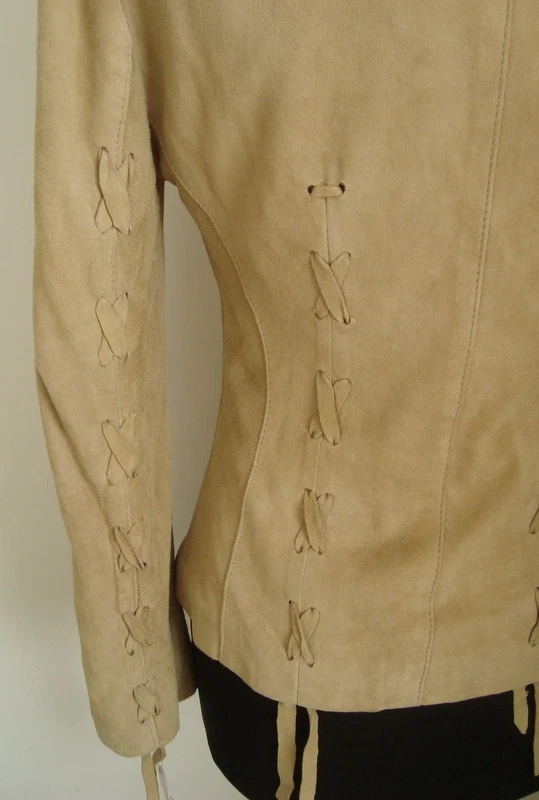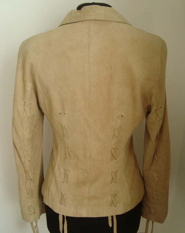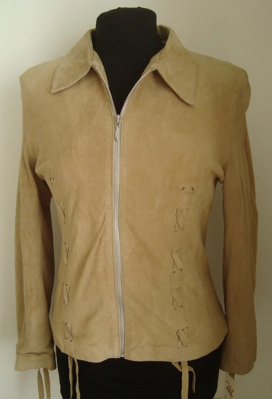 SALE OFFER!!!! LADIES' BEIGE GOAT SUEDE ZIP JACKET SIZE M Made in the softest of goat suede this lightweight jacket fastens with a centre zip to the neck and is decorated with inserted thonging on the front, back and sleeves. The lining is a satin polyester. *************** This was a showroom sample only worn indoors so is a sale offer at a greatly reduced price from its original £156 *************** Measurements are : Bust 34" (86 cm) Waist 28" (71cm} Length 23.5" (60 cm) Sleeve length 24" (61 cm) Shoulder to shoulder 16" (41 cm) ********** Remember that leather is a natural product so may display slight variations in texture and colour. This is not a fault and is no way detrimental to the quality of the garment. Colours vary from computer to computer although we make every effort to portray them accurately. Check out my other items !