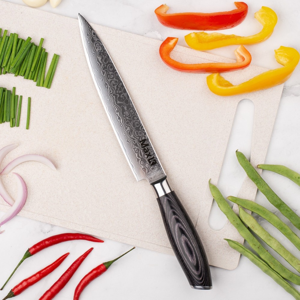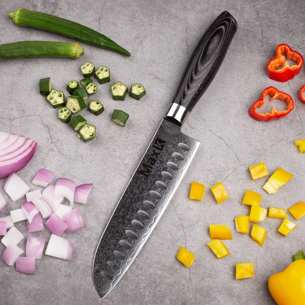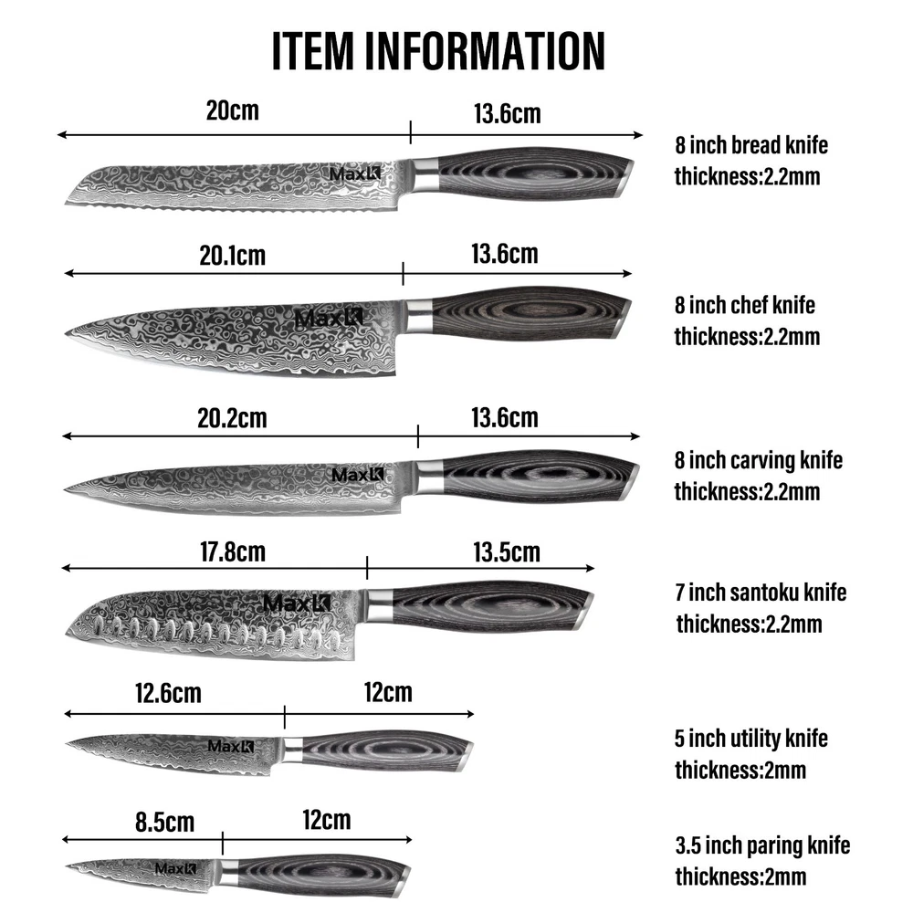 Max K 6 Pcs Knife Set with Pakka Handle & Bonus Knife Stand - Cutting Kitchen Utensil with Razor Sharp Blade and 67 Layers of Forged Steel - Slicing, Dicing, Chopping Meat, Vegetables, Fruit Product Details Blade Material: Alloy Steel Brand: Max K Color: Multicolor Handle Material: Alloy Steel Blade Edge: Plain, Serrated Blade Material: Alloy Steel Brand: Max K Color: Multicolor Handle Material: Alloy Steel Blade Edge: Plain, Serrated Construction Type: Forged Is Dishwasher Safe: Yes Number of Pieces: 6 UPC: 742833324532 Package Dimensions: 17.6 x 12.76 x 6.77 inches Item Weight: 8.69 pounds COOK LIKE A PRO - Every chef needs a trusty knife. Our handmade Damascus knife is balanced yet sharp and built to last. Prepping meat, fish, chicken, and vegetables has never been easier! BEAUTIFULLY CRAFTED BLADE - Our 67-layer knife is made with premium Damascus steel wrapped around a superior VG10 core. It has the right thickness that doesnt sacrifice any of its cutting power. EXCELLENT WEIGHT & GRIP - Handling our Damascus chef knife is easy, thanks to its ideal weight, dimensions, and full tang grip. It feels like an extension of your arm, making it comfortable to use. ENDURING SHARPNESS - We hand sharpened the blade and made sure that the sharpness lasts. Youll be finding this Damascus kitchen knife handy for long before you ever need to sharpen it again! SATISFACTION GUARANTEED - If by any chance this Damascus steel knife isn't up to your expectations, let us know and well handle it. Well facilitate your refund or replacement immediately. LIFE’S TOO SHORT TO ENDURE USING A DULL KNIFE. Every chef worth their salt would tell you that the most important thing in the kitchen is a reliable knife. It’s an extension of your arm that allows you to slice, chop, dice, julienne, or mince the ingredients you need for any dish. If these ingredients aren’t prepared right, it could affect the taste or texture of your food. So, if you want to make your home-cooked meals at par or even better than what you have outside, you’d want the perfect culinary tool at your disposal. And you won’t need to look far for it. The Max K 6 Pcs Knife Set with Pakka Handle is your perfect companion for slicing, dicing, and chopping! FAST FREE SHIPPING