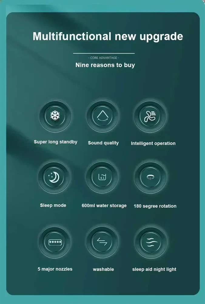 Specifications: Product Name: Air Cooling Fan Product Dimensions: 21cm X 9cm X 26cm Weight: 685g (without water) Power: 10W Max Voltage: 5V Current: 2A Max Blowing Distance: 2.5m Max Plug: USB Type-C Plug Max Water Filled Capacity: 600ml Mist Volume: 225ml/h Max Mist Time: 2.5h - 12h 7 Colors & Low Noise : This portable air cooling fan uses a 7-color light design to provide soft lighting. 3-in-1 Function: It combines the functions of a fan, an air conditioner, and an air humidifier. If you feel the air is very dry and hot, just buy it. It's not just a personal air cooler, but also a humidifier. In the hot summer, when you add ice and water to the sink, you can feel the cool air and enjoy the icy summer. At the same time, in autumn and winter, it moisturizes the air. 3 Wind Speeds & 3 Sprays : The air cooler fan has 3 wind speeds (low/medium/high) and 3 spray modes. You can adjust the wind speed and spray mode to suit the occasion. It's a combination of a personal air cooler, fan, and air humidifier, a 3-in-1 multifunctional design to keep away the heat and enjoy the cool summer. On a warm summer evening, set 7 colorful lights on your dining table or coffee table to create a romantic atmosphere! Place it in your bedroom and accompany you into the beautiful night. This air cooler fan operates powerfully at low noise, allowing you to sleep comfortably in a quiet environment. Power supply and energy saving mode : Simply connect the USB cable to your USB-enabled device. Compatible with computers, mobile power supplies, USB adapters, car chargers, and other USB-enabled power supplies. Low power consumption, greater environmental protection and energy saving. It can save your electricity bill and is environmentally friendly. Portable design and large capacity : The portable air cooler fan can be easily carried anywhere. In summer, it's the best choice for camping; you can easily set up camp, perfect for family, office, outdoor picnics, etc. The large 600ml water tank is filled with ice and water, and can spray cold air for several hours to keep you cool and happy.