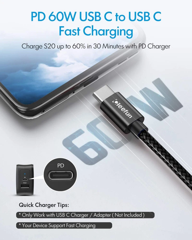 CLEEFUN 5-Pack USB C to USB C Cable 6ft, 60W USBC to USBC Cable, Type C to Type C Charger Fast Charging Cord for iPhone 15/15 Pro Max/15 Plus, for iPad/Macbook, for Samsung Galaxy S24 S23 【60W High Speed Charging】 Cleefun USBC to USBC Cable support PD3.0 fast charging up to 60W Max (20V/3A) when paired with USB-C Power Delivery. And this USB-C to USB-C Cable offers transfer speed up to 480Mbps. 【Reliable Charging 】Advanced chip design provides outstandingly reliable conductivity & stability protecting your devices and charging adapters from damage. 【Extreme Durability】 The upgraded construction techniques and premium nylon materials of this c to c type fast charging cable extend the service life. Withstand more than 30,000+ bend tests. 【Universal Compatibility】 This c to c charger cable fast charging compatible with Galaxy S23 S22 S21 S20 Note 20 10, Z Fold/Flip 5 4 3, A54 A23 A14 A13 A03s 5G, Pixel 8 7pro 7a 7 6pro 6a 6 5 5a & more USB-C device. 【What You Get】 We provide 5 × Premium Nylon-Braided USB C to USB C Cable 6ft Black (Note: This is a USB C to USB C charger cable, so it can only be used with USB-C chargers.) 【60W High Speed Charging】 Cleefun USBC to USBC Cable support PD3.0 fast charging up to 60W Max (20V/3A) when paired with USB-C Power Delivery. And this USB-C to USB-C Cable offers transfer speed up to 480Mbps. 【Reliable Charging 】Advanced chip design provides outstandingly reliable conductivity & stability protecting your devices and charging adapters from damage. 【Extreme Durability】 The upgraded construction techniques and premium nylon materials of this c to c type fast charging cable extend the service life. Withstand more than 30,000+ bend tests. 【Universal Compatibility】 This c to c charger cable fast charging compatible with Galaxy S23 S22 S21 S20 Note 20 10, Z Fold/Flip 5 4 3, A54 A23 A14 A13 A03s 5G, Pixel 8 7pro 7a 7 6pro 6a 6 5 5a & more USB-C device. 【What You Get】 We provide 5 × Premium Nylon-Braided USB C to USB C Cable 6ft Black (Note: This is a USB C to USB C charger cable, so it can only be used with USB-C chargers.) Shipping from the USA All of our products are shipped from the USA, ensuring quick delivery to your destination. Payment We offer the following payment methods: PayPal, credit card, bank transfer, and eBay's secure payment system. Free Shipping & Free Returns Shipping within the USA is FREE. Additionally, any return is absolutely free for you. Risk-Free Purchase You have the option to return an item within 30 days without any justification. We cover the return shipping costs! Fast Shipping We ship immediately upon receipt of payment. Generally, the package is delivered within 2-3 days in the USA. If it takes longer, we will contact you. Quality and Costs Made in Europe, USA, China No customs fees or additional charges Total satisfaction guarantee Invoice with declared VAT available upon request in .pdf format Feedback Your feedback is very important to us. After you pay for your purchase, you will automatically receive positive feedback from us.