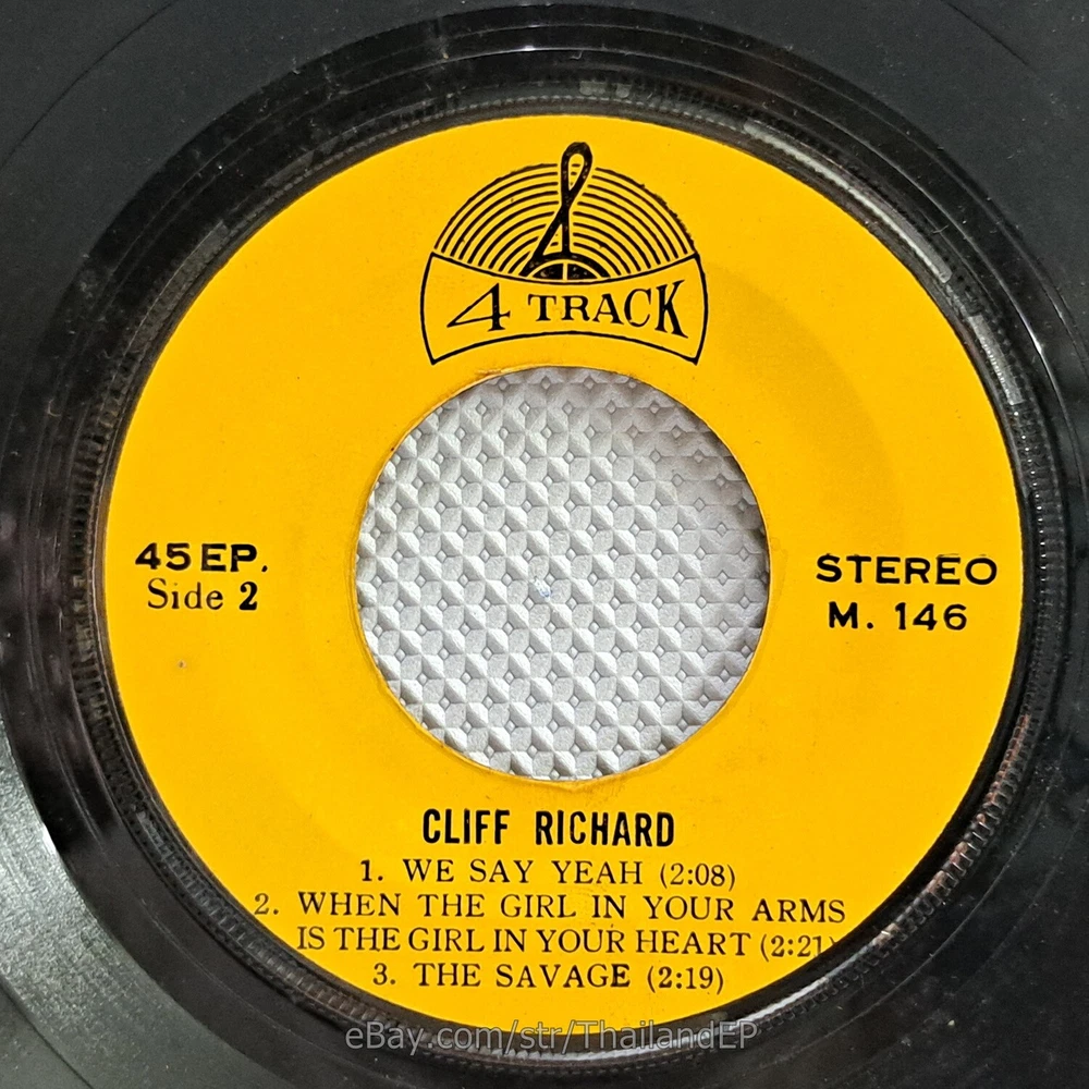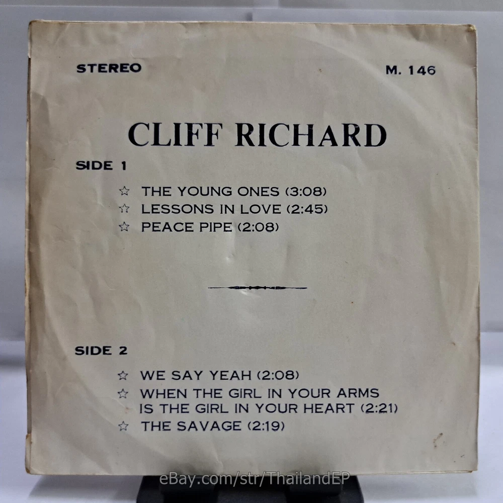 Welcome to The World of ""Thailand Vinyl Records"".Very rare and beutiful picture of cover. Check everyday . This item is for a true 7" single collector. It was printed and sold locally as limited EP back in the early 70's. Only few copies were spread outside Thailand. Most professional record collectors know that it is scarce nowadays and is absolutely a collector's item. If you know a UK magazine called RECORD COLLECTOR then you must have read many articles mentioning THAILAND EP and this is it !!! Here is your chance to own one-of-a-kind piece of Asian's 7" single history. Description Records !!! DETAIL SONG and ARTIST !!! Side A: A1 = Cliff Richard - The Young Ones / A2 = Cliff Richard - Lessons In Love Side B: B1 = Cliff Richard - We Say Yeah / B2 = Cliff Richard - When The Girl In Your Arms Is The Girl In Your Heart Label&Catalogue number : : M146 Country of release : THAILAND Condition (Sleeve/Disc) : VG / VG+ and pls see picture too. Shipping I am seller in Thailand not USA.So I can not ship 4$ as policy pls understand this real rate from oversea . Price for shipping(Airmail )&Packaging to worldwide only US 14.99 USD .Except Asia and JAPAN only 14.99 USD. You can save cost for combine shipping only 3 USD$ per each. 2xEP=17.99 USD$ , 3xEP=20.99 USD$ . My package very safety by big cardboard don't worry about your's EP/PS/LP. Time delivered 21-45 days . ***All item : have tracking system no need add money*** **For normal shipping (Airmail).Time delivery to ITALY maybe use 1-2 Months, France use 1-2 Months.But Don't worry item will arrived to you sure!!.For fastest and High value you can use Express Mail Service cost for1 EP =39 USD.EP will arrived to you within 5-7 Days. ***All shipment have fully tracking system *** Payment PAYMENT : I accept the follow payment by eBay managed , . My ID eBay provide by eBay .Account will be provide at the end auction.Charges to be covered by winner. If you have question pls email to me anytime i can answer immediatly. I have many EP,PS 7" Thailand Pls Click => View seller's other items Check my feedback , I care and honest all customer.I welcome 0 feedback but contact me first if you will bidding. Good Luck !!!! and Enjoy . 45 RPM / EP/ LP Grading Scale: Mint /NM/ Excellent(VG++) /VG+/ VG /G+ /Good(G) / Fair / Poor / Bad (According Record Collector Magazine (UK)) LOT150-33M146