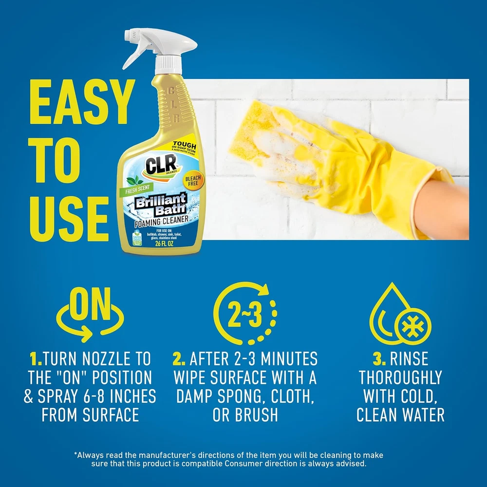 Business is our speciality NEW Brilliant Bath Foaming Bathroom Cleaner Spray - for Use on Toilet, Bath, Shower, Sink, Glass, Stainless Steel - Fresh Scent, 26 Ounce Bottle (Pack of 2) FEATURES Powerful Clean: CLR Brilliant Bath cleans surfaces with a formula that rapidly eliminates dirt; Its foam has the capacity to fight all kinds of bathroom dirt and grime buildup Many Uses: This versatile cleaner foams to remove even the toughest buildup from sinks, faucets, showerheads and bathtub surrounds; Safe for glass and stainless steel Easy to Use and Effective: Effectively remove stains in two steps; Just spray the solution onto the sink, shower door, or faucet, and wipe clean; CLR Brilliant Bath cleans one of the dirtiest rooms in your home with less effort EPA Safer Choice Certified: This daily cleaner is recognized as a safer alternative to harsher chemicals by EPA's Safer Choice Program; Contains zero ammonia, bleach or phosphates Fight the Clean Fight: CLR offers products for all of your household needs including Healthy Septic System, Spotless Stainless Steel, and Clog-Free Drain Product Description Item model number BB26-2 Style Cleaner Item Form Liquid Product Dimensions 6.3 x 5 x 6 inches; 1.63 Pounds Country of Origin USA Material Feature Scented Scent Fresh Specific Uses For Product Bathtub,Door,Faucet,Faucets,Glass,Shower,Sink,Sinks,Toilet Size 26 Fl Oz (Pack of 2) 5.0 inches x 6.3 inches x 6.0 inches. Weight: 1.63 lb Ask us anyhting Free shipping PAYMENT We accept all payments via Ebay using Credit Cards , PAYPAL , Apple Pay and many others SHIPPING We are always working hard to ensure your package arrives as soon as possible. Please understand that some factors like weather, high postal traffic, and the performance of shipping companies are outside of our control. DELIVERY & RETURN POLICY We offer a 30-Day Return Policy on items in which you are not completely satisfied with. You have the option of a full-refund or an exchange of the item. No returns are available on items shipped outside of the USA.