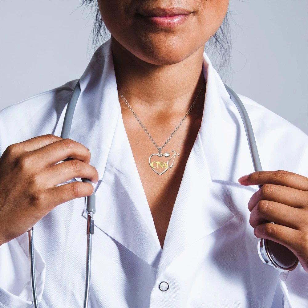 Description This unique pendant design makes a great gift for any nurse. The end of the stethoscope has a cute little heart. This necklace comes in a nice black velvet bag for storage and presentation. This necklace is silver plated but it is not suggested that you wear it in the bath or while working out. Cleaning; Just wipe with a soft cloth. 18k Sterling Silver Plated Alloy Pendant Strong necklace if breaking occurs within three years we offer free replacement. Chain Length:457mm (18"), Pendant dimensions: 25.4mm x 20mm Packing: Nice Black Velvet Bag with Logo Perfect nurse gift for any registered nurse in the medical profession. Expressing love to sweethearts, spouses or friends. Beautiful Heart Shaped Stethoscope Necklace with "RN" Registered Nurse letters. This is a wonderful gift for a nurse. This necklace honors their achievements and can be given as a nursing school graduation gift. This stylish necklace features a lovely heart shaped stethoscope that makes a personal, close gift for any loved one.