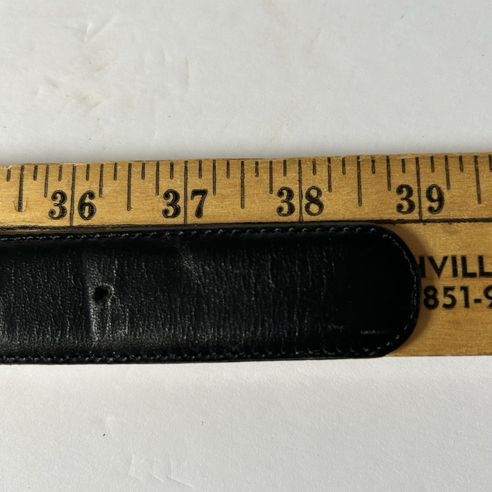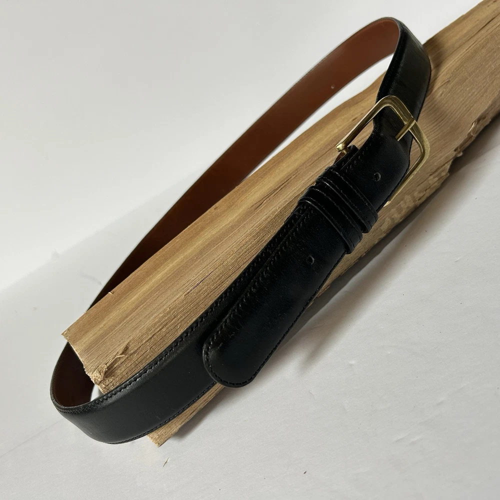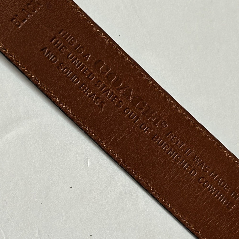 This is a men's black leather dress belt made by Coach. It features a solid brass buckle and is 1 1/8" wide. The belt is size 34 (85 cm) and has an adjustable buckle for a comfortable fit. The belt is designed with a classic, solid pattern and is made in the United States. It has a designer and USA theme. OVERALL belt length is 39” SEE last photo for minor wear on brass buckle