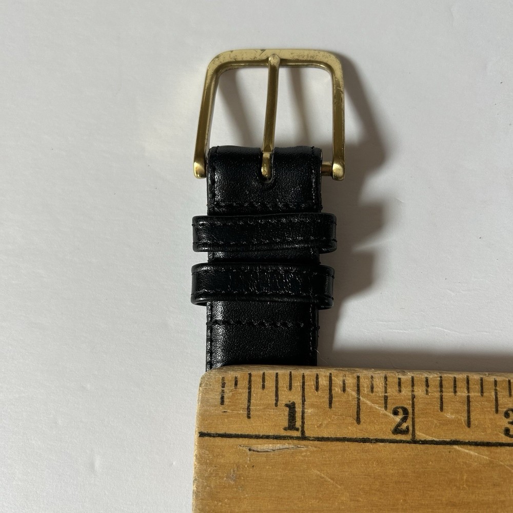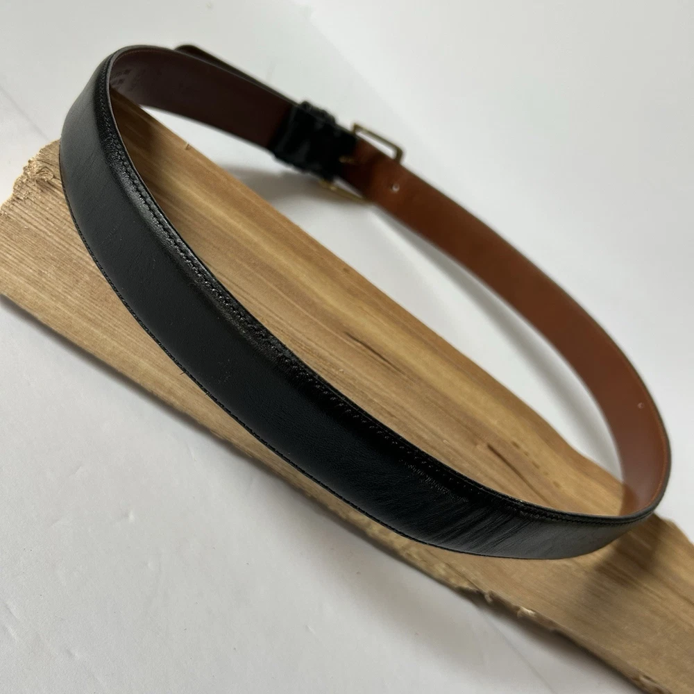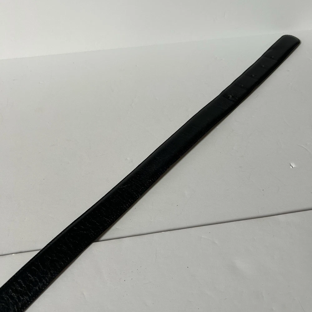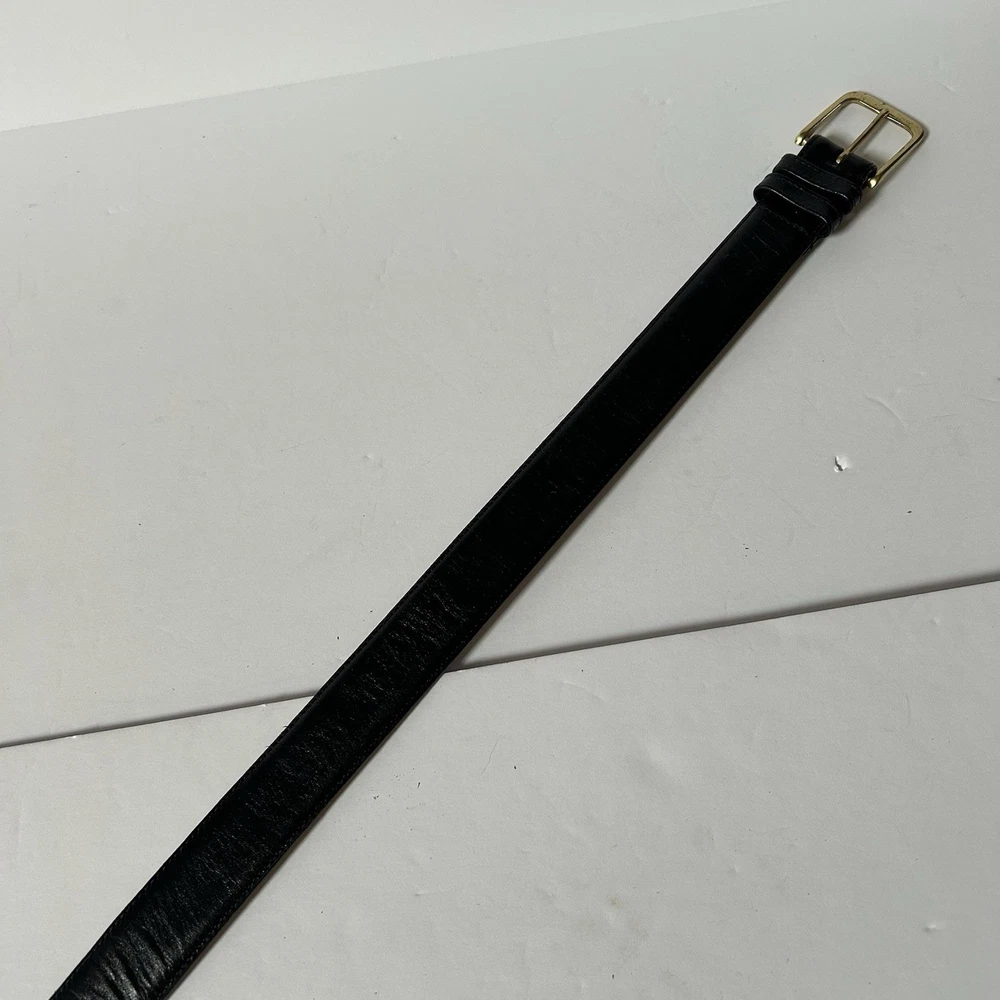 This is a men's black leather dress belt made by Coach. It features a solid brass buckle and is 1 1/8" wide. The belt is size 34 (85 cm) and has an adjustable buckle for a comfortable fit. The belt is designed with a classic, solid pattern and is made in the United States. It has a designer and USA theme. OVERALL belt length is 39” SEE last photo for minor wear on brass buckle