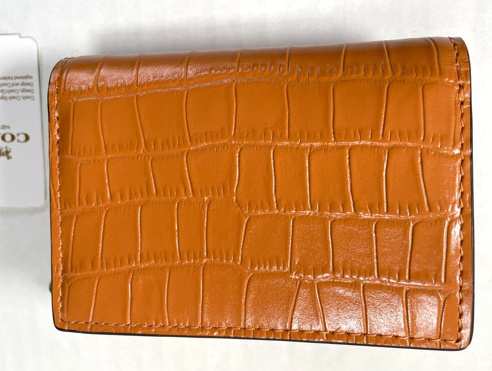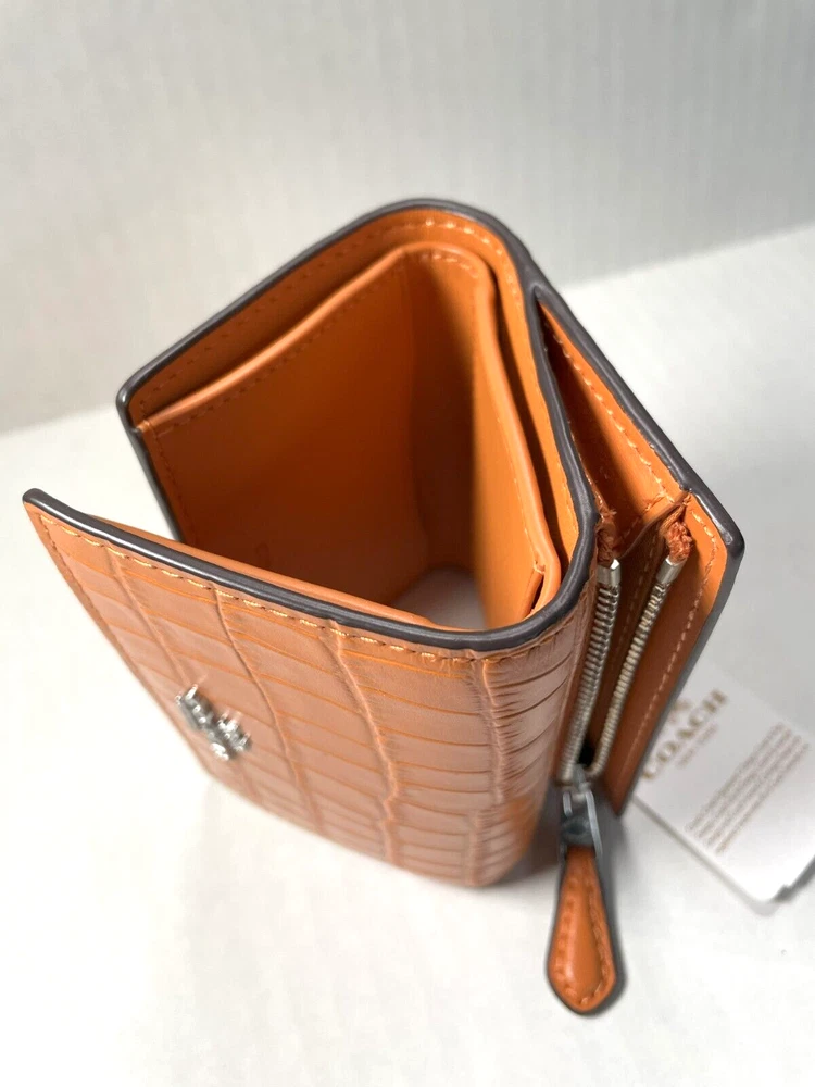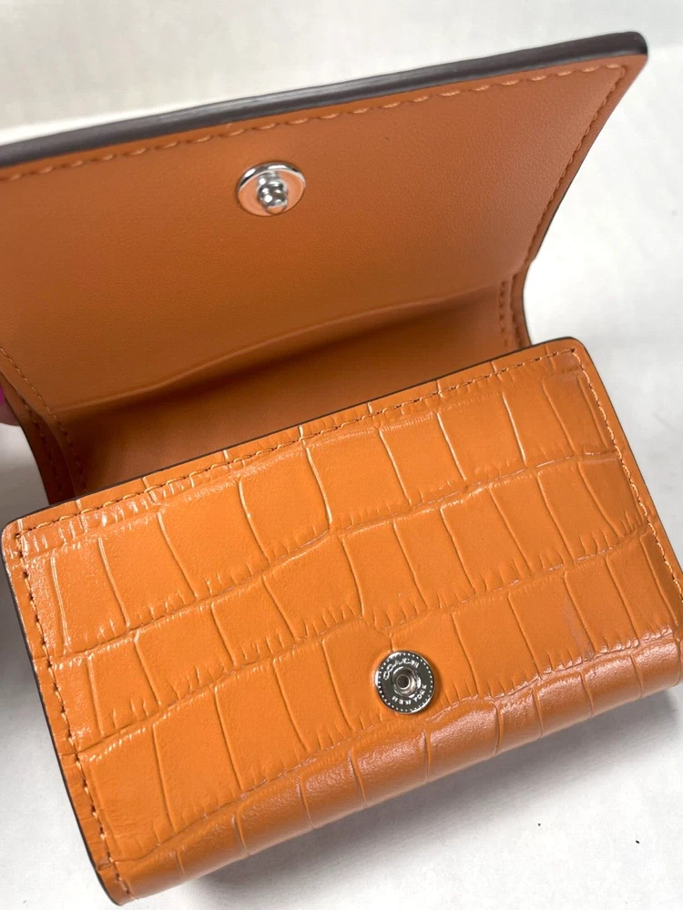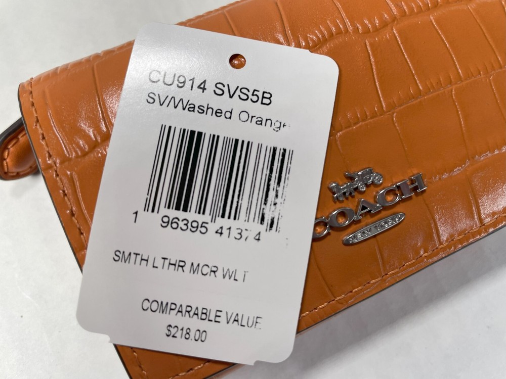 COACH CU914 Crocodile-embossed Leather Micro Wallet New with original price tag Absolutely Authentic! MSRP: $218.00 Color: Washed Orange Style: CU914 Description: Crocodile-embossed leather and smooth leather Front logo metal, in silver tone Snap closure Zip coin pocket Three credit card slots Full-length bill compartment Length: 4 inches Height: 3 inches Width: 1.25 inch Please let me know if you have any questions. Comes from a smoke free house. -------------------------------------------------------------------------------------------------------------- Your purchase will be shipped in 24 hours once payment is received and verified. You will be notified of the shipping date via E-Mail -------------------------------------------------------------------------------------------------------------