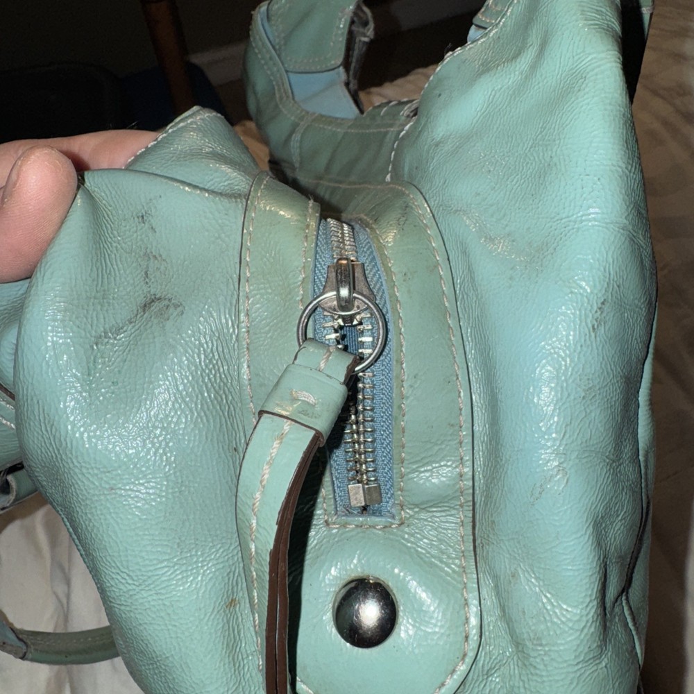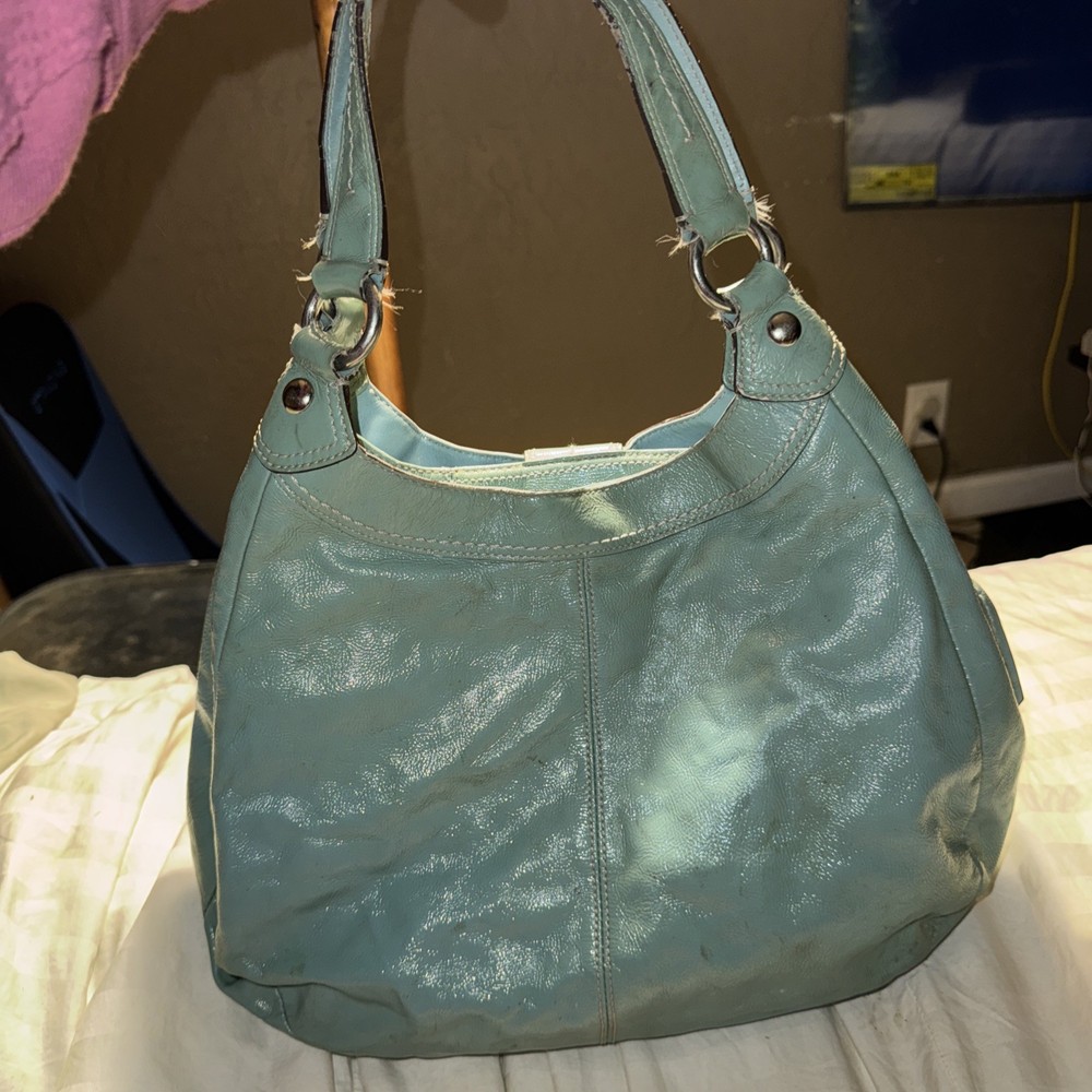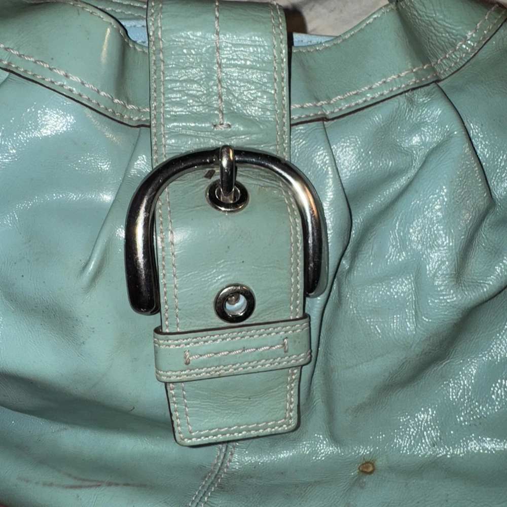 The Coach F16603 Medium Vintage Lynn Soho Light Blue Patent Leather Hobo is a stylish and classic handbag designed for women. Made from a combination of patent leather and canvas, this hobo bag features signature C pattern and hardware in silver. The medium size, brown handle/strap, and fabric lining make it versatile for everyday use. The vintage design adds a touch of timeless elegance to the Coach Soho product line, making it a chic addition to any wardrobe.