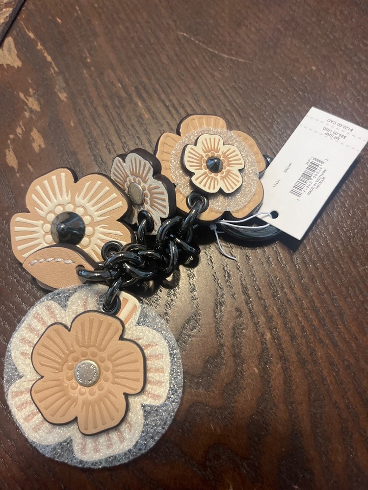 The COACH Tea Rose Bag Charm Key Ring in Gunmetal is a stylish accessory for women featuring a floral Tea Rose pattern in a Beechwood color. Made from leather and metal with studded accents and the Coach logo, this detachable charm is perfect for adding a touch of sophistication to any bag or keychain. The elegant design and quality materials make it a chic addition to any outfit, making it a must-have for any fashion-forward individual. NWT. Shipping in USA