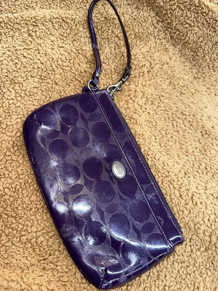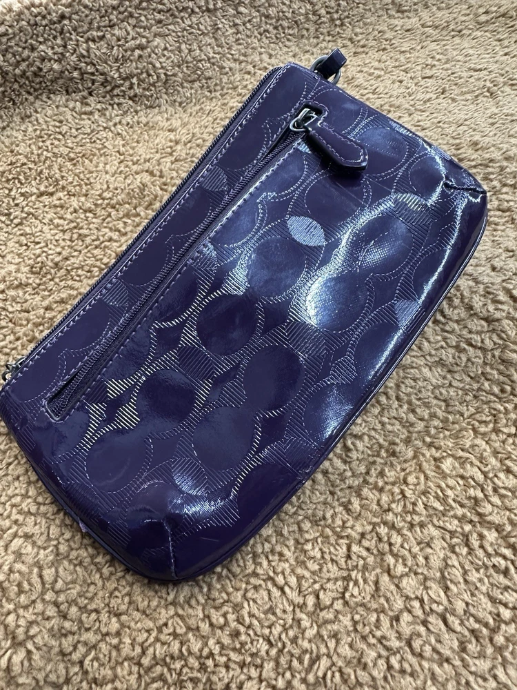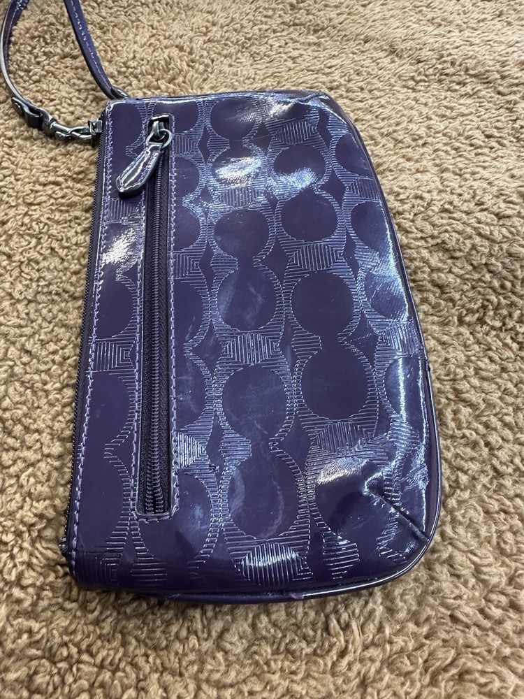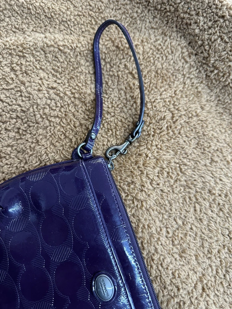 Coach New York signature purple glossy monogram wristlet wrist pouch bag purse handbag women’s Style code - F52078 / H1453 In excellent condition has been well taken care of Perforated leather glossy purple Metallic very unique Signature coach monogram print Shipped usps mail with tracking confirmation Thanks for viewing and have a great rest of your day