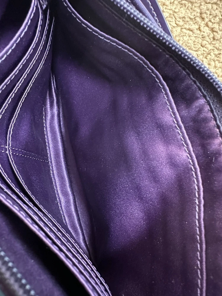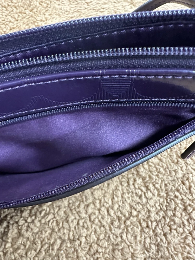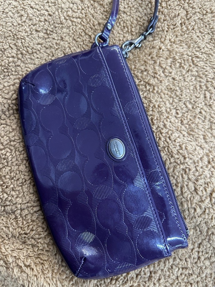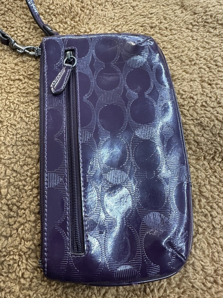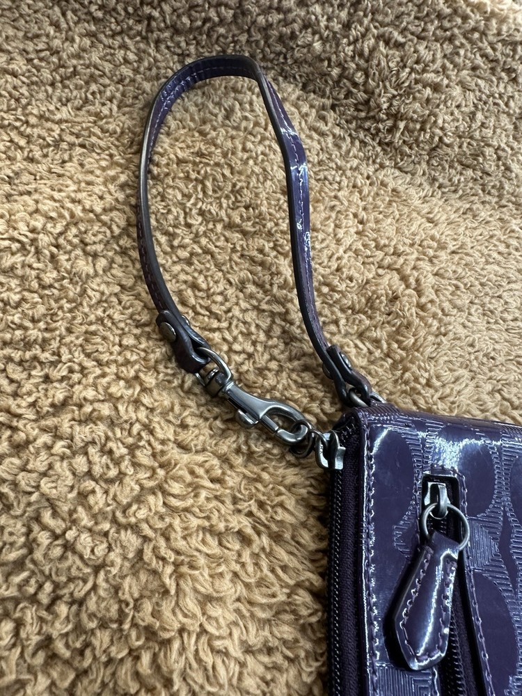 Coach New York signature purple glossy monogram wristlet wrist pouch bag purse handbag women’s Style code - F52078 / H1453 In excellent condition has been well taken care of Perforated leather glossy purple Metallic very unique Signature coach monogram print Shipped usps mail with tracking confirmation Thanks for viewing and have a great rest of your day