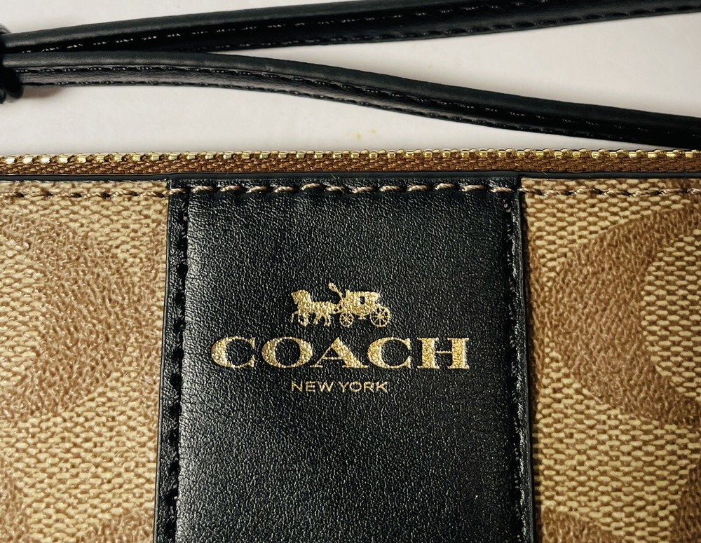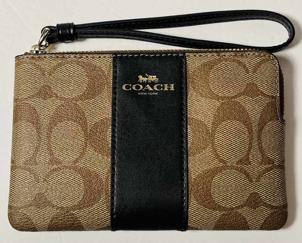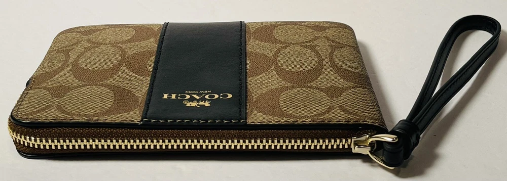 COACH Signature Khaki Black Corner Zip Wristlet Wallet Women Brand New