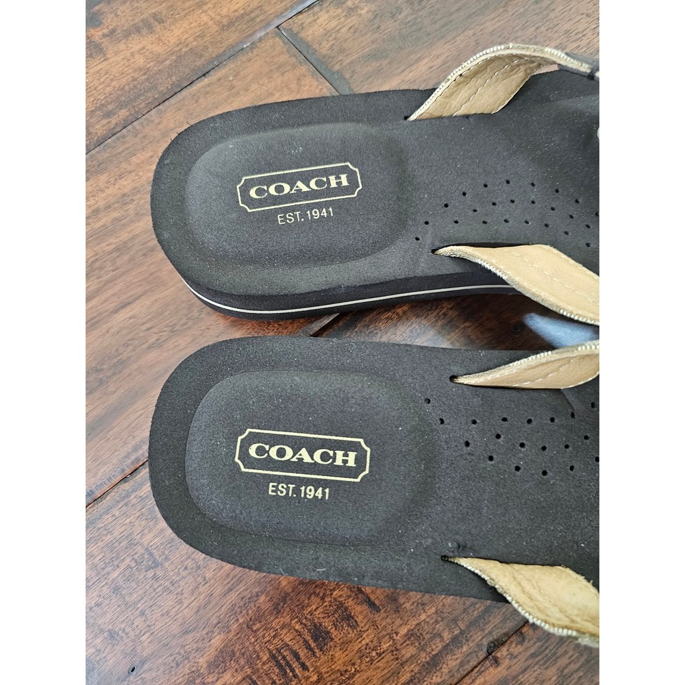 COACH Women's Flip Flops Wedge Thong Round Toe Brown Color Logo Print.Size 9.5B . Pre owned but great condition. Please view pictures.