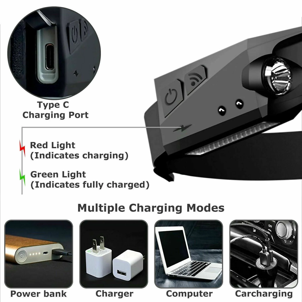 eBay COB LED Headlamp USB Rechargeable Headlight Torch Work Light Bar Head Band Lamp Brand New High Quality - Large luminous surface, wider coverage of light, will not dazzle the eyes. Small size, lightweight, easy to use and easy to carry. Adjustable headband, ergonomic design. Double switch design (sensor switch + power switch). Built-in rechargeable lithium battery, supports charging of multiple USB devices. Suitable for: daily carrying, caving, patrolling, camping, teaching, hunting, hiking, searching, night fishing, night riding and other outdoor scenes. Specifications: Color:Black Material: ABS Voltage: 3.7V Power: 10W Lamp beads: COB+XPE Lumens: 350LM Charging: USB Charging Battery: Built-In Lithium Battery Battery Capacity: 1200 mAh Charging time: 2.5hrs Battery time: 2.5-8hrs (depends on the mode you use) Lighting mode: ( High/ Low/ Strobe(long press the ON/OFF switch)/sensor switch Maximum range: 150ft Waterproof rating: IPX5 Weight: 2.5oz Easy Use Easily utilize any of the LEDs from XPE or COB LEDs. Including a sensor switch so you can wave your hand instead of depressing a button. This is very advantageous when your hands are full. The headband is elastic so fits all sizes, you can also adjust the buckle for an even tighter fit. Utilize Light Use the XPE LED when you need to pin point light to a certain area or turn on the COB light to enlighten the whole scene. Never be in the dark again. USB Charging - Massive 1200mAh This COB headlamp includes an on board Lithium Ion battery with a capacity of 1200mAh, enough to have continuous use for over 8 hours. Also only 2.5 hours to charge your headlamp from 0-100 giving you fast charge features. Multiple Charging Modes Red light indicates charing, while green light indicates full charge. Utilizing the USB C technology, you can charge your headlamp at ultra fast speeds. IPX5 Waterproof It's perfect for anyone, no matter the rain, snow, indoors, outdoors, splashing, any conditions! Package includes: 1 x COB LED Headlamp USB Rechargeable Headlight Torch Work Light Bar Head Band Lamp 1 x USB Charge Cable Shipping Information: Your item Ships Same Day to 1 Business Day from our California Location.