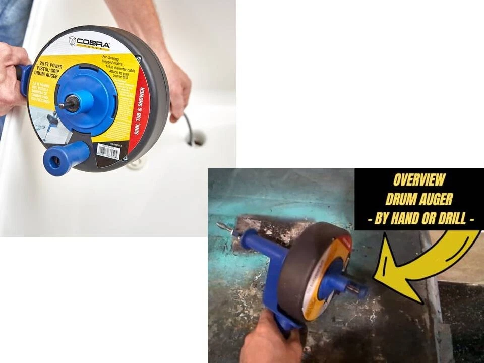 COBRA 86250 Pistol-Grip Power Drum Drain Auger (1/4'' Dia. x 25' Ft. L Cable) Designed for most sink, shower and tub drains, this power pistol grip drum auger can be operated manually or with an attached drill motor. It features a center-balanced pistol grip that helps improve control and offers a comfortable operation. The auger features quick lever cable lock provides fast, simple and secure cable adjustments. Great for clearing stubborn clogs. For clearing sink, shower, and tub drains Versatile pistol grip with quick release cable lock Has attached for use with power drill Quick lever cable lock for faster adjustment Center balanced grip for better control High carbon spring wire Rugged drum design of high impact plastic Can be used either manually or attached to your power drill for power operation Connects to your drill for faster cleaning For most sinks, showers and tub drains Long lasting Soft Rubber grip High-impact polymer drum housing for durability 25 ft cable with 1/4 in Dia provides adequate reach into drains helping clear household clogs Use to clear 1-1/4 to 2 in lines Lever-style cable lock secures cable in place and allows for easy adjustments Screw construction Operate manually or with a drill motor Use with a drill motor to provide extra power against stubborn clogs Pistol-grip handle with rubber over mold helps minimize hand fatigue and enhance comfort during operation Power Source : Manual, Power Drill Drain Line Capacity : 1/4 to 2 in Cable Diameter : 1/4 in Cable Length : 25 ft Handle Type : Pistol-Grip Drum Material : Polymer