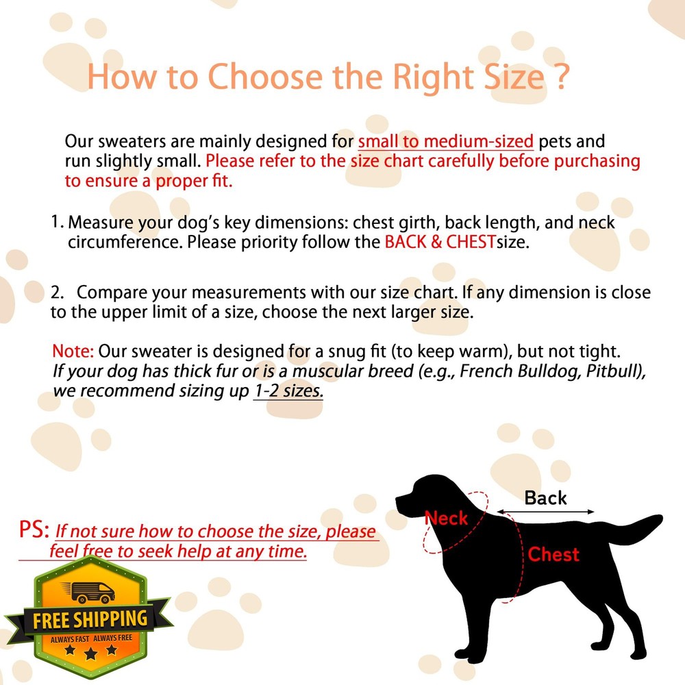 COJBPET Small Dog Sweater Orange XS Turtleneck Holiday Features Size Guide: Runs Small, please check SIZE CHART BEFORE PURCHASING. Measure your dog's chest girth, back length, and neck circumference, then match with the size chart; our dog sweater is designed for a snug fit (to keep warm), but not tight. If your dog has thick fur or is a muscular breed (e.g., French Bulldog, Pitbull), we recommend sizing up 1-2 sizes XS Dog Sweaters: Please priority follow the BACK size. XS size sweaters fit backs-approx.8.27-9.06", chests-approx.8.27-9.84", and necks-approx.7.09-8.66".Only suitable for mini and small dogs boy and girl Premium Warm Material: Crafted from 100% high-quality acrylic, the dog sweater is soft, skin-friendly, and breathable—no irritation to your pet's skin, keeping them cozy and warm throughout winter Turtleneck Pullover Design: Turtleneck pullover style wraps snugly around the neck, chest, and belly for optimal warmth. Boasting strong elasticity, it's effortless to put on/take off while fitting comfortably Anti-Shift Leg Straps: Elastic leg straps let the sweater stretch with your pet's movements, preventing shifting or riding up. Ensures freedom during running, jumping, or bathroom breaks, and avoids snagging on furniture/branches Stylish & Versatile: The dog sweater features classic solid-color design and comes in five colors: pink, rose red, red, orange, and blue, it's perfect for Small breeds (Chihuahuas, Yorkshire Terriers, Bulldogs, etc.). Ideal for holidays (Christmas, Halloween, Thanksgiving) or everyday cozy wear Shipping Free & Fast Shipping: We offer free shipping to most of the USA with a normal delivery time of 3-7 days. However, due to the current situation, additional delivery time (up to 3 weeks) may be required for some items. Alternative Carriers: We may use alternative carriers (e.g., USPS, FedEx, UPS) to ensure your package arrives safely and on time. Due to the use of multiple carriers, we are unable to provide a tracking number automatically. Handling Time: Orders are processed and shipped within 1-2 business days of receiving cleared payment. Shipping Restrictions: Shipping to Alaska, Hawaii, Puerto Rico, Guam, and other US territories may incur shipping charges or delivery restrictions. Please contact us before ordering, or your order can be refunded/cancelled. State Restrictions: Certain items may not be shipped to California due to state regulations. Contact for Tracking Updates: If you require tracking updates or have any concerns about the delivery of your order, please feel free to contact us, and we will be happy to assist you. Return Policy 30-Day Hassle-Free Returns: If you are not completely satisfied with your purchase, you can return the item for free within 30 days of receiving it for a full refund or exchange. Easy Return Process: Contact us, and we will provide you with a prepaid return shipping label and detailed instructions. No Restocking Fee: There are no restocking fees for returns. However, the buyer is responsible for return shipping costs if the return is not due to a seller"s error. Refund Processing: Refunds will be processed within 1 business day of receiving the returned item in its original condition. Feedback Your feedback is extremely important to us. We strive to provide the best products and customer service possible. If you are satisfied with your purchase, please take a moment to leave us a positive review. If you have any concerns or issues with your order, please contact us before leaving negative feedback. We are committed to resolving any problems and ensuring your satisfaction. Contact Us If you have any questions or concerns, please feel free to reach out to our customer support team. You can contact us through the eBay messaging system. We are available Monday to Friday, 9:00 am to 5:00 pm EST, and we will do our best to respond to your inquiry within 24 hours. Thank you for supporting our small family business! ]]>