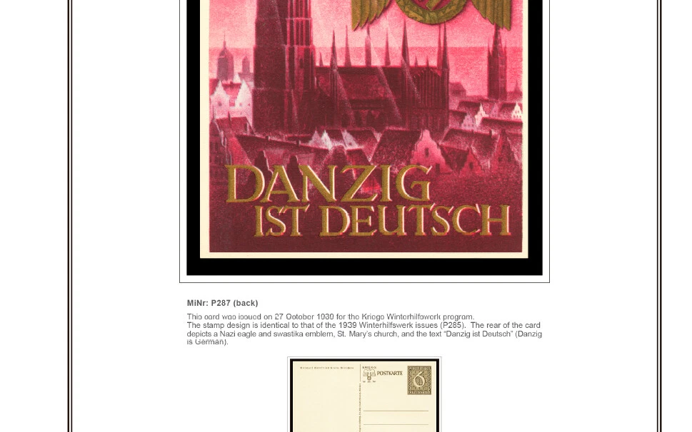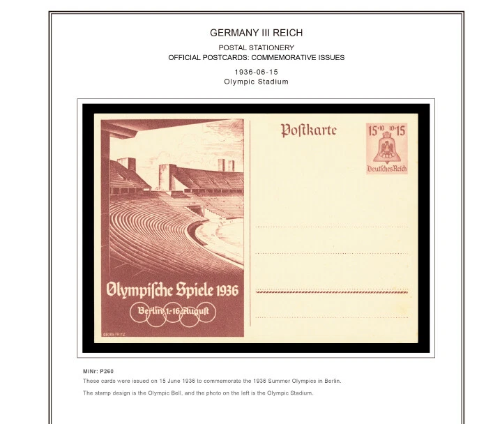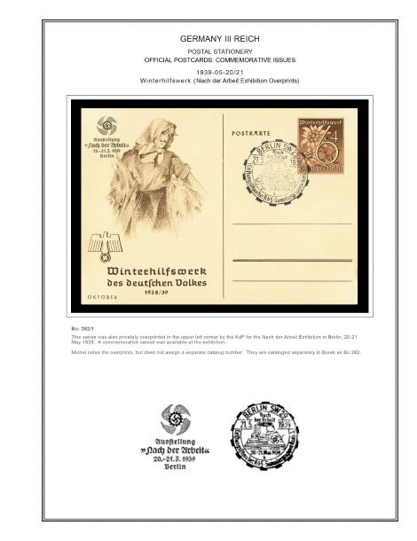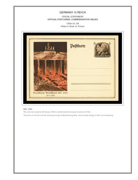 GERMANY III REICH STATIONERY: OFFICIAL POSTCARDS [ Postkarte Deutsches Reich | Vol.01: Hindenburg Definitives+Airmail Issues+Hitler Definitives & Vol. 02: Commemorative Issues ] 1933-1944 COLOR PRINTED STAMP ALBUM PAGES (169 pages) Full color printed pages f o r Germany III Reich official postcards 1933-1944 . The postcard illustrations are ordered chronologically and according to Michel catalogue. Top quality color stamp album pages printed on heavy stock 200 g/m 2 (75 lbs cover weight) acid-free couchet silky white paper. US letter size 8.5 x 11” . Technical Specifications: Country Germany (III Reich) Period 1933-1944 Print Full color Paper 200 g/m 2 (75 lbs) Nr. Pictures 169 (100% coverage) Package Weight 1/1.23 kg (2.20/2.71 lbs) NOTE: Info on postcard emissions, front /back illustrations and postmark pictures displayed (when/if available). Please note: These are full-color printed pages. They are NOT hingeless. For protection of both the pages and the postcards, we recommend using stamp mounts or similar instead of hinges. The pages are sent unpunched – this allows you to punch them as needed (for 2 or more ring binders). Black and white printing available on request. NO POSTCARDS INCLUDED. INTERNATIONAL STANDARD SHIPPING [Contact us first if you desire registered shipping or for shipping rates within Europe] [Stampextras won´t be responsible for losses under international standard shipping ] GERMANY III REICH OFFICIAL POSTCARDS 1933-1944