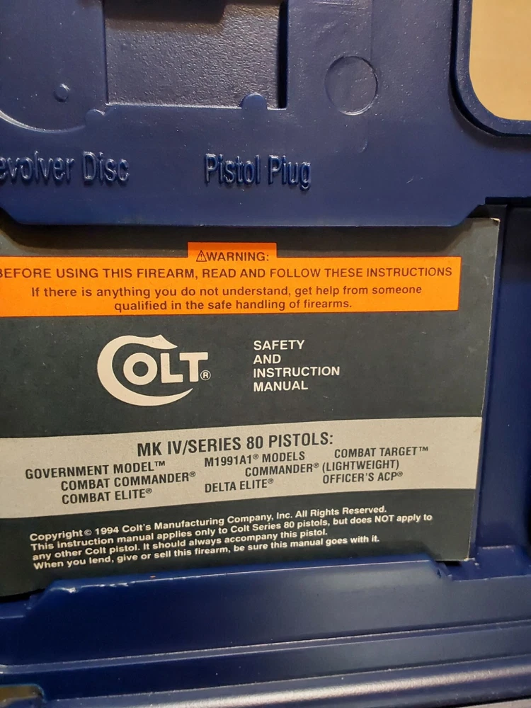 COLT ORIGINAL 1911 GUN BOX/ CASE FOR GOVERNMENT 45 acp 5" BARREL BLUE FINISH 1994 MODEL WITH ALL PAPERWORK PICTURED AND FACTORY LOCK. PAPERWORK INCLUDES 1994 SAFETY MANUAL MK IV SERIES 80 PISTOLS SHIPPED USPS GROUND ADVANTAGE PLEASE CHECK OUT ALL MY OTHER COLT BOXES