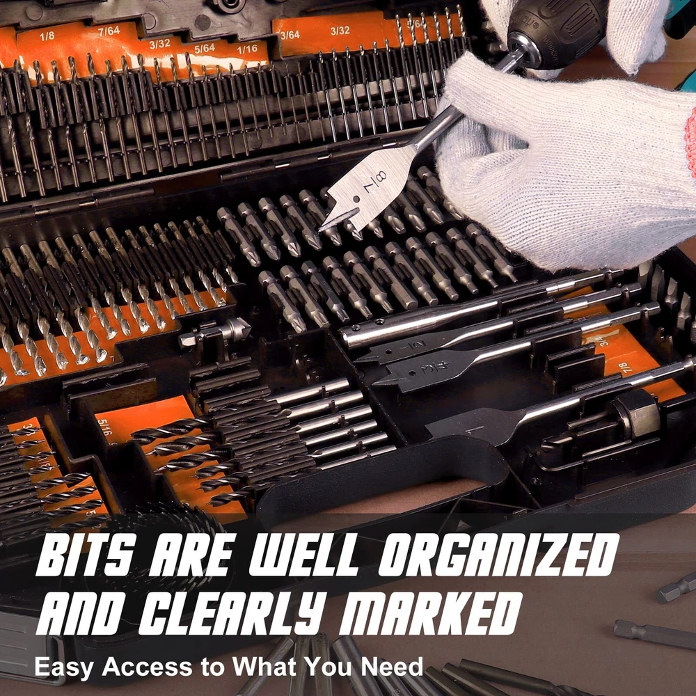 【ALL-IN-ONE CONVENIENCE】- COMOWARE 246 pcs drill bit set includes a wide variety of bits for wood, metal, masonry drilling and screw driving. It is a must-have drill driver bit set in your home garage. Ideal for DIY project and home repair. 【CAPABILITY & DURABILITY】- Drill bits and screwdriver bits are made from superior HSS material for improved strength and durability. And the titanium finish and black oxide coating help the bits deliver higher drilling performance on wood and metal. Whether you are a mechanic or a DIY enthusiast, this drill bits combo kit will assist you in every application. 【WELL ORGANIZED CASE】- The 246 pcs drill bits sets come with a portable storage case with uncluttered layout. There is a sponge cushion inside to help prevent the drill bits from falling off or mixed use. And the orange labels with drill bit sizes on are designed for easy identification of the bit size. 【COMPLETE DRILL ACCESSORIES KIT】- Screwdriver bit set: 66 x 1" screwdriver bits, 30 x 2" screwdriver bits, 6 x nut drivers and 2 x hex keys. Twist drill bit set: 57 x HSS titanium drill bits, 30 x HSS black oxide twist drill bits, 21 x masonry drill bits, 4 x drill stoppers, 17 x brad point drill bits, 4 x spade drill bits, 1 x extension bit. Other accessories: 4 x hole saws, 1 x arbor adapter for hole saws, 1 x countersink, 1 x nail punch, 1 x bit holder. 【WARRANTY & GIFT IDEA】- We will gladly send you the replacement set if you are unhappy with any parts of this kit. The titanium drill bit set, brad point drill bit set, masonry drill bit set, spade drill bit set, hole saw kit and screwdriver bit set are sold separately in COMOWARE, which can be the good replacement or supplement to your toolbox. This drill driver bit kit combines the versatility and practicality that homeowners would appreciate. It is a nice gift-giving option as well.