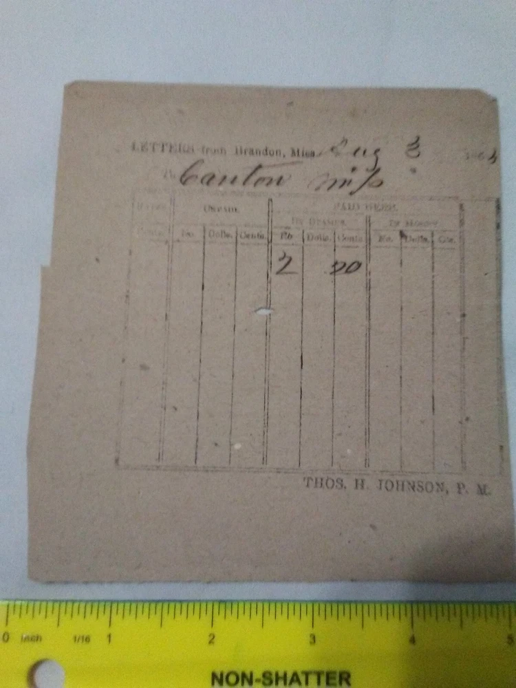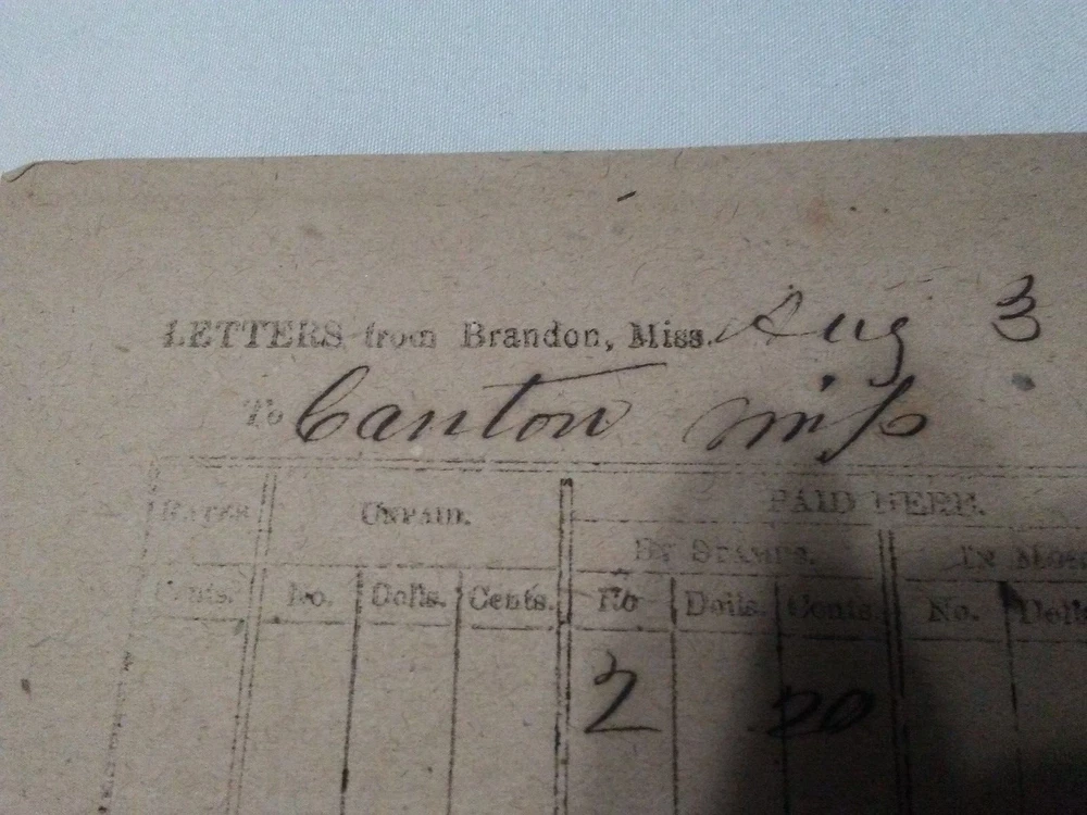 Confederate postal receipt for letters transferred from Brandon, MS to Canton, MS Aug. 3, 1864. In good condition with a small hole where it was placed on a spindle. Measures approximately 5 inches wide by 5.25 inches tall.