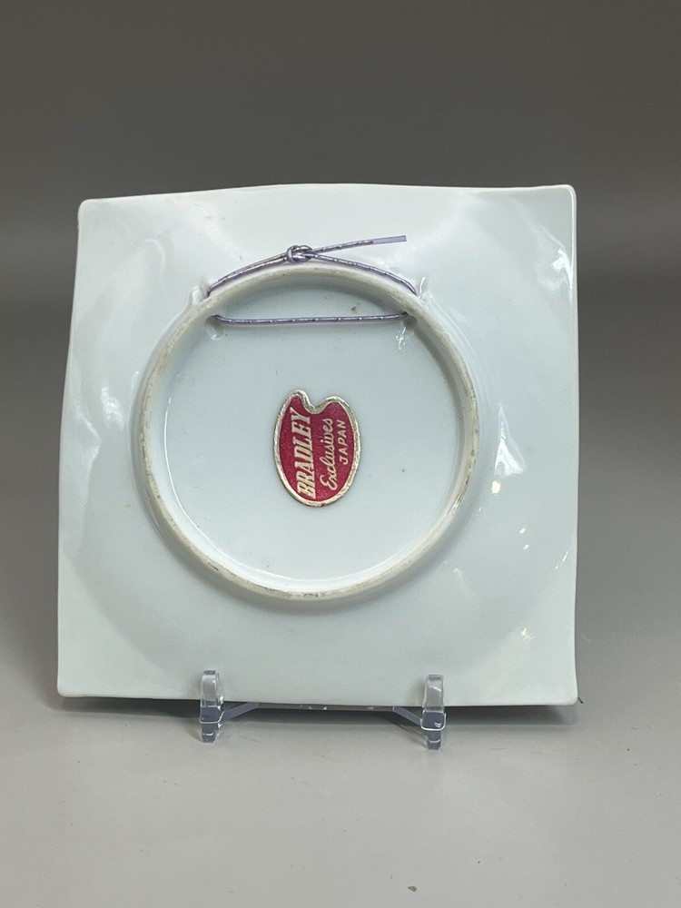 This vintage mini collector plate, titled "CONFUCIUS SAY SHE WHO INDULGES BULGES," is a decorative porcelain wall plate produced in Japan during the mid-20th century. The plate has a diameter of 4 inches and features a multicolor design. It is part of the Bradley Exclusives brand and is ideal for use as a jewelry tray or ring holder. The plate showcases a decorative style with art pottery production techniques, making it a charming and unique collectible item for all occasions.