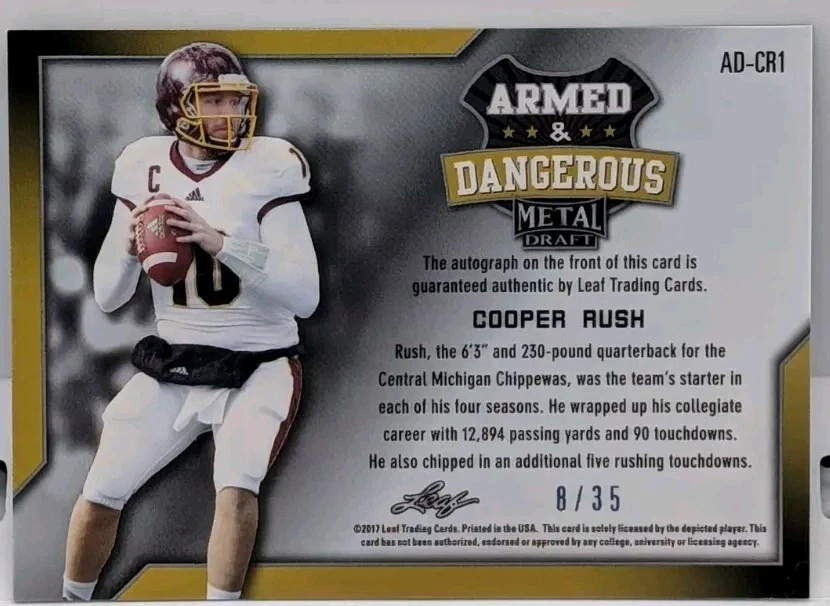 COOPER RUSH 2017 Leaf #08/35 Armed & Dangerous Metal Draft BLUE ROOKIE Auto. Condition is Ungraded. Shipped with USPS Ground Advantage.