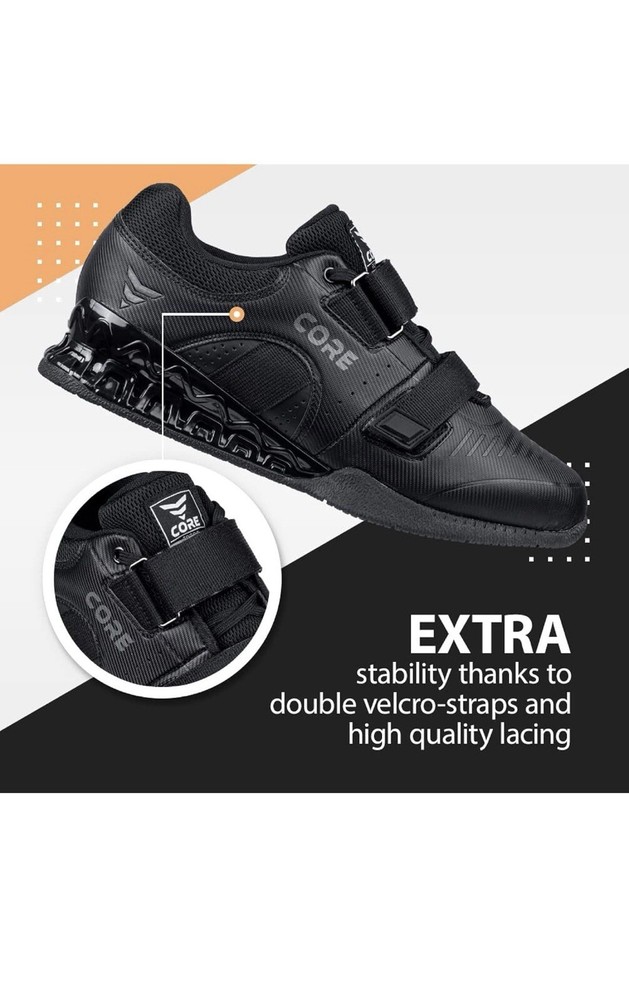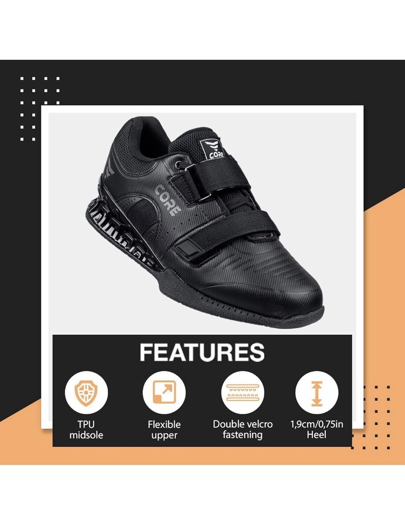 Elevate your workout routine with the CORE Weightlifting Shoes, designed for both men and women seeking to enhance their lifting experience. Featuring a subtle 0.75-inch heel lift, these shoes provide the perfect combination of comfort and support during your weightlifting sessions. The sleek black color and low-top design make them versatile enough to pair with any gym attire. Constructed with durability in mind, these shoes boast a standard shoe width and come in a US size 9, ensuring a snug and secure fit. The lace-up closure ensures a comfortable fit while you lift, and the trusted CORE brand signifies a commitment to quality. Get ready to lift with confidence and style.