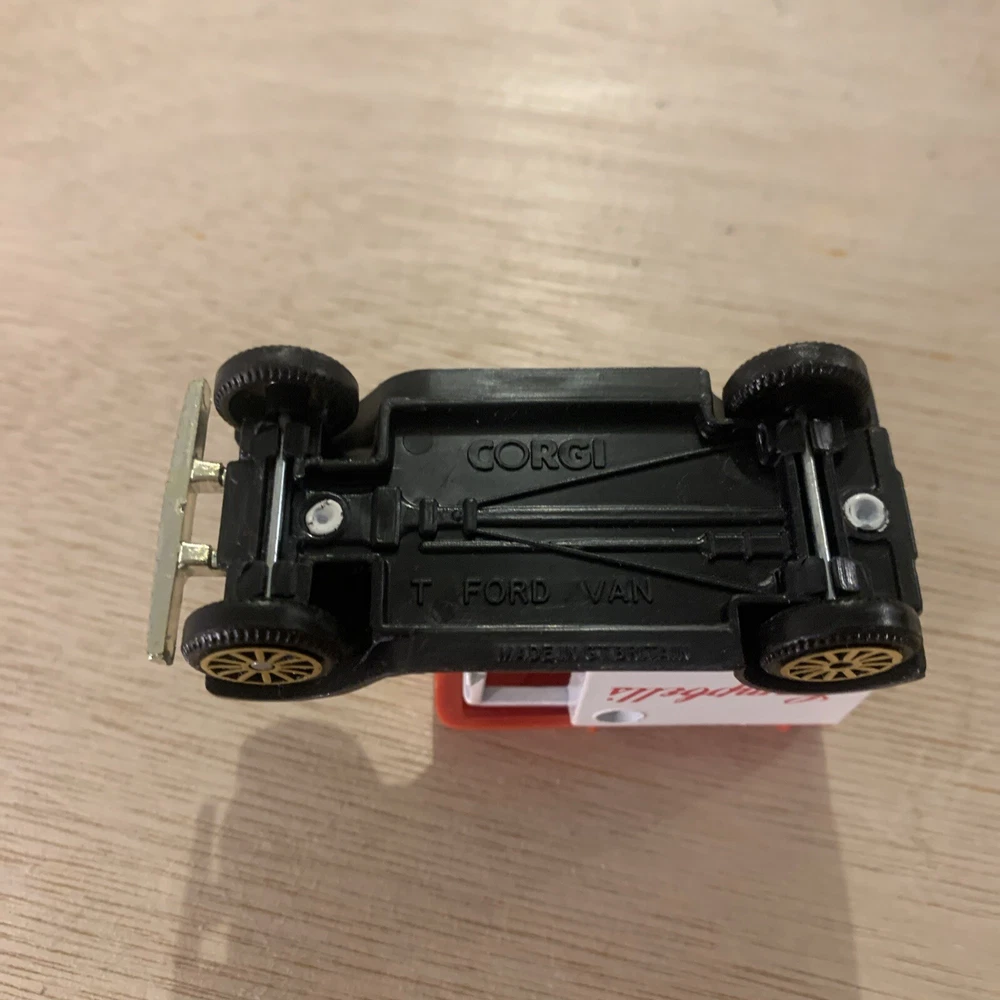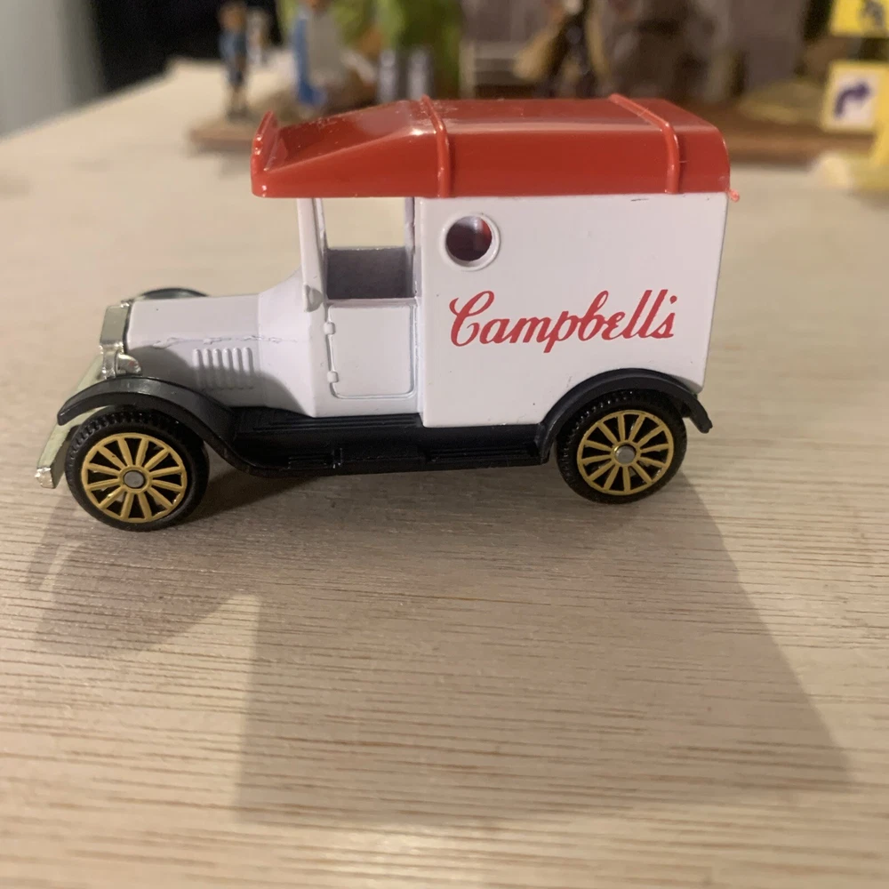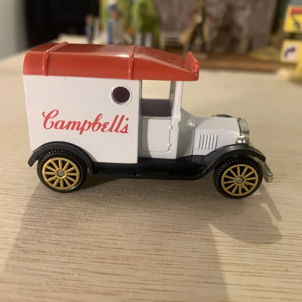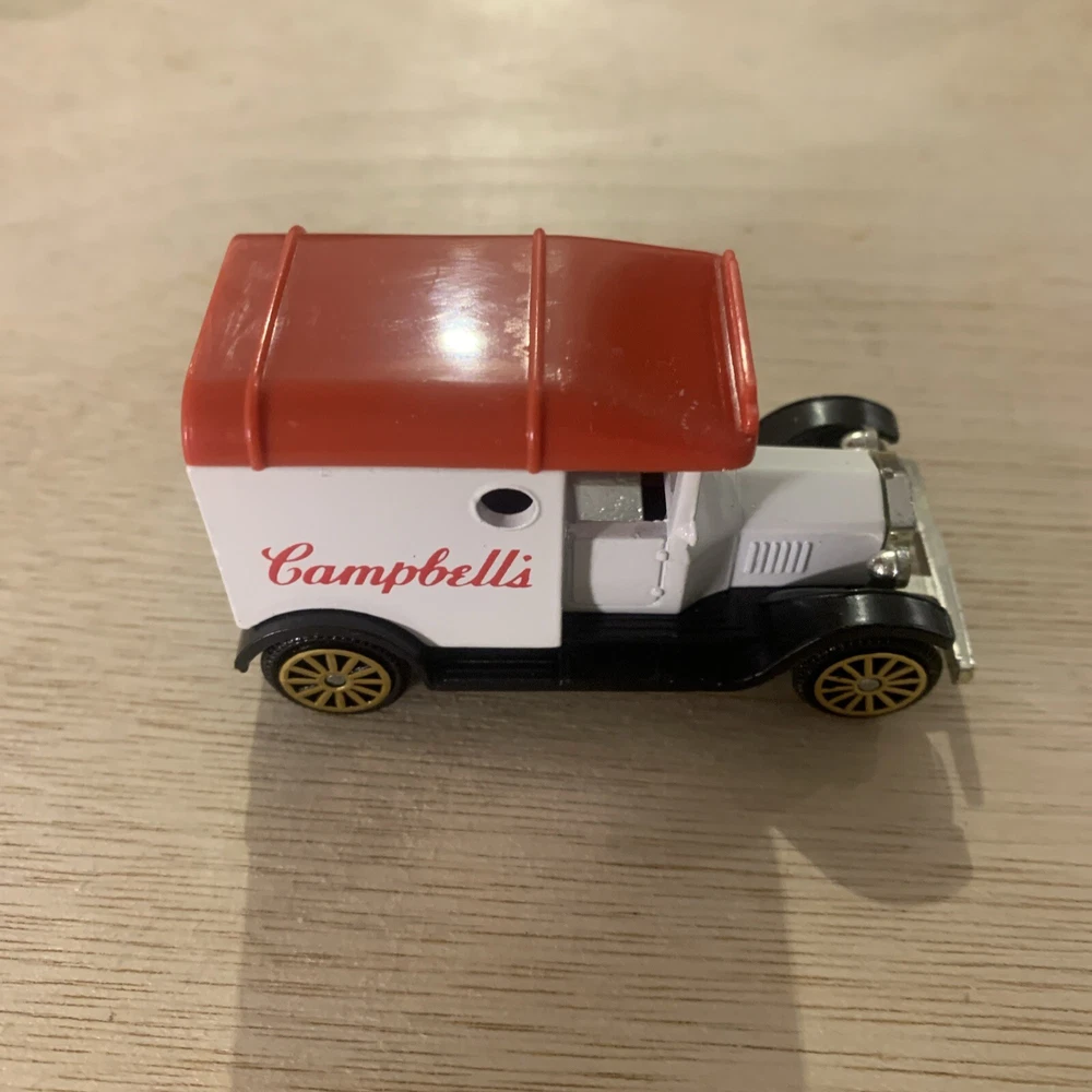 This is a Corgi diecast model of a Ford Model T van featuring a 'Campbells Soup' theme. The scale of the model is 1:64, and it is designed in red, white, and black colours with chrome detailing. Made in the United Kingdom, this collectible item is in mint condition, unmodified from its original state. Perfect for collectors of diecast vehicles, this Corgi model T Ford captures the nostalgia of the iconic Campbells Soup branding in a detailed and high-quality miniature form.