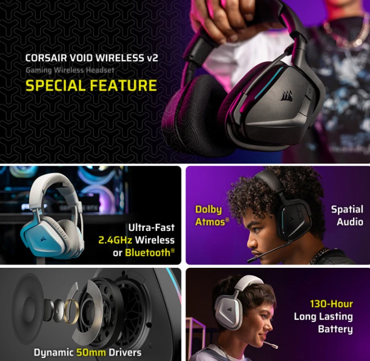 Elosia Company - 100% Genuine Trusted Seller Guaranteed. - CORSAIR VOID v2 RGB Wireless Gaming Headset Black, 100% Genuine, NEW - EXPRESS Ultimate Wireless Gaming Audio with Stunning RGB Design Experience immersive gaming sound with the VOID V2 RGB headset, designed for pro-level performance and long-lasting comfort. With a powerful 50mm neodymium driver, dual wireless connectivity, and up to 130 hours of battery life, it’s built to power through your longest sessions. Features 50mm Neodymium Drivers: Delivers rich and detailed sound from 20Hz to 20kHz. Omnidirectional Microphone: Crystal-clear communication with -40dB sensitivity. Dual Wireless Modes: Choose between 2.4GHz USB receiver or Bluetooth 5.3. Wireless Range: Up to 15m on 2.4GHz / Up to 9m on Bluetooth. Incredible Battery Life: Up to 70 hours on 2.4GHz / Up to 130 hours via Bluetooth (LED off). RGB Lighting: Dynamic lighting effects for a personalized look. USB Type-C Charging with USB Type-A wireless receiver. Bluetooth Profiles Supported: A2DP, HFP, HSP. Specifications Headphones Frequency Response: 20Hz ~ 20kHz Impedance: 32 Ohms @ 1kHz Sensitivity: 116dB (±3dB) Driver Unit: 50mm Neodymium Microphone Type: Omnidirectional Impedance: 2,200Ω Frequency Response: 100Hz ~ 10kHz Sensitivity: -40dB (±3dB) Wireless & Battery USB Wireless Receiver: USB Type-A Headset Charging Port: USB Type-C Wireless Range: Up to 15m (2.4GHz) / Up to 9m (Bluetooth) Bluetooth Version: 5.3 Battery Life: Up to 70h (2.4GHz), Up to 130h (Bluetooth, LED off) Battery Capacity: 1500mAh Size & Weight Dimensions: 105(L) x 170.5(W) x 193(H) mm Weight: 303g Shipping Payment Returns CUSTOMS CONTACT We ship to Worldwide. Your tracking number will be uploaded to your purchase history within 3-5 business days after your order is placed. It may take 1-2 more days on holidays and weekends. You cannot change your shipping address after payment is completed. Please make sure your address, name, and phone number are correct. We provide a variety of payment options. (Payoneer, Paypal, Gpay, VISA, MASTER, AMEX, DISCOVER) If we were not received your payment within 3 Days, we will cancel your order. All merchandise must be returned in its original and unused condition. Return shipping costs are to be borne by the buyer. Refunds are made excluding actual shipping and handling fees. (Cases for refunds are detailed below.) Refund is applicable according to below condition 1, 2 1. In case of below conditions, Shipping cost will be deducted. ALL accessories must be unused; ALL accessory packages must be unopened. ALL items must be intact and undamaged (except for defects in manufacturing). Items must be in good conditions with all original accessories, manuals, and packing materials. 2. In case of below conditions, Restock fee of the item price plus shipping cost will be deducted. Some accessories were used; ALL accessories in the package were opened. Some items were damaged (except for defects in manufacturing). Any missing parts or damaged items will result in rejection on the return. In case of any defectives found, only defects in manufacturing are accepted as the reason of return. After we receive the returned product, refund will be processed. We ship worldwide. Customs duties (10-20%) vary by country and are paid by the buyer. Please contact us via eBay message if you have any questions. Please contact us via eBay message. If for any reason you are dissatisfied with your transaction, please contact us via eBay message first to resolve the issue - it is not a feedback system. We will reply within 24 hours.