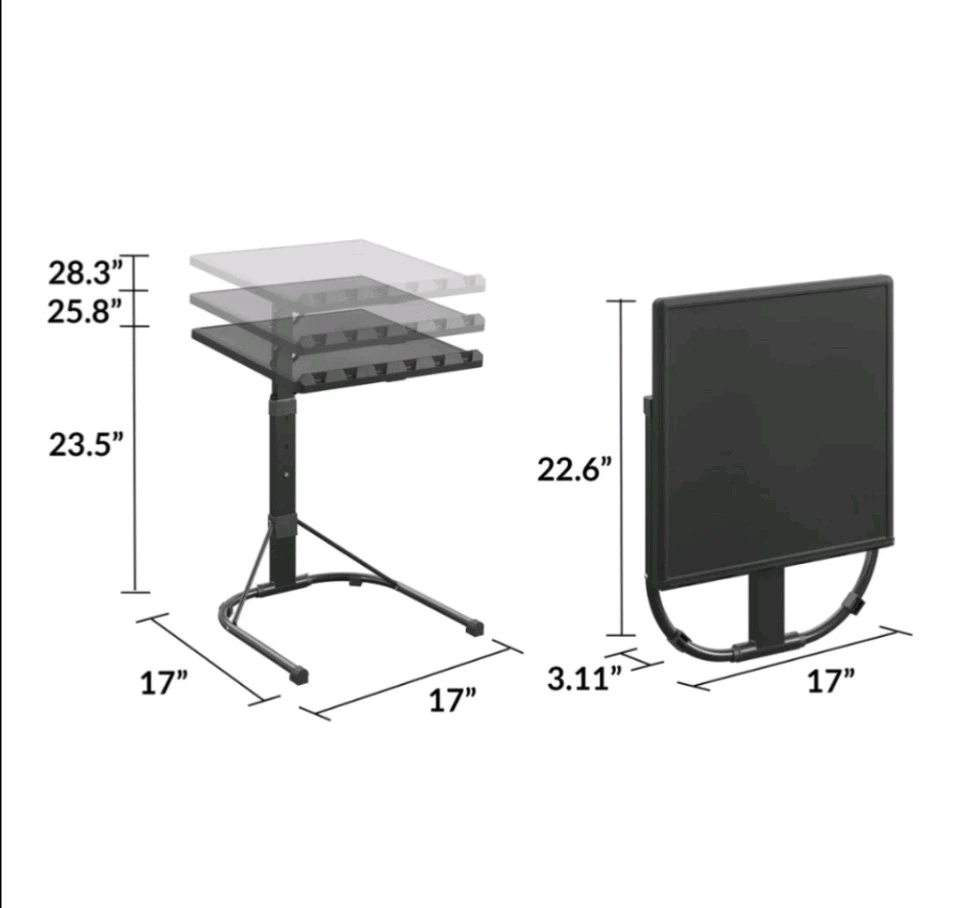 Brand New Space-saving addition to any home office or college dorm, perfect for snacking, homework, working remote, or simply everyday use Portable and user friendly, featuring multiple table angles and height options ranging from 23.5"H - 28"H Folds flat and compact, making it easy to store under the bed, couch, or in the closet when not in use Manufactured of easy to clean resin paired with a durable all-steel frame, ensuring long-lasting use 30 lb. distributed weight capacity rating The table top can be adjusted to 3 different angles 0 degree, 10 degree and 15 degree degrees.