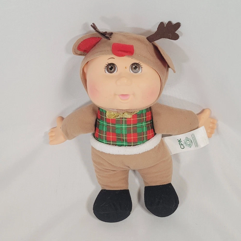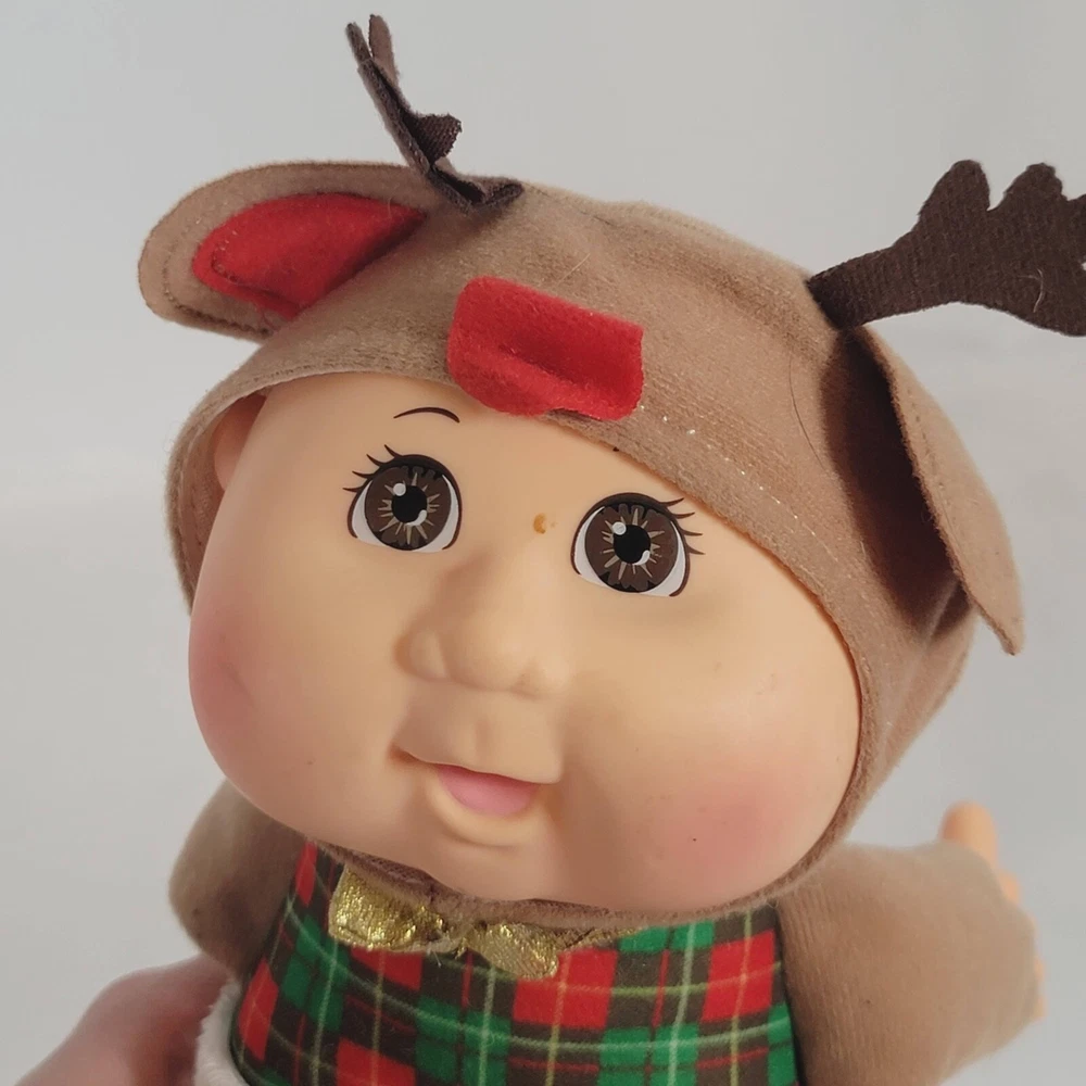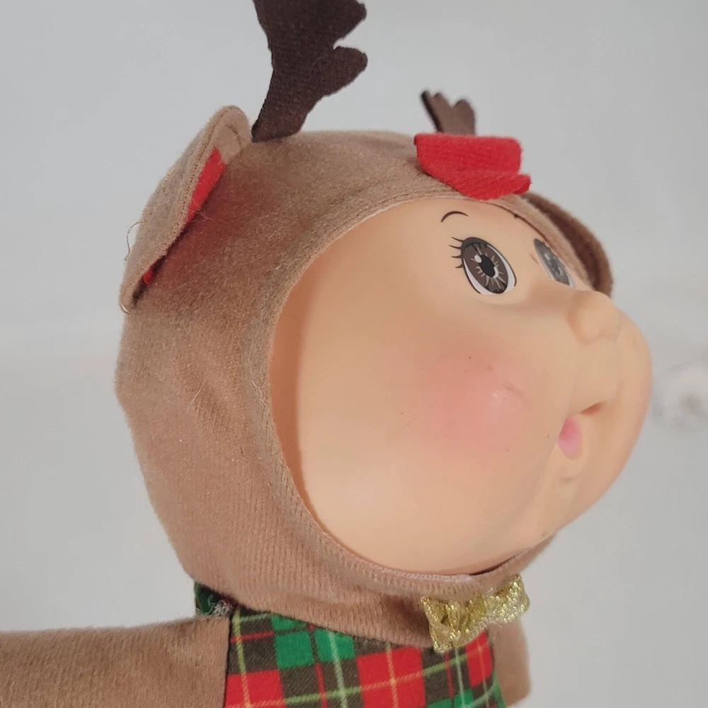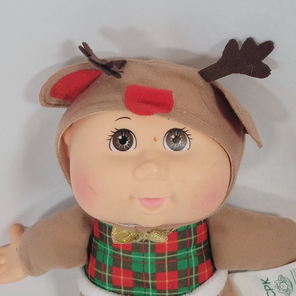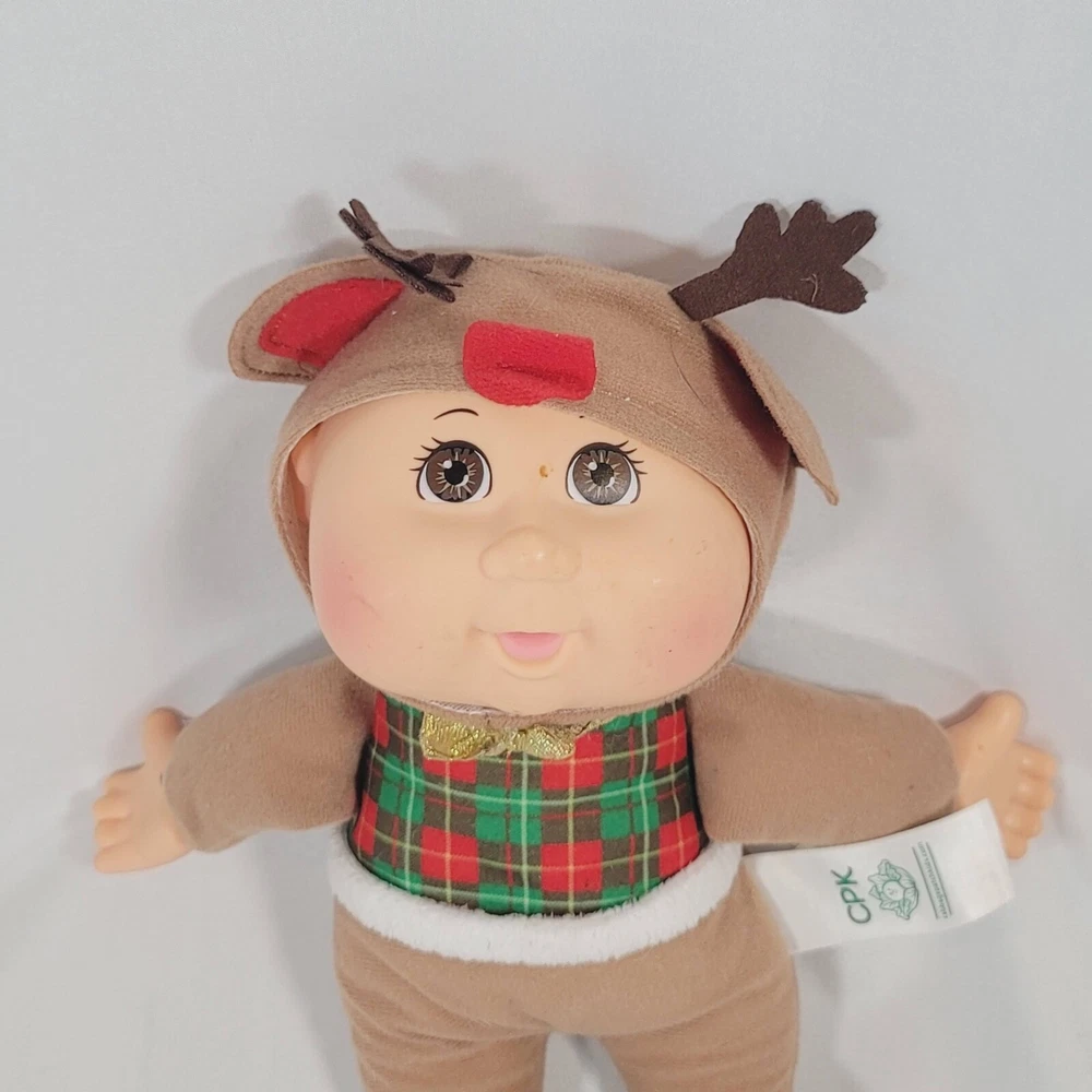 CPK Cabbage Patch Kids Holiday Helpers Tink Reindeer Christmas Plush Boy Doll - Light Skin, Bald, Brown Eyes. About 9" long, with a vinyl head and hands, cloth body, non-removable clothes (though his hat does come off; it stays attached to his outfit). He can suck his thumb. In played with, vintage condition. He's a bit dirty, some smudges/shine marks on his face from play. Outfit is in pretty good shape, may have some minor pilling. But he's cute and ready for lots more loving! Please see all pictures for exact cosmetic condition and other details, as they are part of the description as well, and ask any questions before purchasing. We are a husband and wife team with a growing family, and greatly appreciate your support of our small business. Please browse our eBay store for a variety of other Cabbage Patch items. We hope you enjoy this doll!