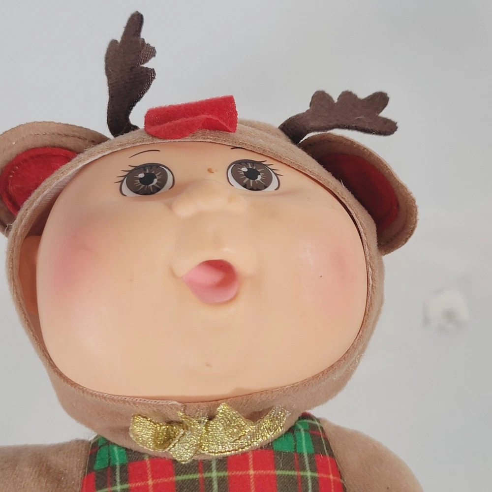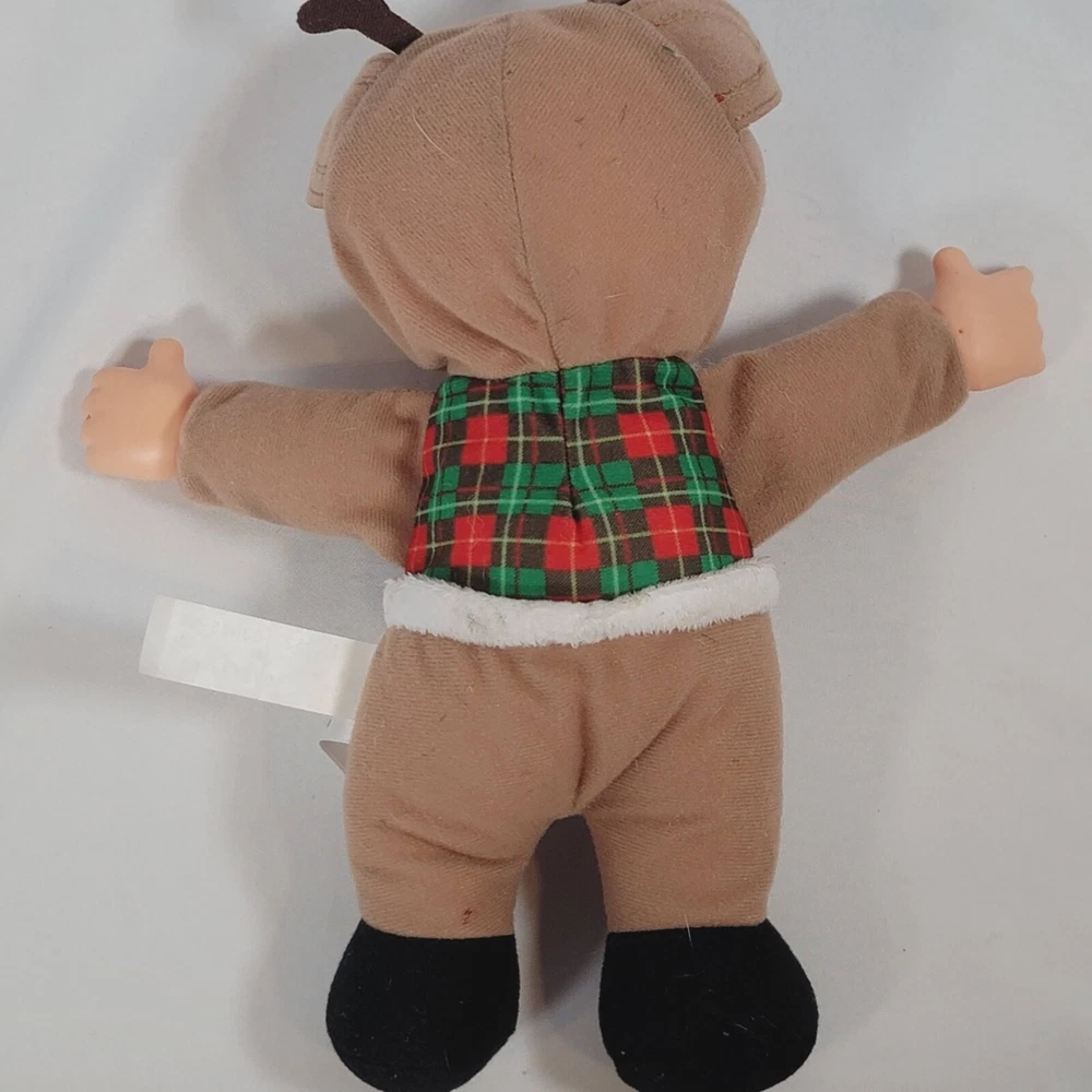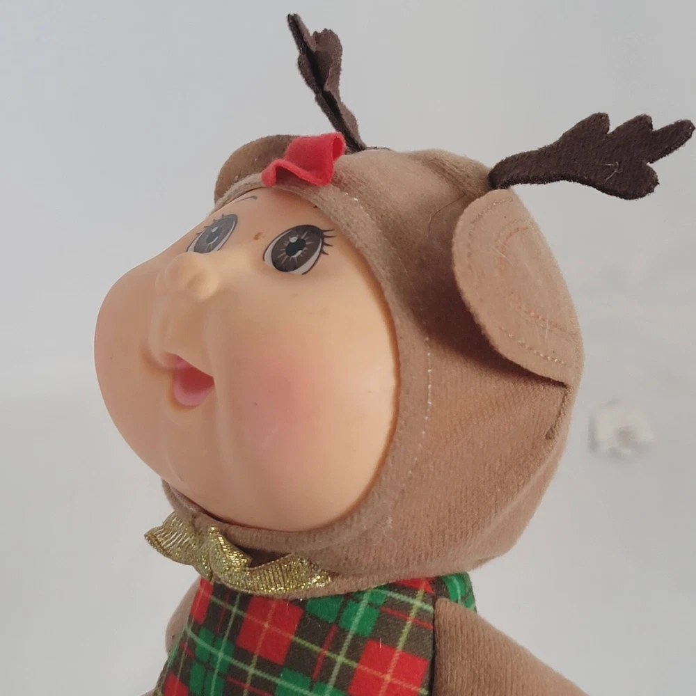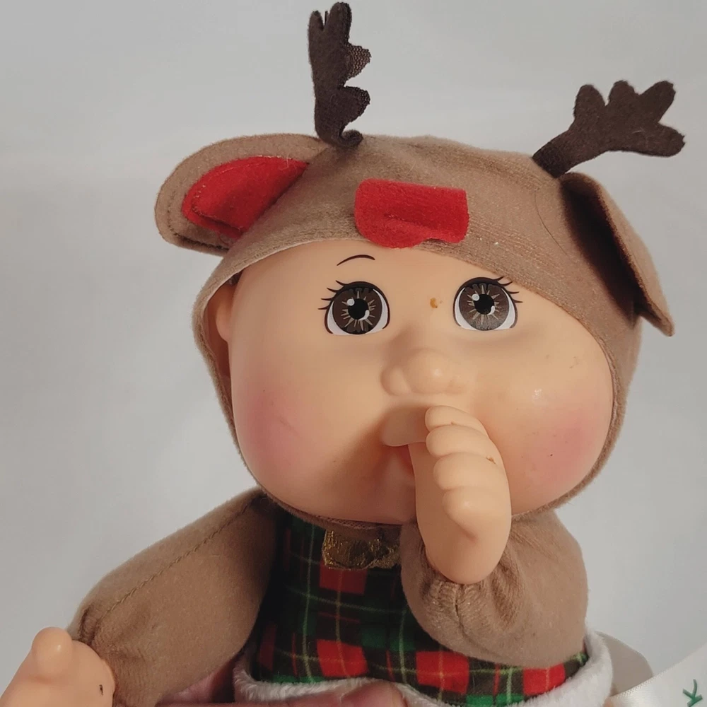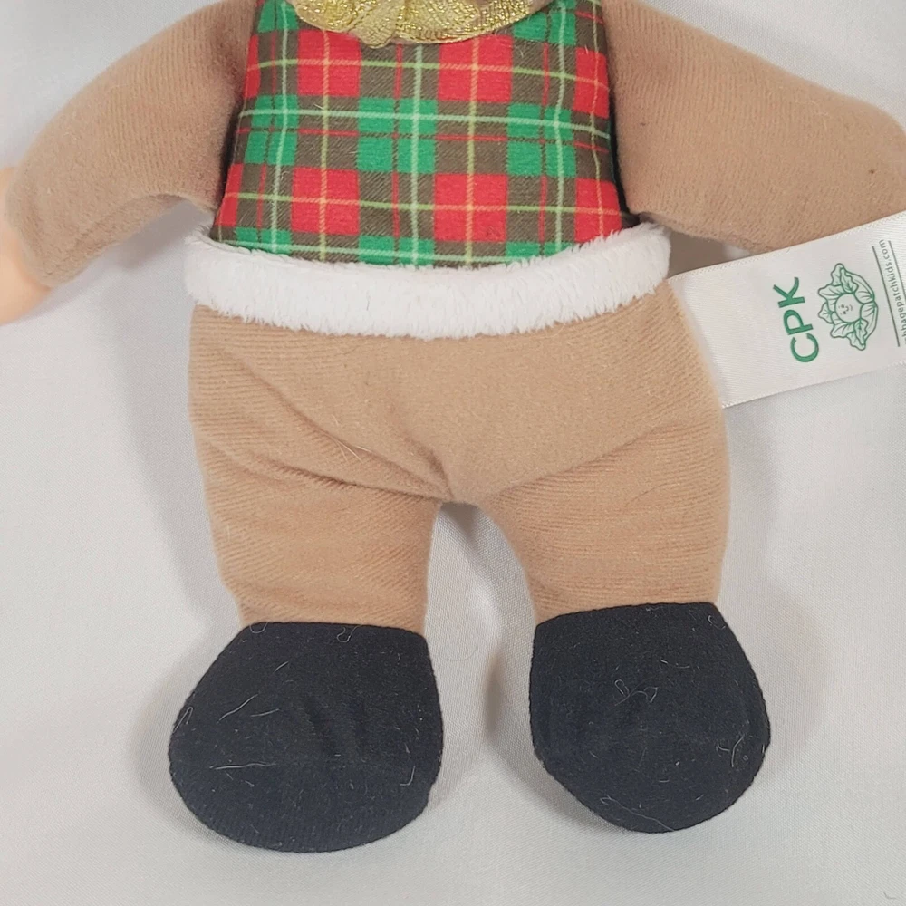 CPK Cabbage Patch Kids Holiday Helpers Tink Reindeer Christmas Plush Boy Doll - Light Skin, Bald, Brown Eyes. About 9" long, with a vinyl head and hands, cloth body, non-removable clothes (though his hat does come off; it stays attached to his outfit). He can suck his thumb. In played with, vintage condition. He's a bit dirty, some smudges/shine marks on his face from play. Outfit is in pretty good shape, may have some minor pilling. But he's cute and ready for lots more loving! Please see all pictures for exact cosmetic condition and other details, as they are part of the description as well, and ask any questions before purchasing. We are a husband and wife team with a growing family, and greatly appreciate your support of our small business. Please browse our eBay store for a variety of other Cabbage Patch items. We hope you enjoy this doll!