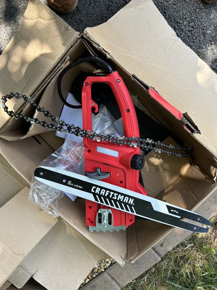 New in open box, please see photos never assembled The CRAFTSMAN Electric Chainsaw is a powerful 16-inch corded electric chainsaw with a 12 Amp motor, designed for easy and efficient cutting. It features a built-in oil window and tool-free chain tensioning for convenient maintenance. This chainsaw is lightweight at 6.19 lbs and has a low kickback feature for added safety. With a 3.5 HP engine and 44.0 chain speed, it is capable of handling various cutting tasks with ease. The Craftsman Electric Chainsaw is a reliable tool for any outdoor job, featuring a durable plastic and metal construction in a vibrant red color.