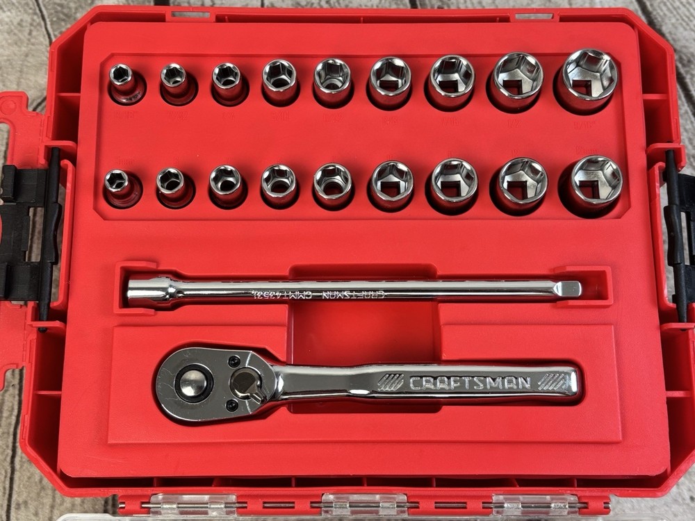 CRAFTSMAN VERSASTACK 20pc SAE & Metric Socket Set Ratchet Extension Case •Brand: Craftsman •Model: VersaStack 20-Piece Mechanics Tool Set •Includes: Ratchet, extension bar, SAE & metric sockets •Drive Size: 1/4” drive •Socket Sizes (SAE): 3/16”, 7/32”, 1/4”, 5/16”, 11/32”, 3/8”, 7/16”, 1/2”, 9/16” •Socket Sizes (Metric): 5mm, 6mm, 7mm, 8mm, 9mm, 10mm, 11mm, 12mm, 13mm •Condition: Excellent condition- never used •Storage: VersaStack locking clear lid case with handle •Features: Compact and portable—ideal for on-the-go repairs Ships securely with care—perfect addition to any toolbox or garage.