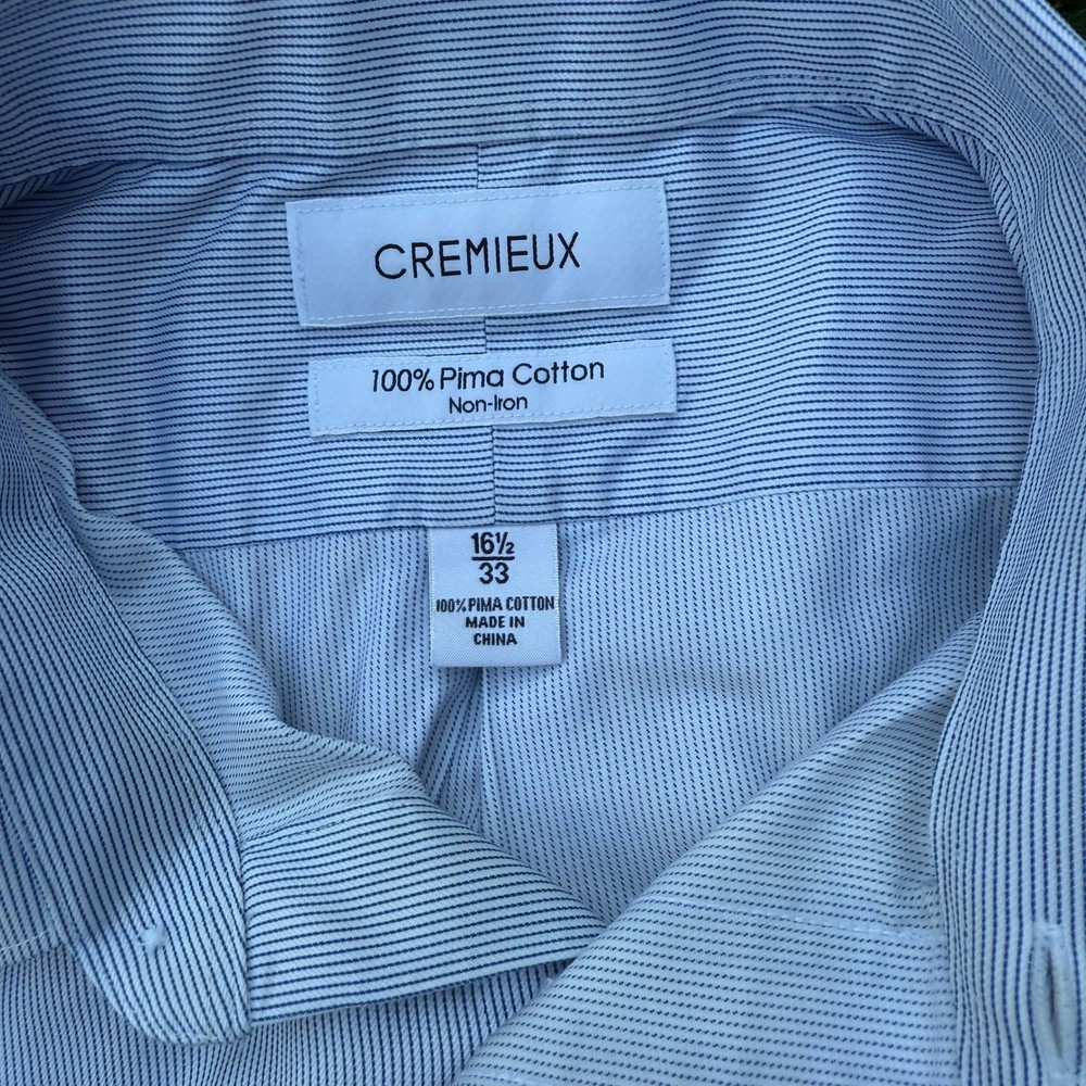 CREMIEUX men's long sleeve button down dress shirt crafted from 100% Pima Cotton. This non-iron shirt features a classic blue stripe pattern, a single chest pocket, and button cuffs. The fabric offers a smooth feel and is designed for easy care, making it a reliable choice for any wardrobe. The button-down collar provides a polished finish. Department: Men Neck Size: 16.5 in Fit: Regular Sleeve Length: Long Sleeve Type: Dress Shirt Pattern: Striped Collar Style: Point Material: 100% Cotton Top Cuff Style: Barrel Cuff Features: Non-Iron, Pockets Neckline: Collared Closure: Button Fabric Type: Woven Accents: Button, Logo Occasion: Business, Workwear, Casual Keywords: mens dress shirt, cremieux shirt, non iron shirt, pima cotton, blue stripe, button down, collared shirt, long sleeve, menswear, business casual, professional attire, classic fit Item is preowned, effort has been made to ensure all flaws are displayed photos serve as additional description Sizing varies by manufacturer and time period, please see measurements.