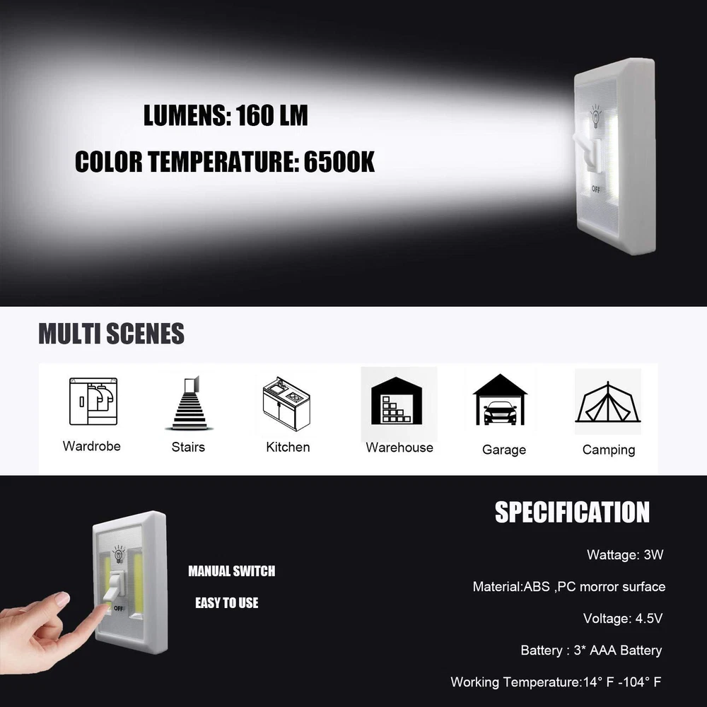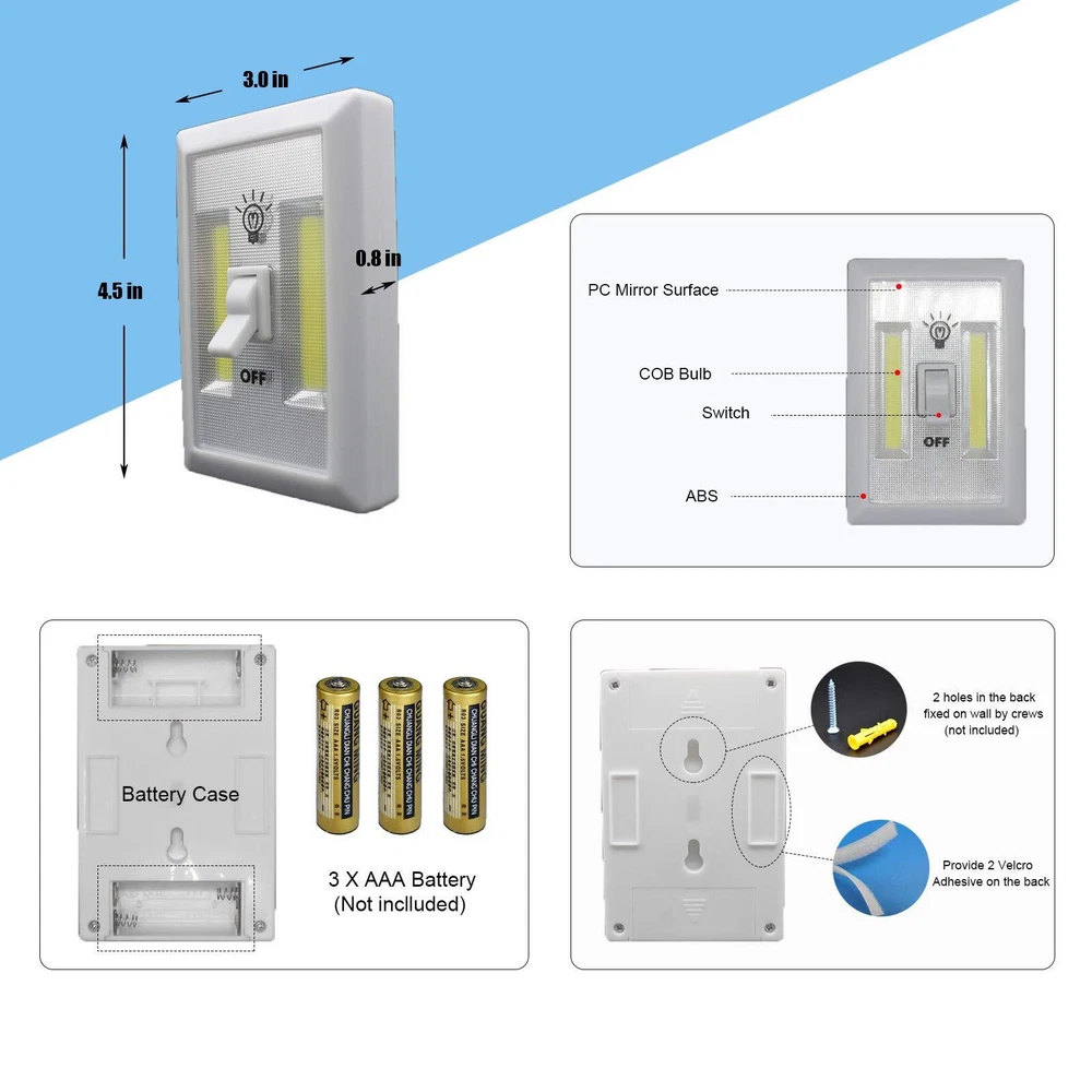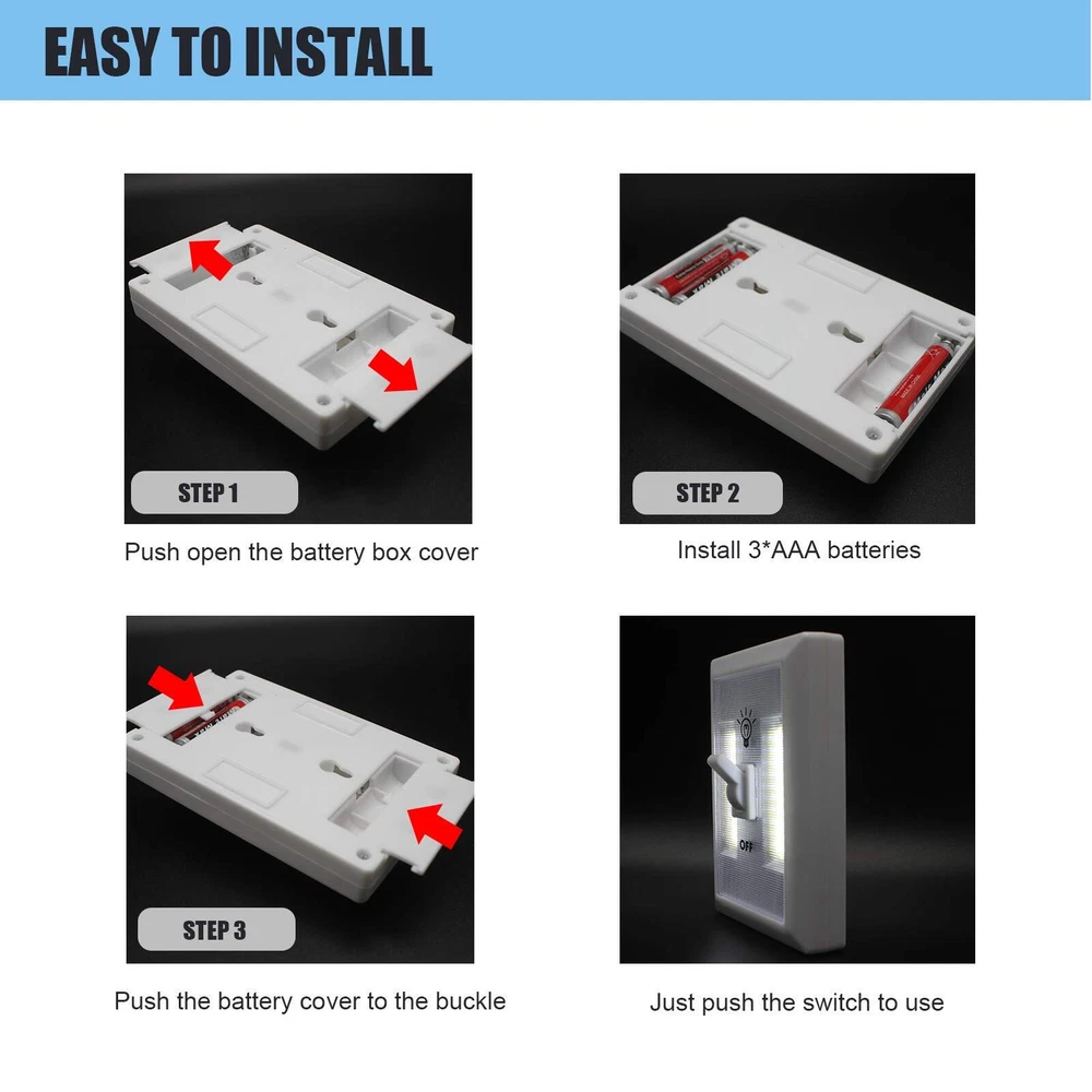 【PRACTICALITY】CREVIV battery switch lights work anywhere that needs lighting in a short time, especially where there are no wires and regular lighting switches are needed. 【EASY TO INSTALL】: CREVIV closet switch light has two hook installation holes and two magic tapes, which can be easily installed and disassembled without drilling holes in the furniture, meeting the needs of short-term or long-term use. 【MULTI-PURPOSE】 CREVIV battery lights can be used as closet lights, bookshelf lights, shelf lights, installed in kitchen closets, bookshelves, stairs, basements, shelves, garages, camping tents to achieve rapid lighting effects. 【NO WIRING REQUIRED】: Battery powered ,use 3* AAA batteries, install and use at any time, no wiring required. 【SPECIAL NOTE】: Considering the transportation and storage, we cannot provide the battery. You need to buy it yourself. The magic tape is included in the battery box. I hope you can quickly use this product.