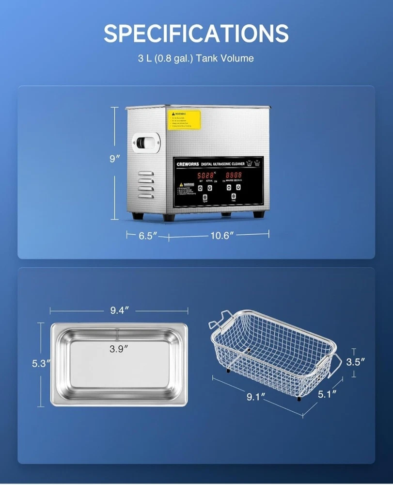 CREWORKS 3L Ultrasonic Cleaner, 0.8 gal Digital Sonic Cavitation Machine, 120W Stainless Steel Professional Jewelry Cleaner for Cleaning Tool Watch Glasses Retainer Denture Parts with Heater & Timer #36.6.25