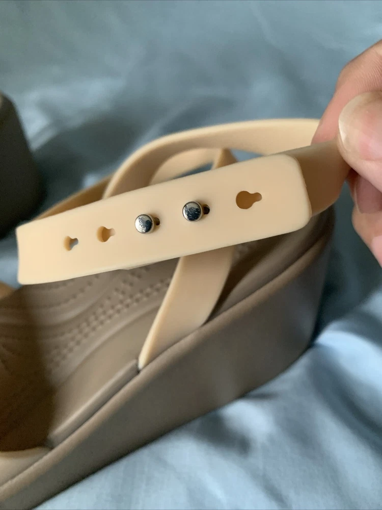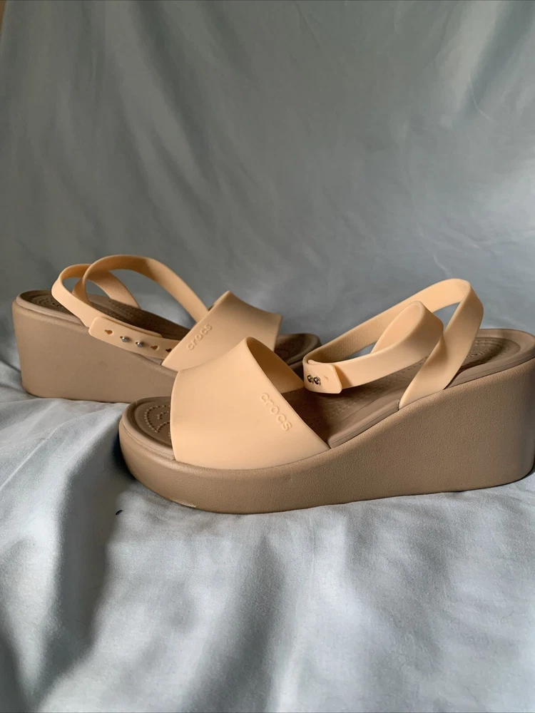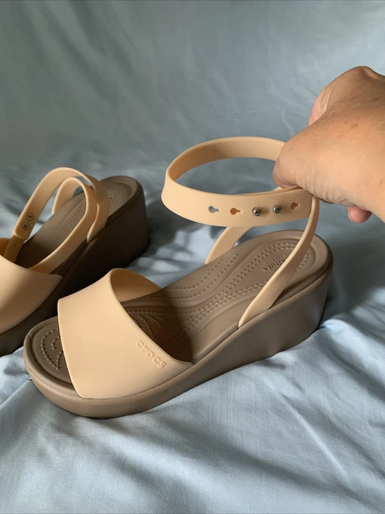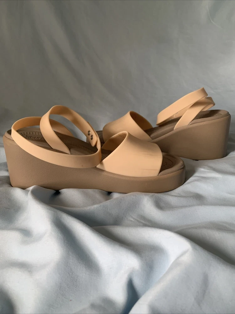 Elevate your casual look with these stylish Crocs Brooklyn ankle strap wedge sandals in nude/shitake. The slip-on design and solid pattern make them perfect for any casual occasion, while the flat heel ensures comfort all day long. The ankle strap adds a touch of sophistication and the synthetic material provides durability for the summer and spring season. These sandals feature a rubber upper material and synthetic lining and insole material. The outsole is also made of synthetic material. The Crocs Brooklyn Wedge model is a perfect addition to any woman's shoe collection. Get your hands on these sandals today and make your casual outings more stylish! Bought brand new and worn 2 times for a wedding rehearsal and the wedding.