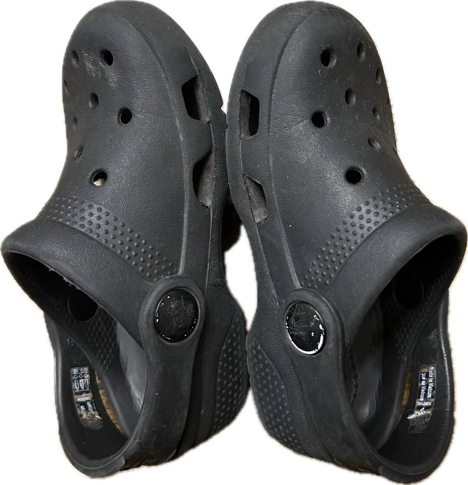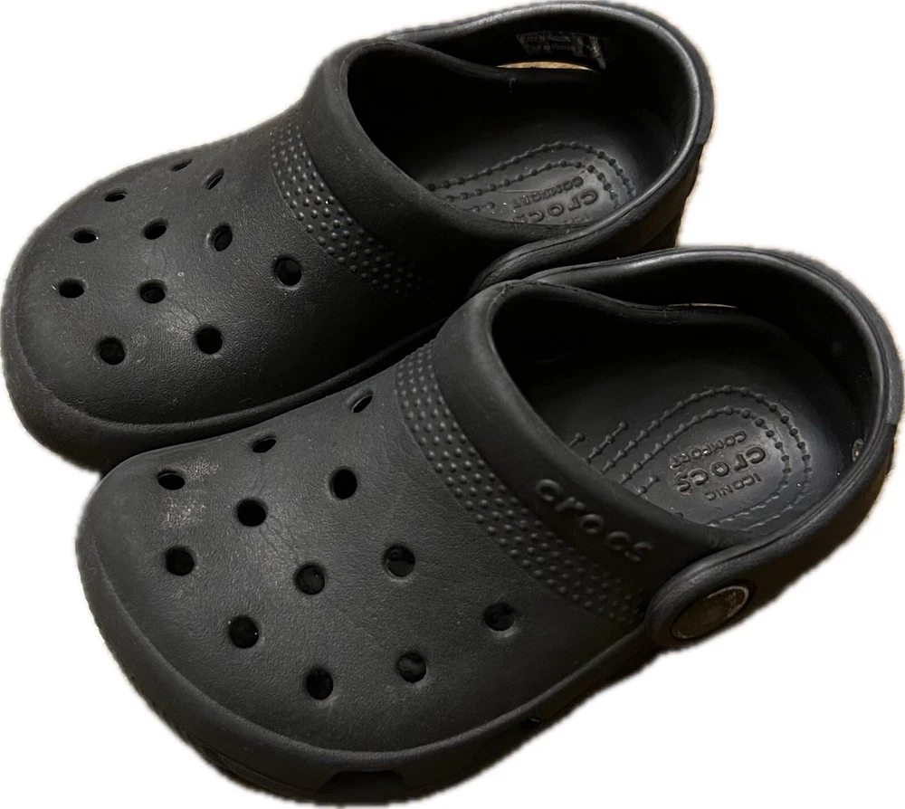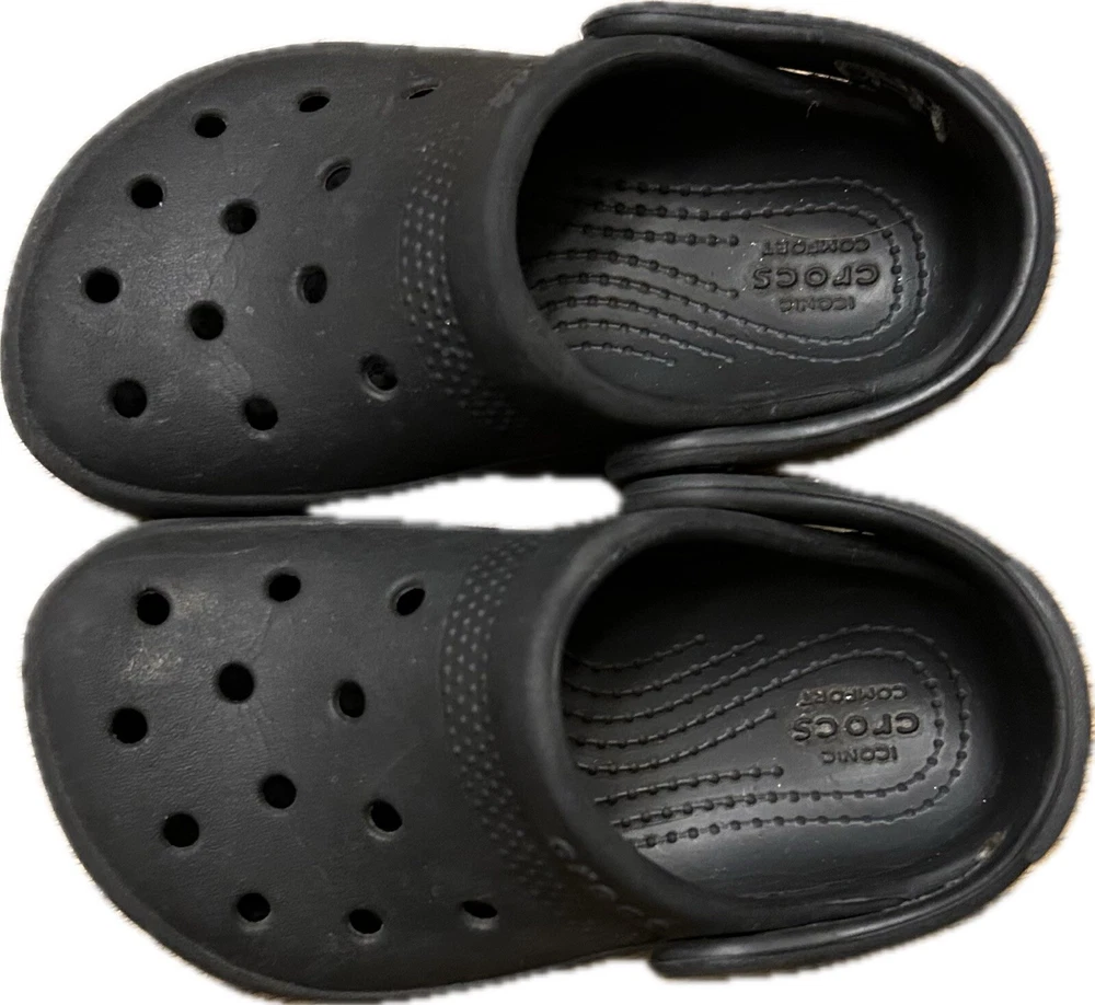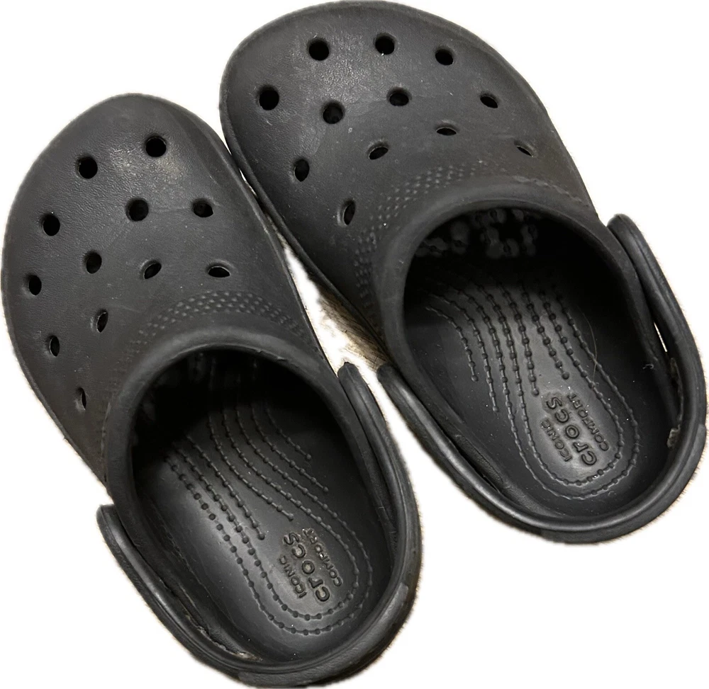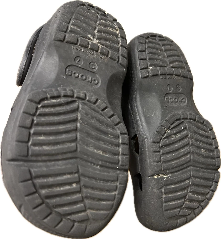 Upper Material: Rubber Style: Clog Type: Sandal Vintage: No US Shoe Size (Youth): C7 Heel Height: Flat (Under 1 in) Cleat Type: Rubber Closure: Slip On Color: Black Shoe Shaft Style: Low Top Brand: Crocs US Shoe Size: 7 Performance/Activity: Beach, Walking, Water Sports, Potty Training Shoe Width: Standard Theme: Classic Features: Ankle Strap, Breathable, Comfort, Waterproof, Water Resistant Outsole Material: Synthetic Product Line: Classic Crocs Department: Unisex Kids Character: Boy Fabric Type: None Pattern: Solid