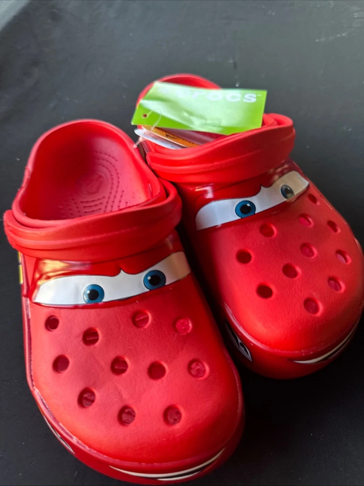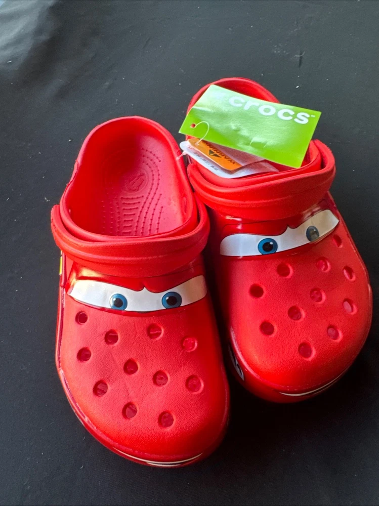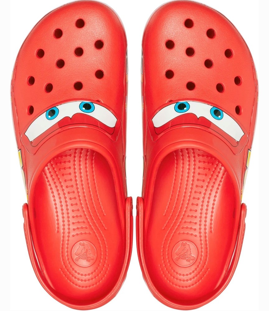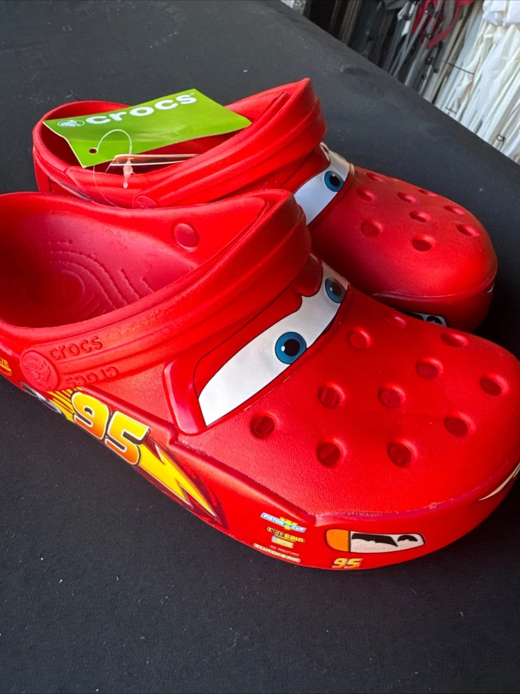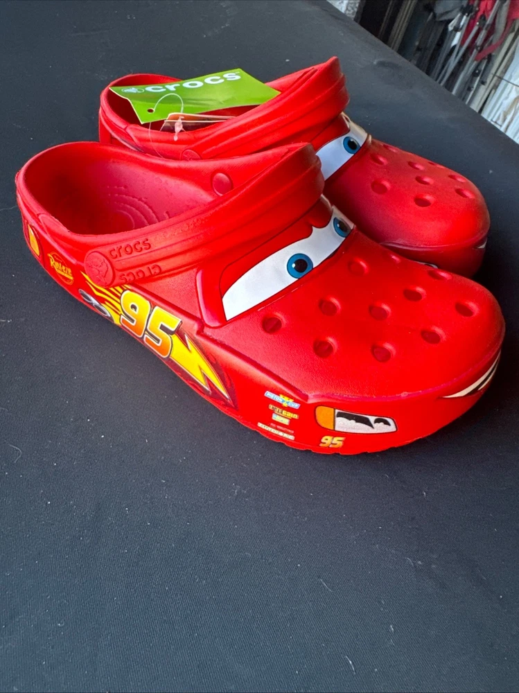 The product is a Lightning McQueen limited edition Crocs sandals, perfect for fans of the Cars movie. These red slip-on sandals feature the iconic Lightning McQueen logo as accents, making them a stylish choice for casual occasions. With a rubber outsole and insole, these Crocs are comfortable for all-day wear during the summer, fall, and spring seasons. Fast shipping ensures that you can enjoy these unique and collectible sandals in no time. NOTE NO LIGHT UP.