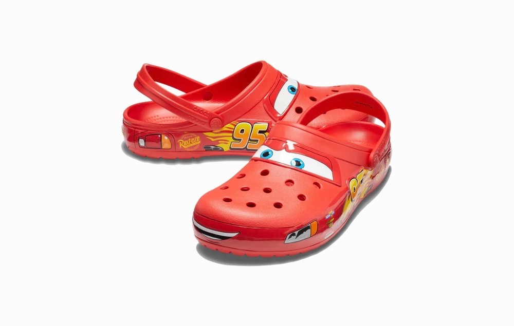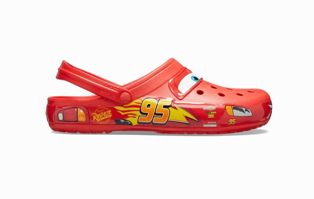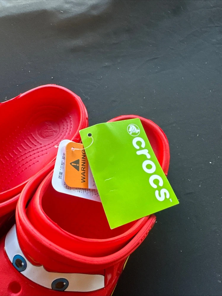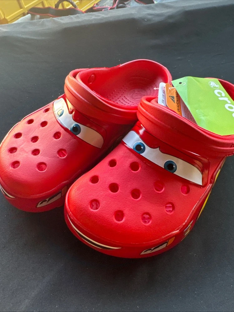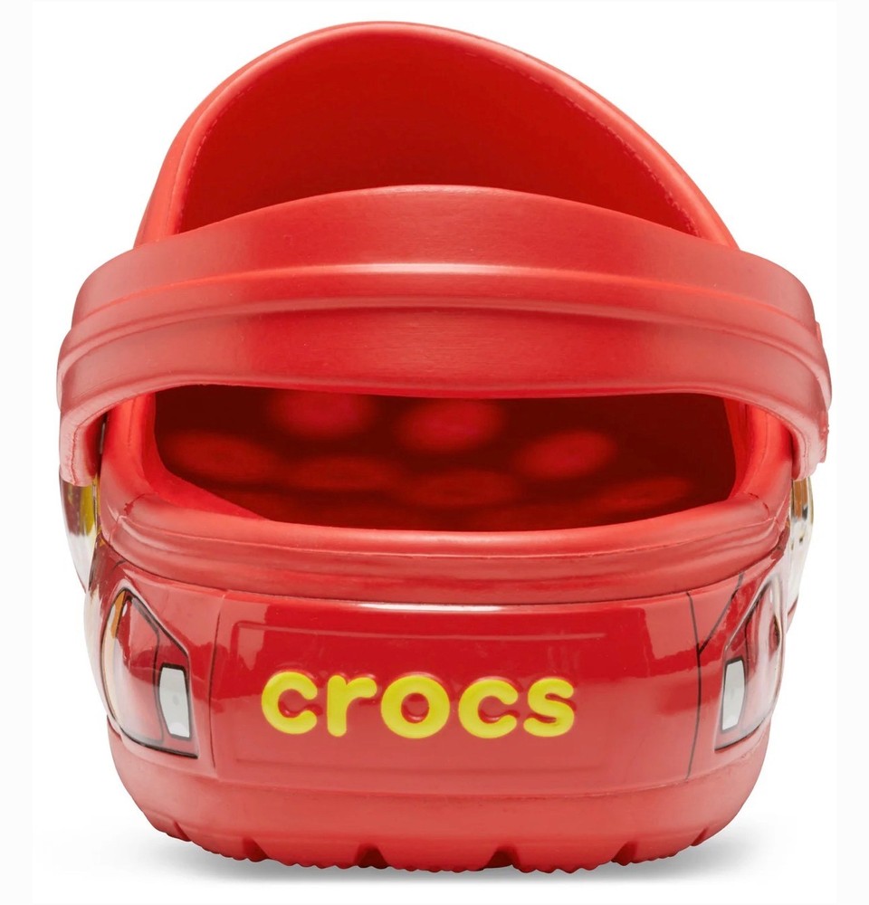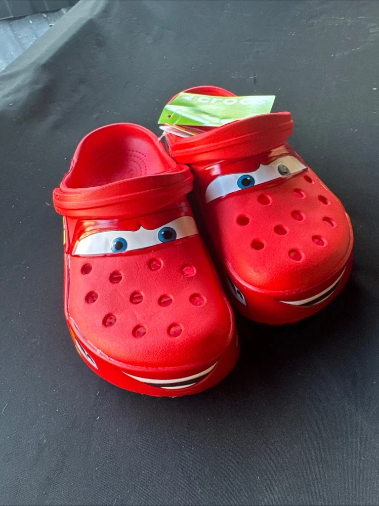 The product is a Lightning McQueen limited edition Crocs sandals, perfect for fans of the Cars movie. These red slip-on sandals feature the iconic Lightning McQueen logo as accents, making them a stylish choice for casual occasions. With a rubber outsole and insole, these Crocs are comfortable for all-day wear during the summer, fall, and spring seasons. Fast shipping ensures that you can enjoy these unique and collectible sandals in no time. NOTE NO LIGHT UP.