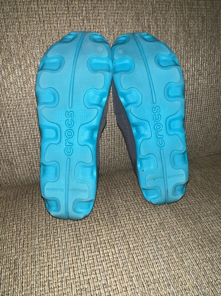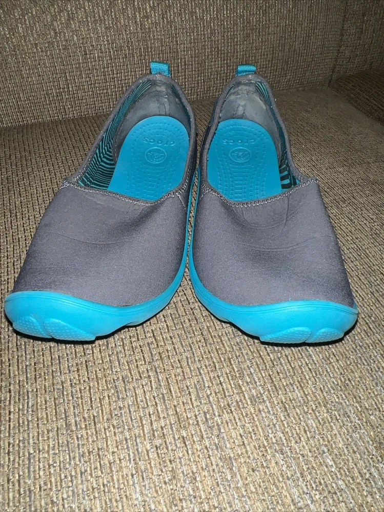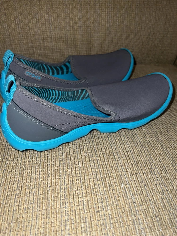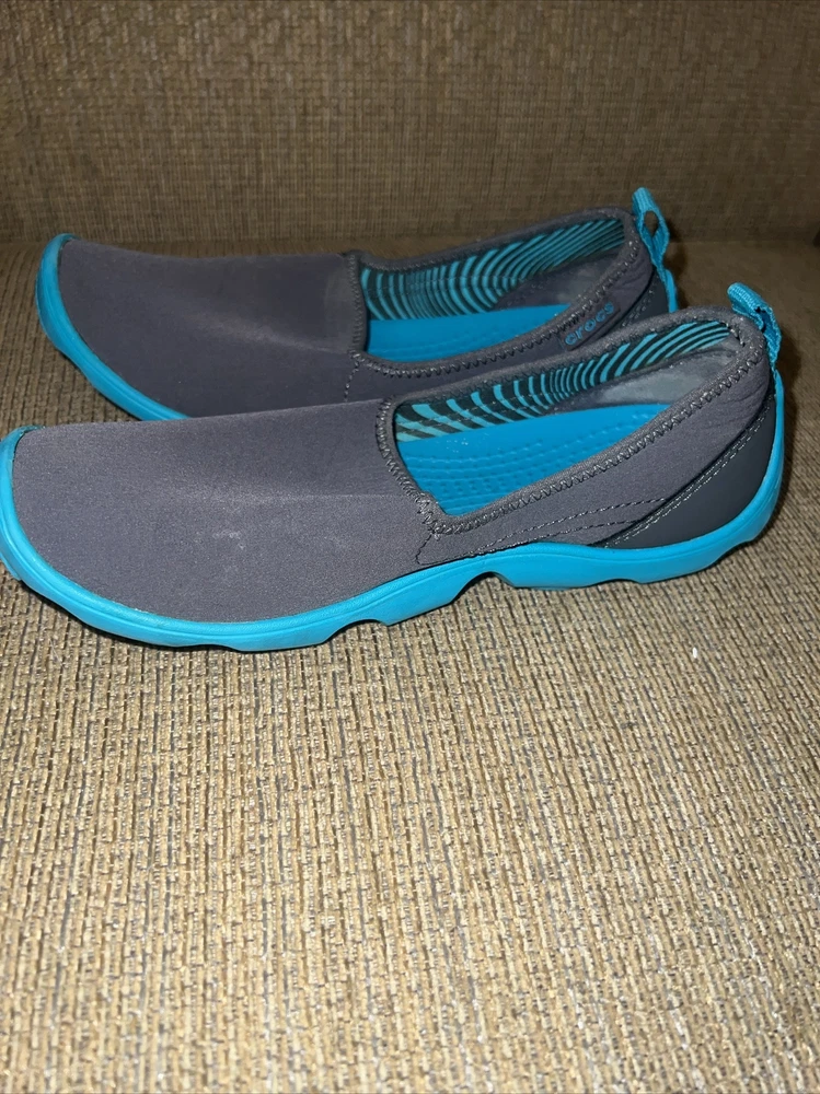 CROCS-Busy Day-Stretch Fabric Slip On Flats-Gray/Turquoise-Size 6. EUC!!