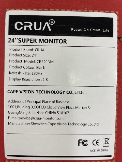 CRUA 24” Curved Gaming Monitor – Model CR240DM Upgrade your gaming and work setup with the CRUA 24-inch Curved Gaming Monitor, designed to deliver smooth performance and an immersive viewing experience. With a high 180Hz refresh rate and 1ms response time, this monitor is ideal for fast-paced gaming, esports, and everyday use. The Full HD 1920×1080 resolution combined with a curved LCD panel provides clear visuals, deeper contrast, and reduced eye strain for long sessions. 🔧 Key Features • Brand: CRUA • Model: CR240DM • Screen Size: 24 inches • Display Type: Curved LCD • Resolution: Full HD 1920 x 1080 (1K) • Aspect Ratio: 16:9 • Refresh Rate: 180Hz • Response Time: 1ms • Brightness: 250 cd/m² • Contrast Ratio: 3000:1 • Color: Black 🎮 Perfect For • PC & Console Gaming • Esports and Competitive Play • Home Office & Everyday Use 📌 Additional Information • Sleek, modern design with thin bezels • Smooth and fluid visuals for gaming • Easy setup and user-friendly controls